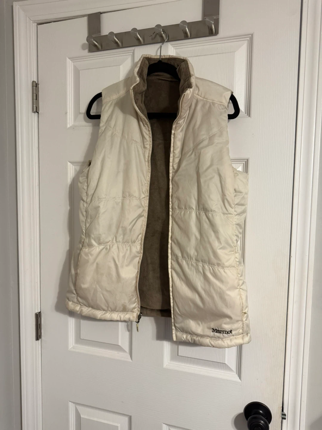 Selling a Marmot reversible puffer vest! It's a light cream color on one side and brown on the other, so it's like getting two vests in one. Great for layering or wearing on its own during milder weather.