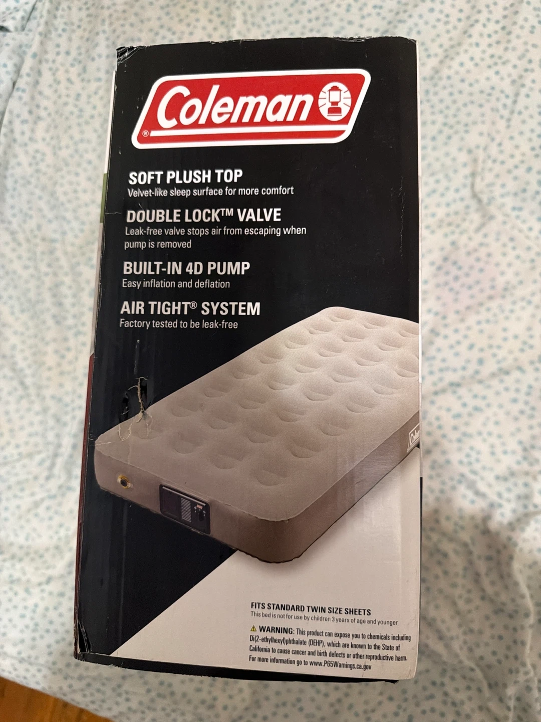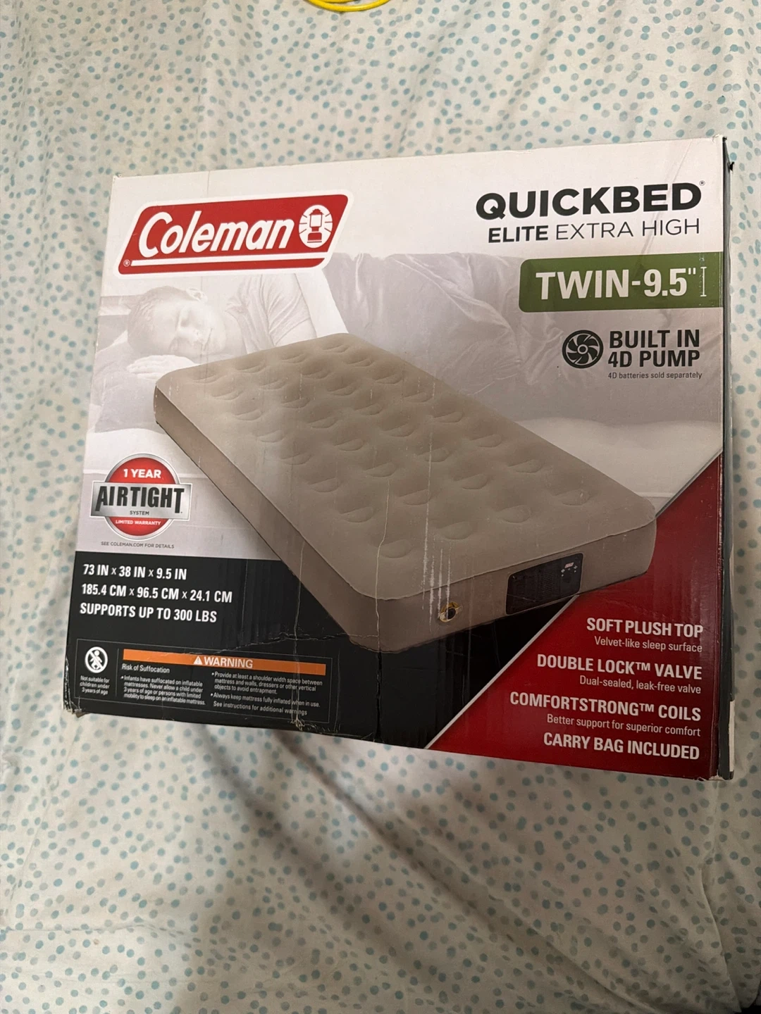 Coleman Quickbed Elite Extra High Twin air mattress with a soft plush top. It features a Double Lock valve and a built-in 4D pump for easy inflation and deflation. Factory tested for leak-free performance. Dimensions: 73 x 39 x 9.5 inches.