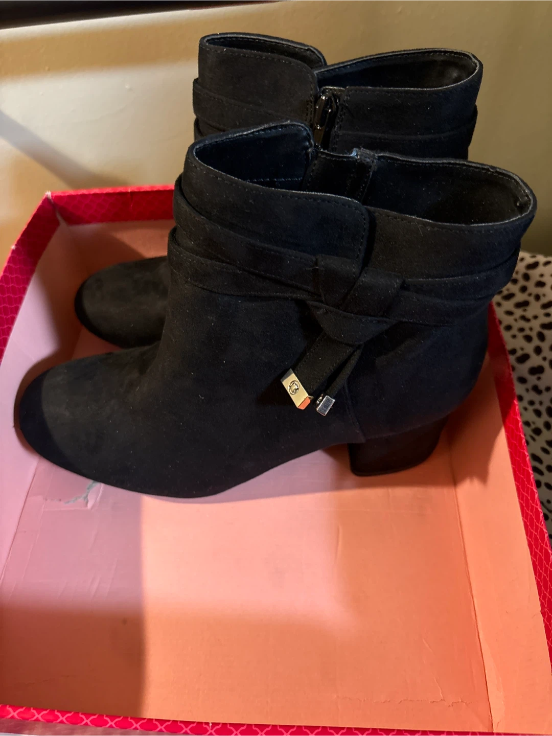 Black suede ankle boots with a side zipper and decorative bow accent. The boots have a block heel and a comfortable fit. They're ready for any outfit!