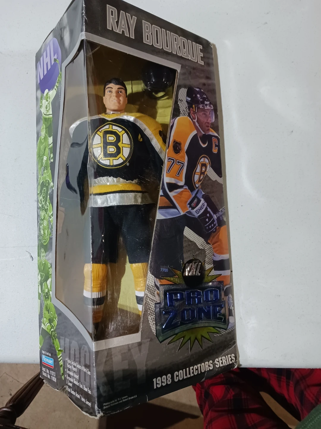 This is a 1998 Collectors Series action figure of Ray Bourque. It includes a removable helmet. Ages 8 and up. Playmates brand.