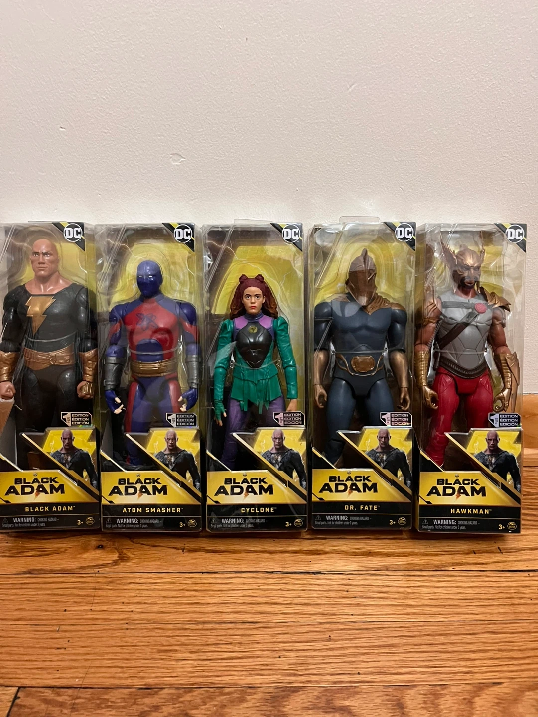 Selling a set of DC Black Adam action figures. The set includes Black Adam, Atom Smasher, Cyclone, Dr. Fate, and Hawkman. Each figure is still in its original packaging.