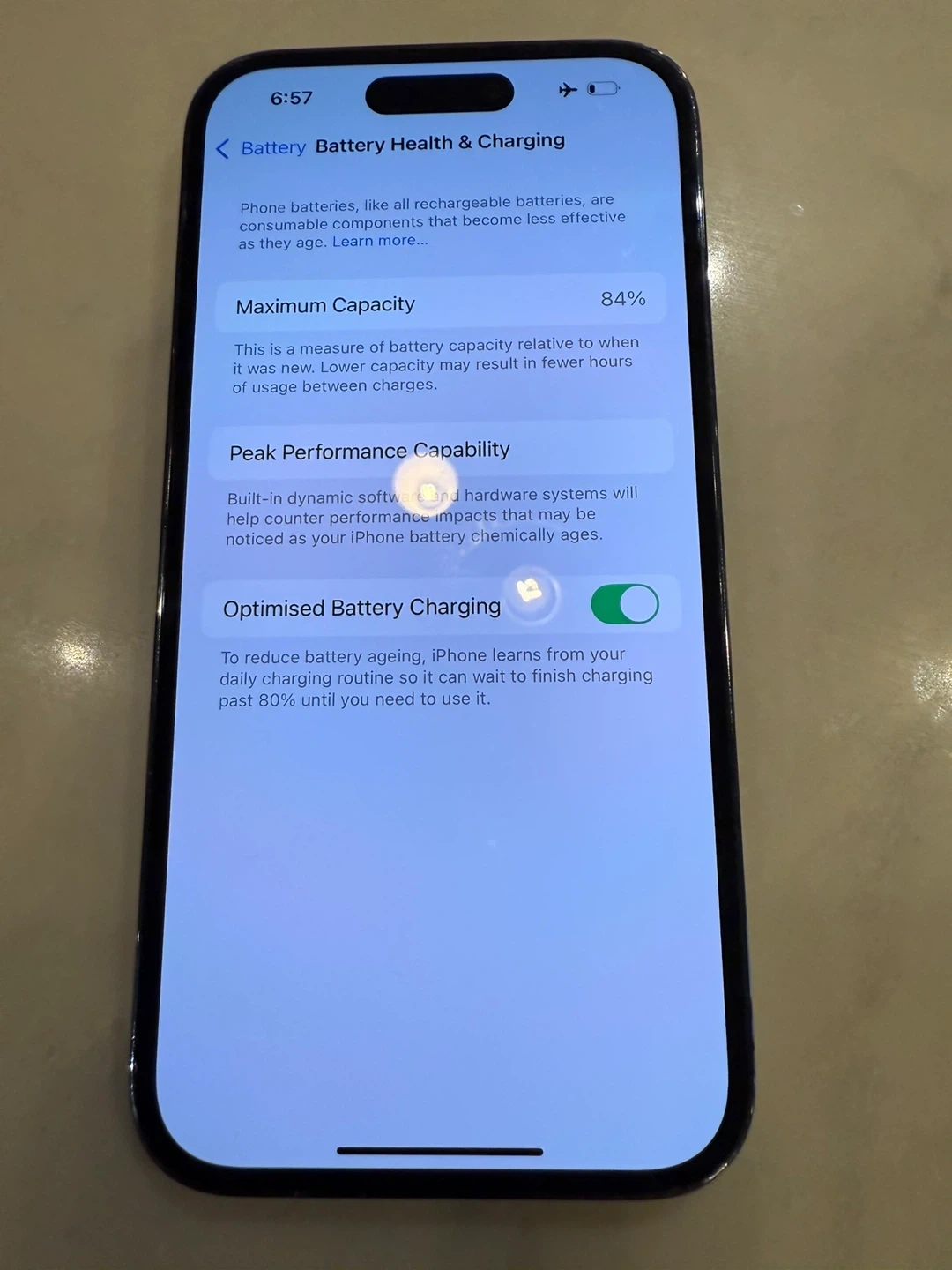This is an Apple iPhone 14 Pro with 128GB storage. It's in a deep purple color. The battery's maximum capacity is 84%. Excellent condition