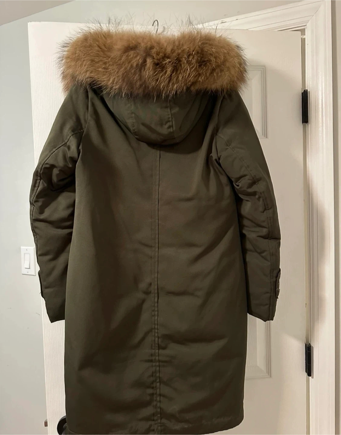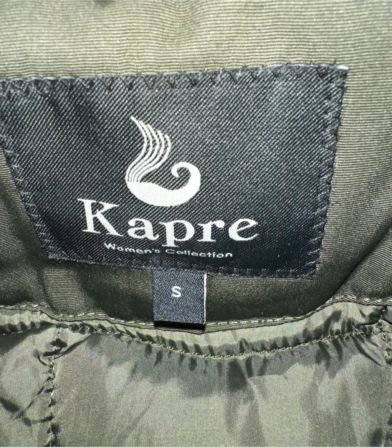 This olive green parka coat from Kapre's Women's Collection features a faux fur-trimmed hood. Shell and lining are 100% polyester. It's a size small. Stay warm and stylish this winter!