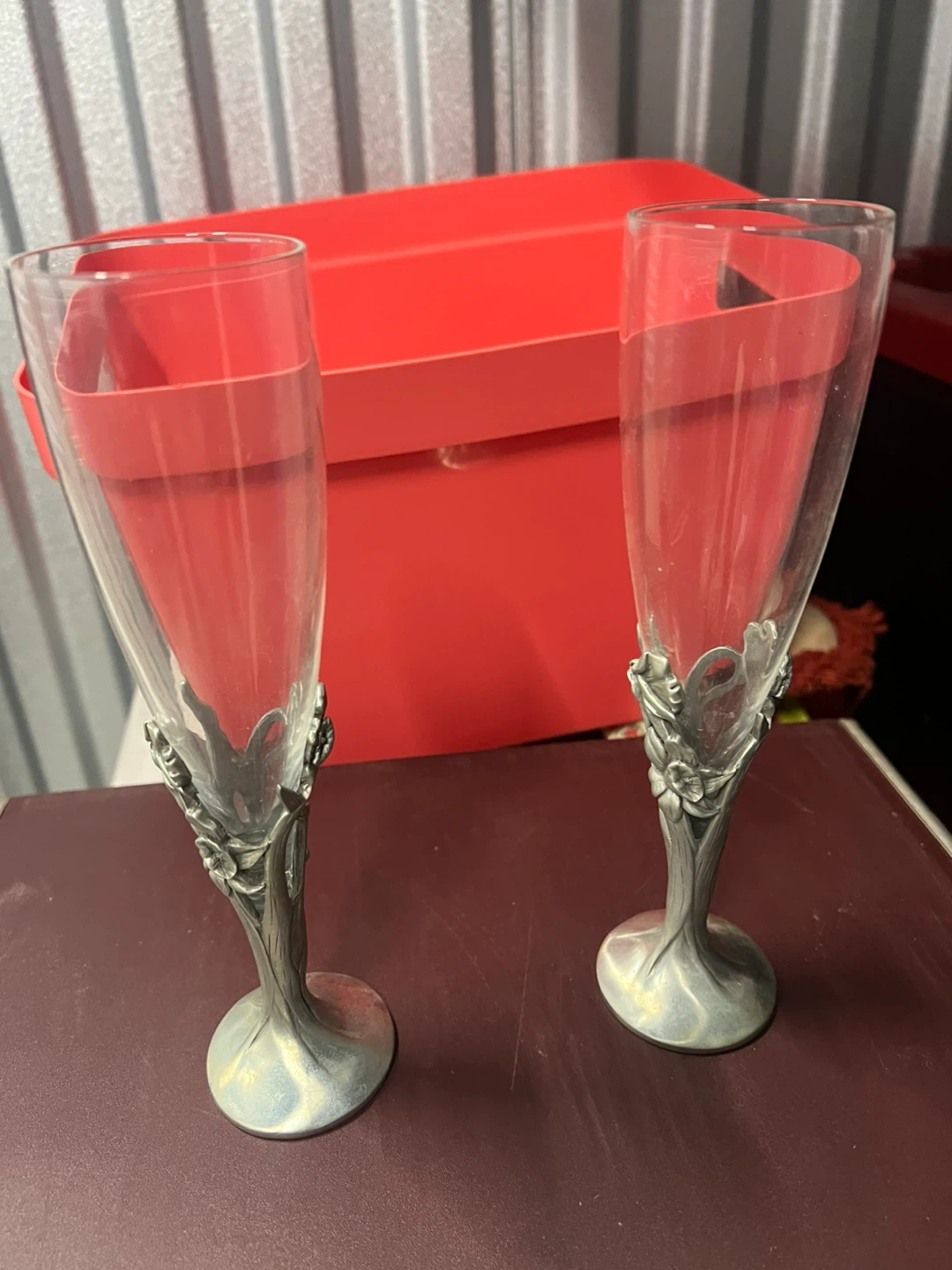Two elegant champagne flutes with decorative metal stems. Features a floral and branch motif in an art nouveau style. Glass construction with pewter-tone metal base and stem. Perfect for special occasions or as a unique decorative item! pewter