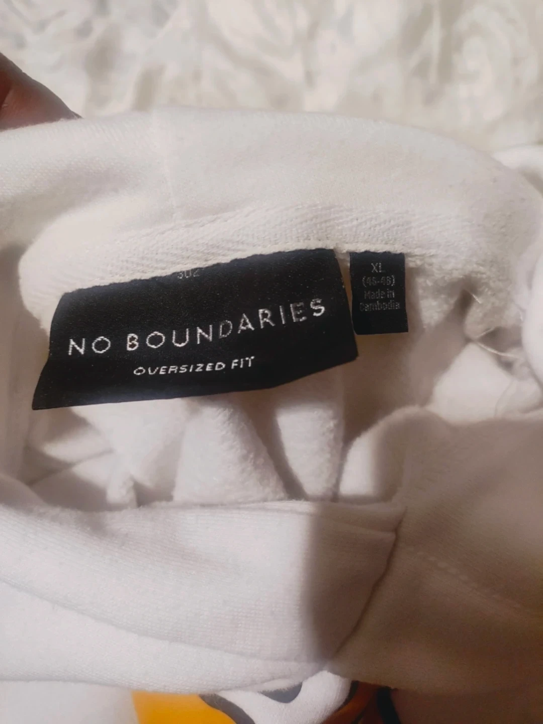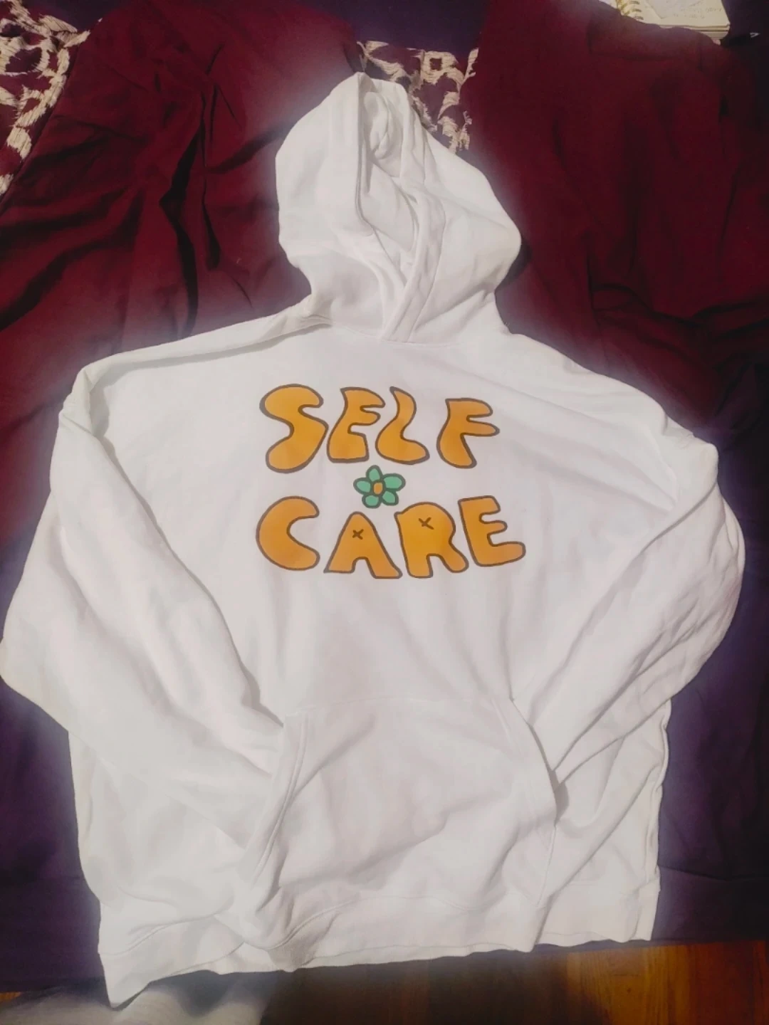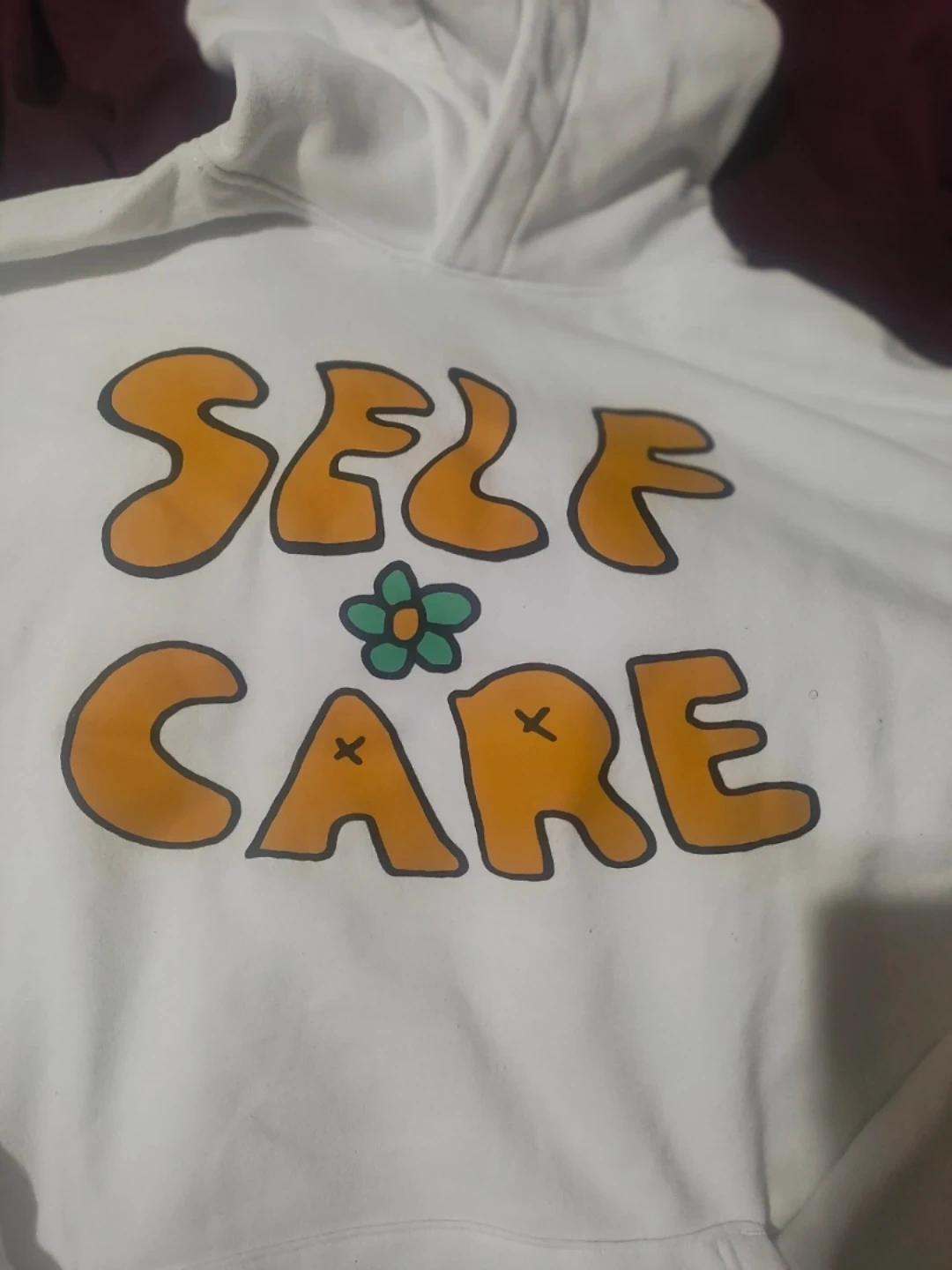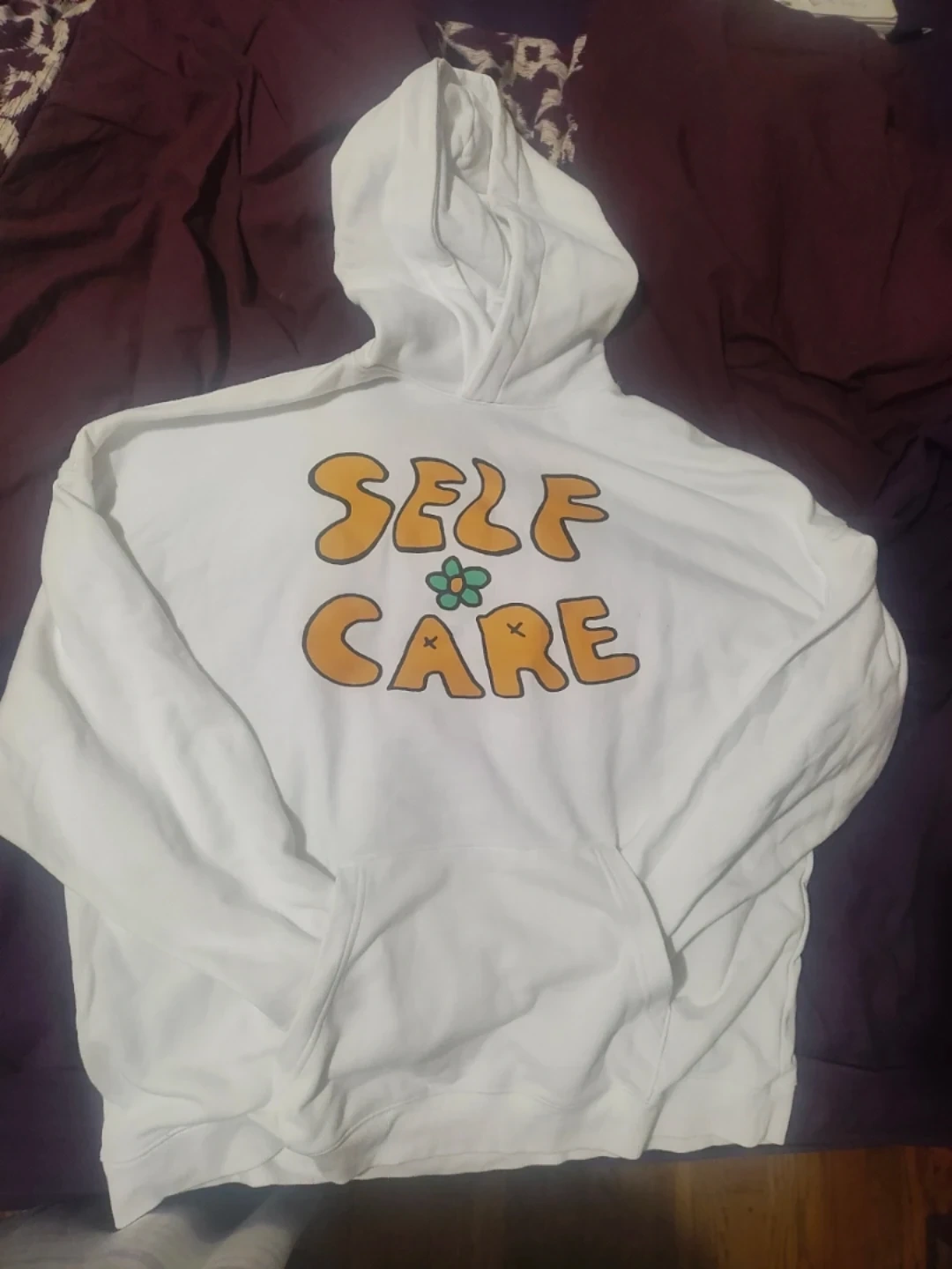 No boundaries White hoodie with "Self Care" graphic print. Includes a front pouch pocket. Cotton blend material.