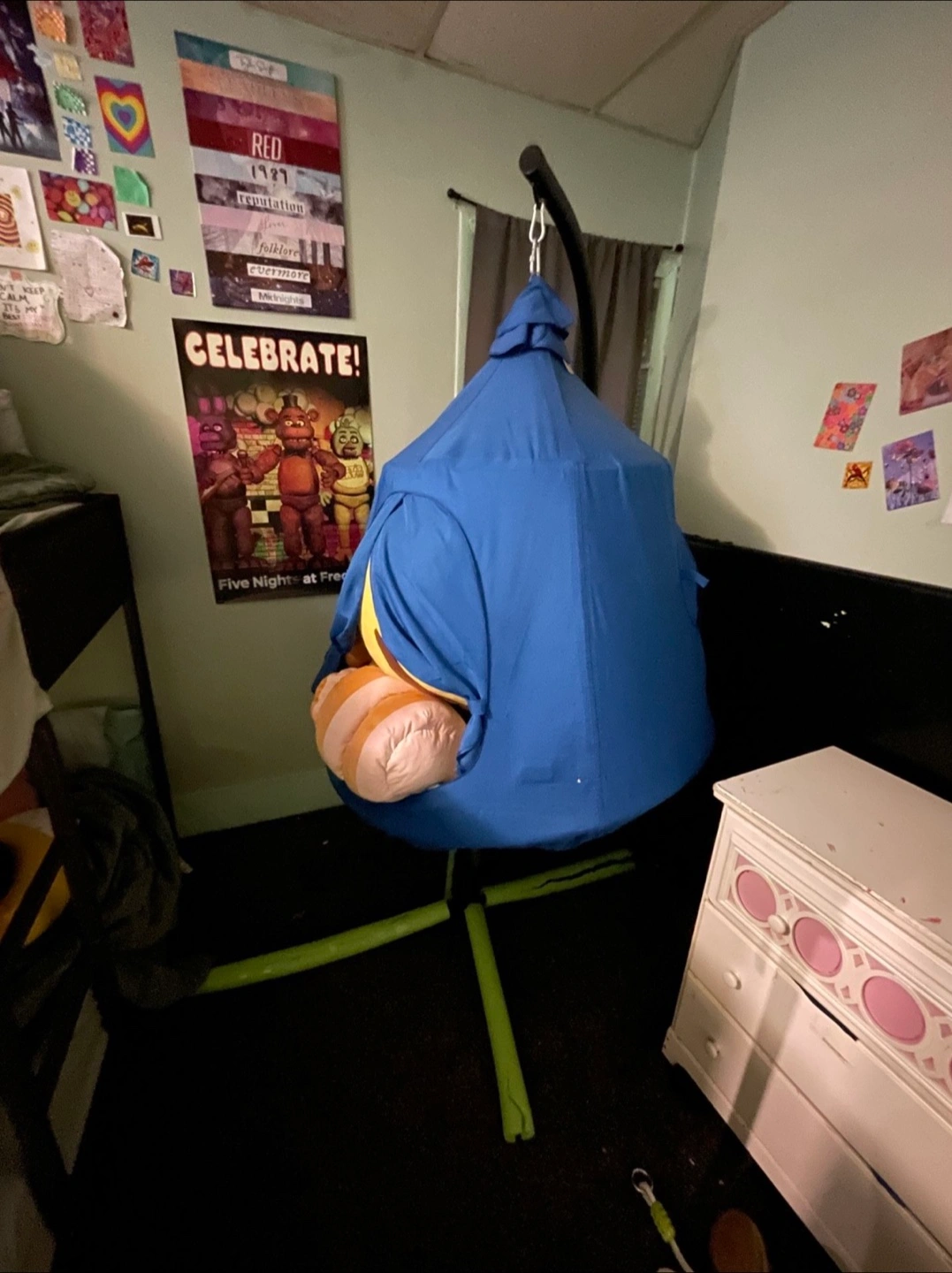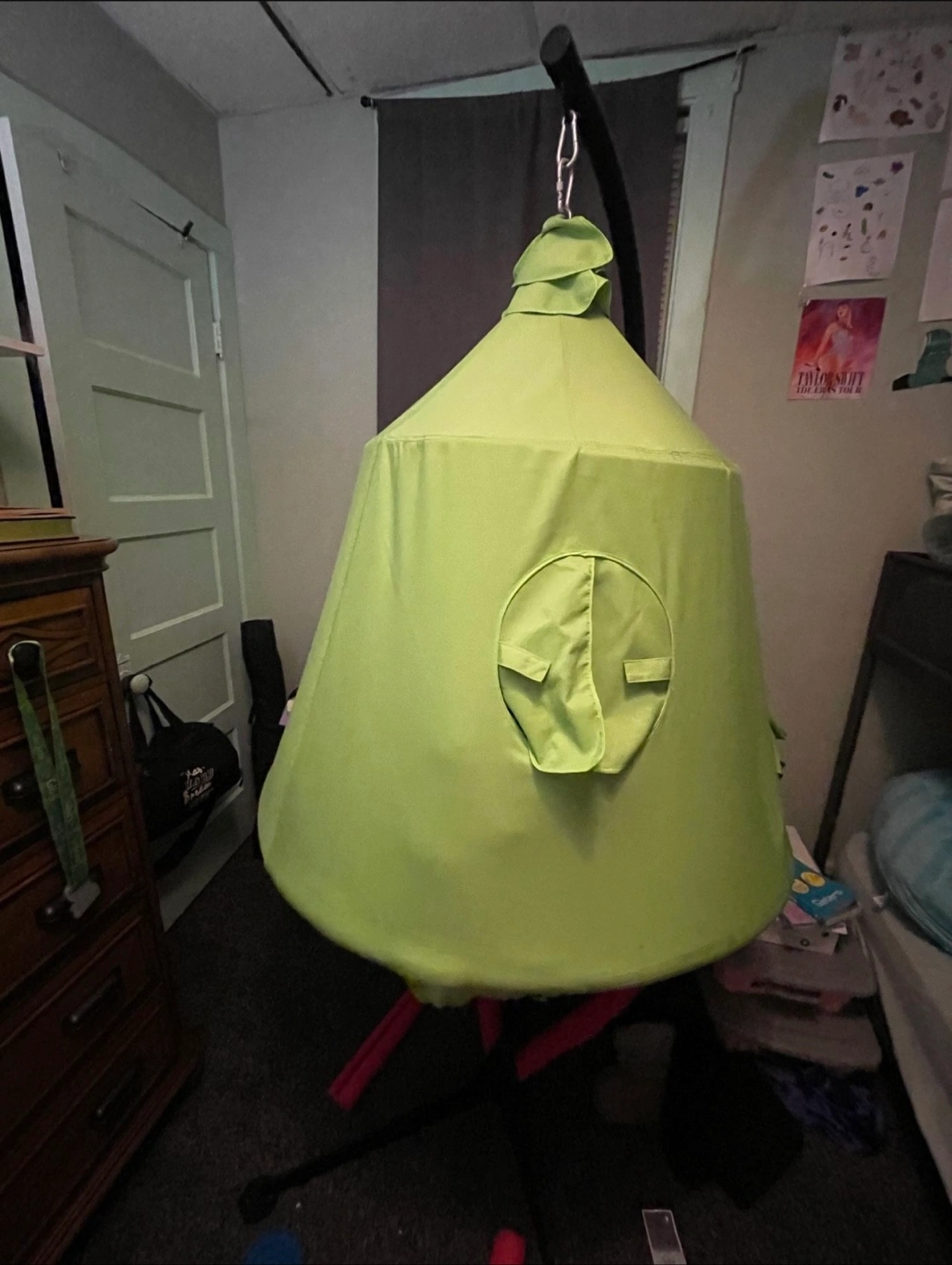 This hanging pod swing chair is perfect for indoor or outdoor use! It's great for kids to relax, read, or play in. The chair is made of durable fabric and has a sturdy frame. It's in good condition and ready for a new home