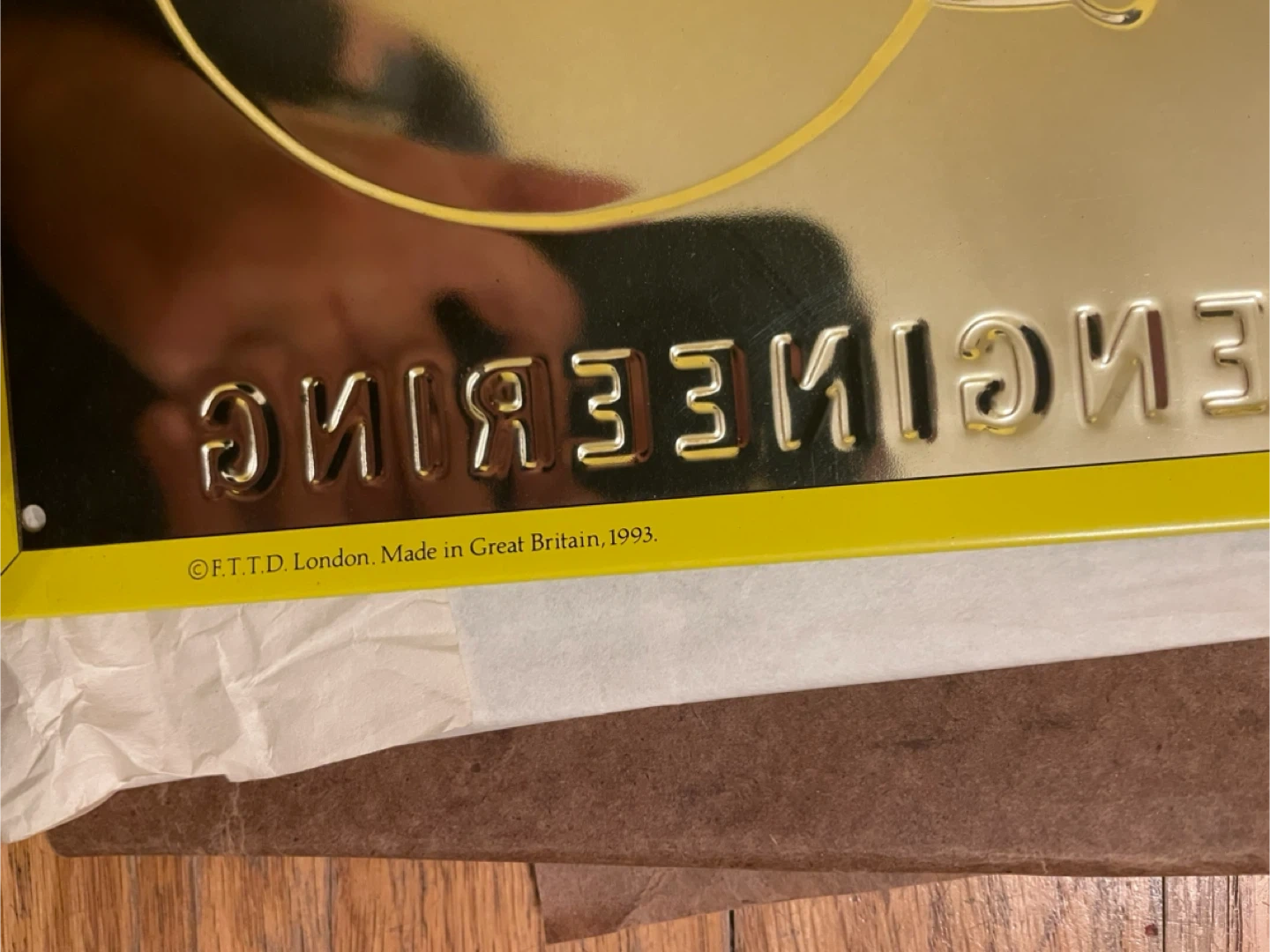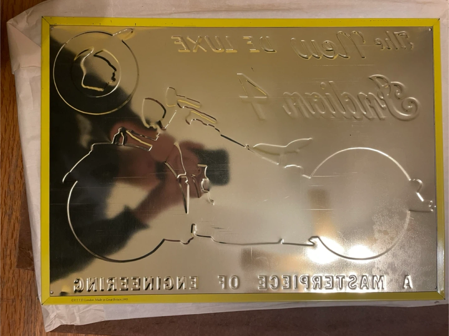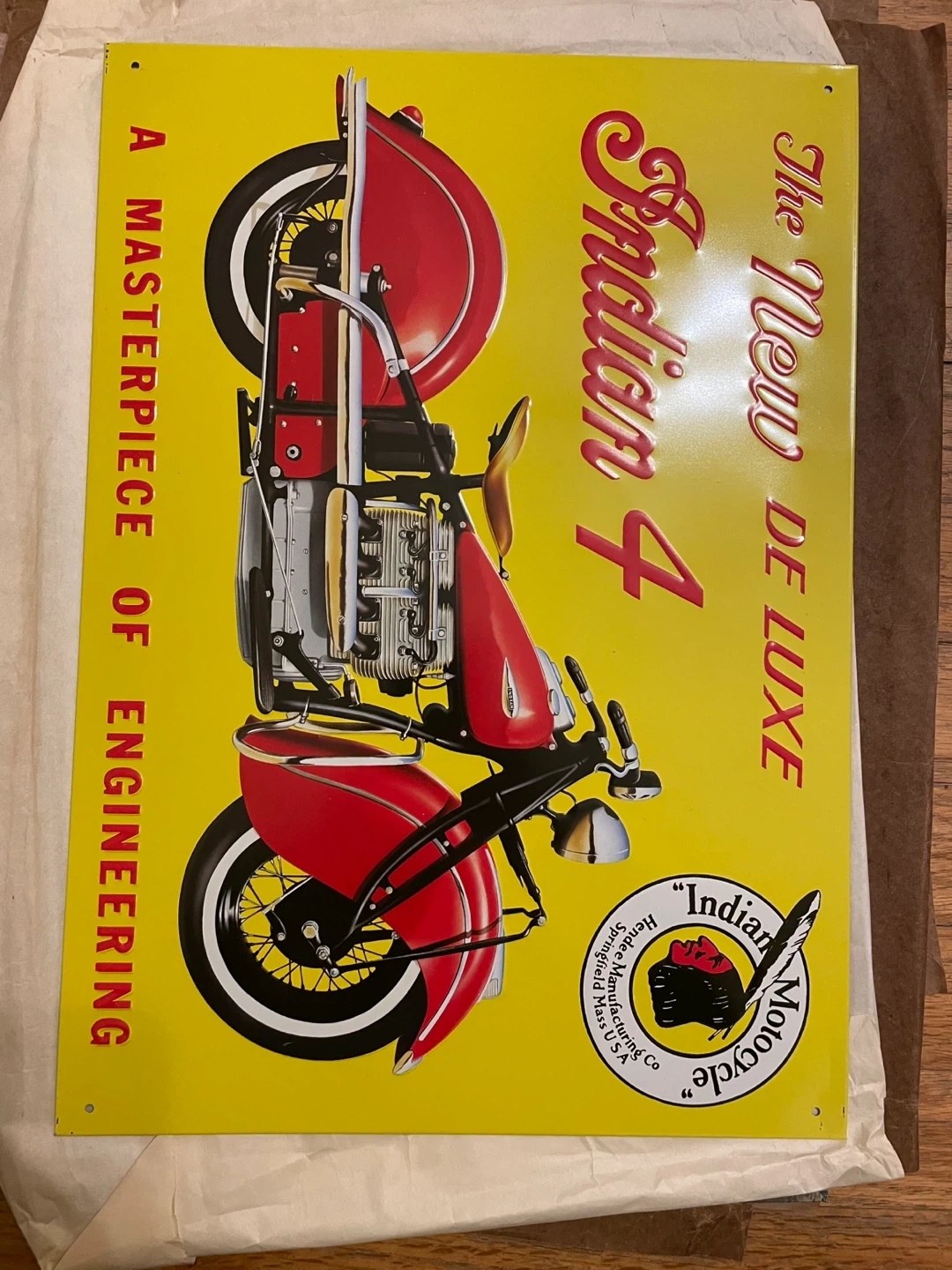 Selling a vintage-style metal sign featuring an Indian 4 De Luxe motorcycle! It's a cool piece of engineering art with a yellow background and red accents. The sign is marked as 'F.T.D. London, Made in Great Britain, 1993'.