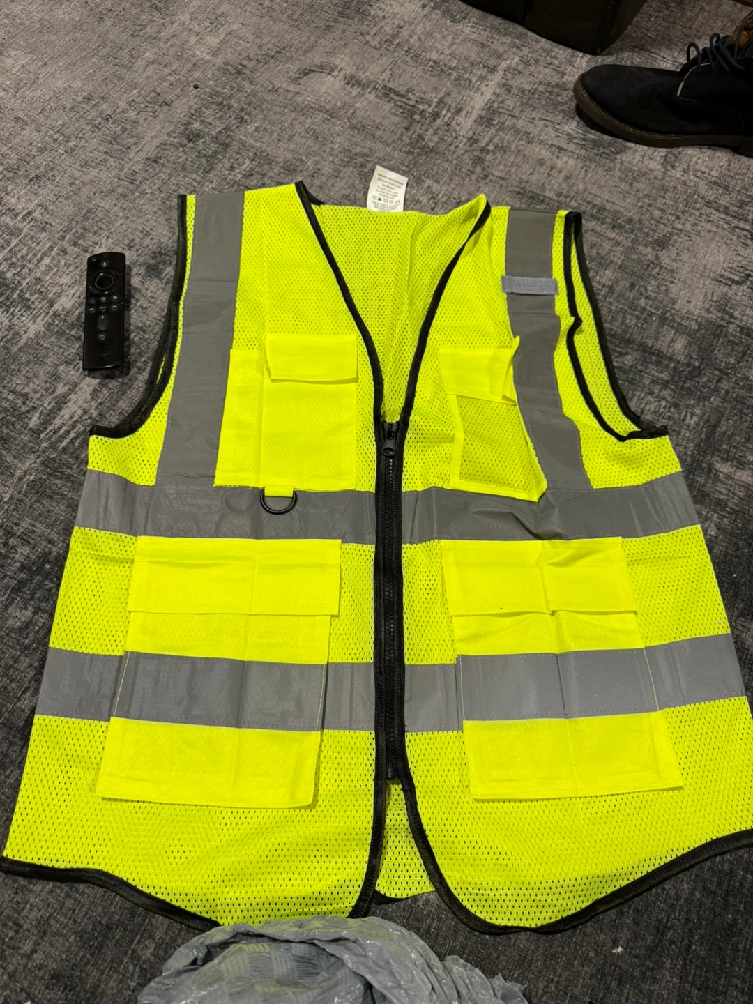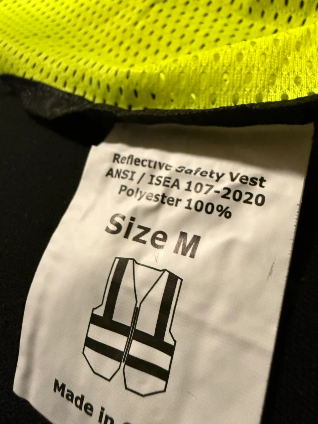 Selling a reflective safety vest in size M. It's made of 100% polyester and is ANSI/ISEA 107-2020 compliant. Great for staying visible and safe!