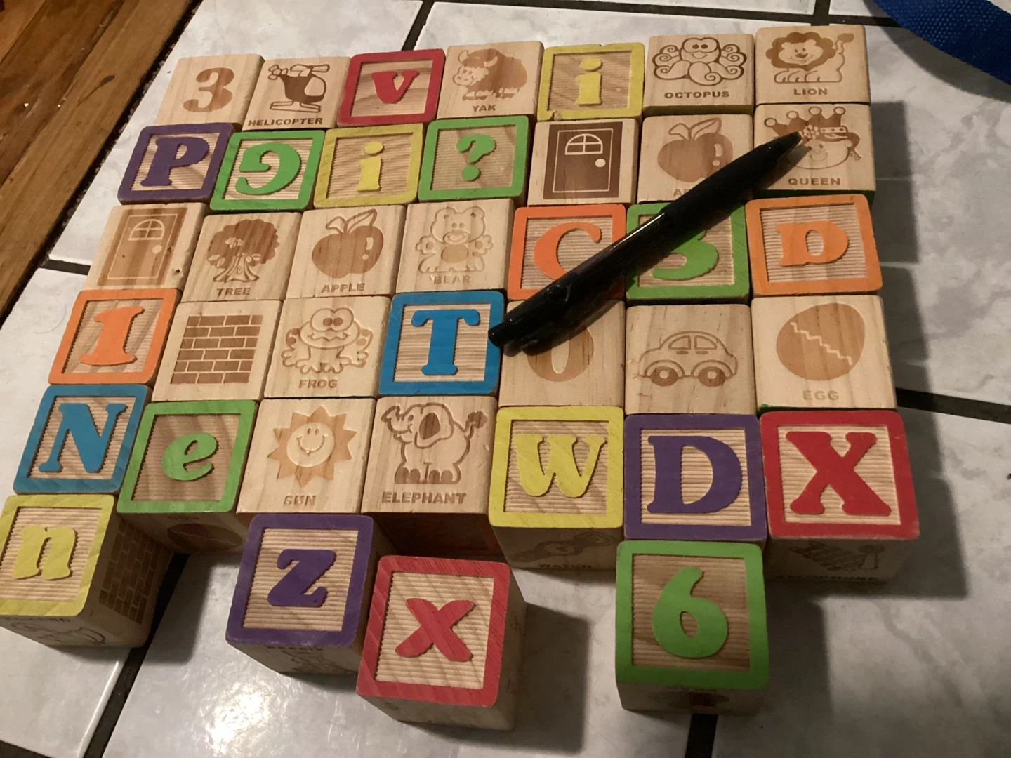 Wooden alphabet blocks featuring letters, numbers, and pictures. Each block has a unique image and letter or number. Includes 'A' for Apple, 'B' for Bear, 'C' for Car, 'D' for Door, 'E' for Egg, 'F' for Frog, 'G' for Gum, 'H' for Helicopter, 'I' for Ice Cream, 'L' for Lion, 'N' for Nest, 'O' for Octopus, 'Q' for Queen, 'S' for Sun, 'T' for Tree, 'V' for Volcano, 'W' for Whale, 'X' for Xylophone, 'Y' for Yak, and 'Z' for Zebra. Also includes numbers 3 and 6. Great for early learning!
