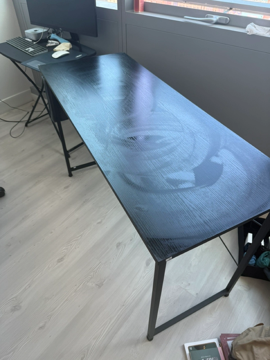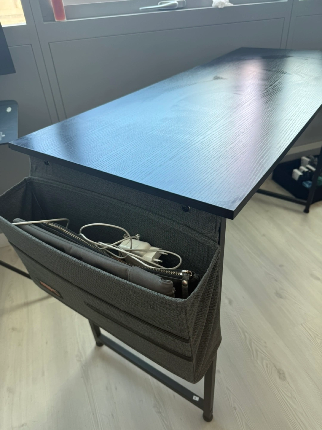 This Odk computer desk is perfect for your home office setup! It features a sleek black finish and a convenient storage bag on the side to keep your essentials organized.