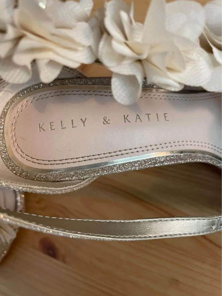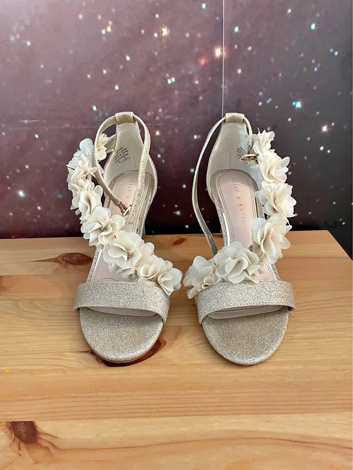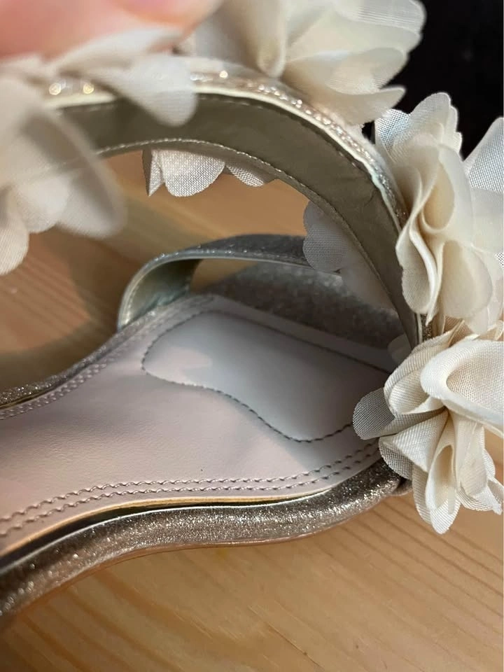 Good condition, worn once. Size 7 woman. Cushion at ball of foot. Gold sparkle with faux flower detail. Pick up East York.