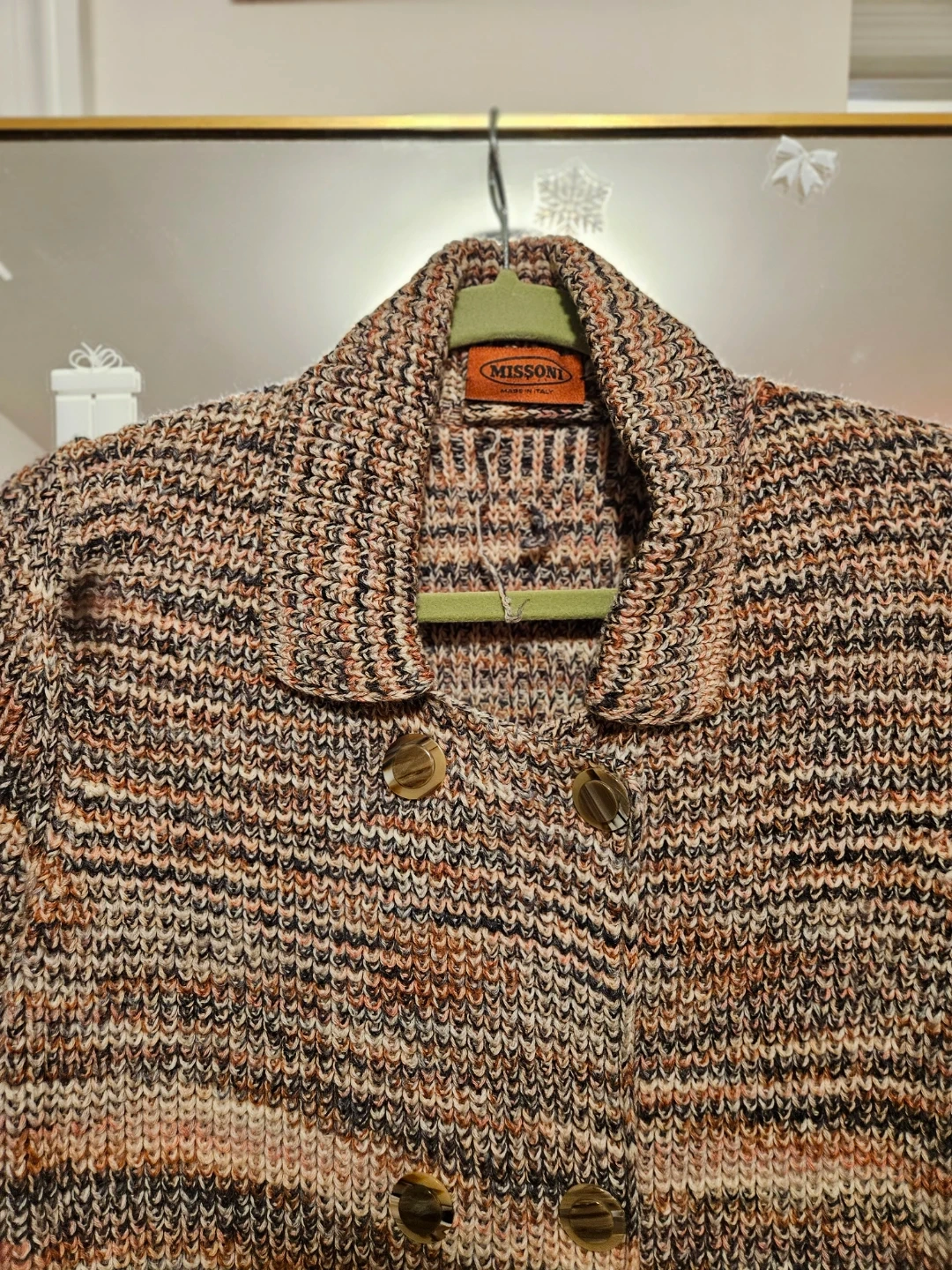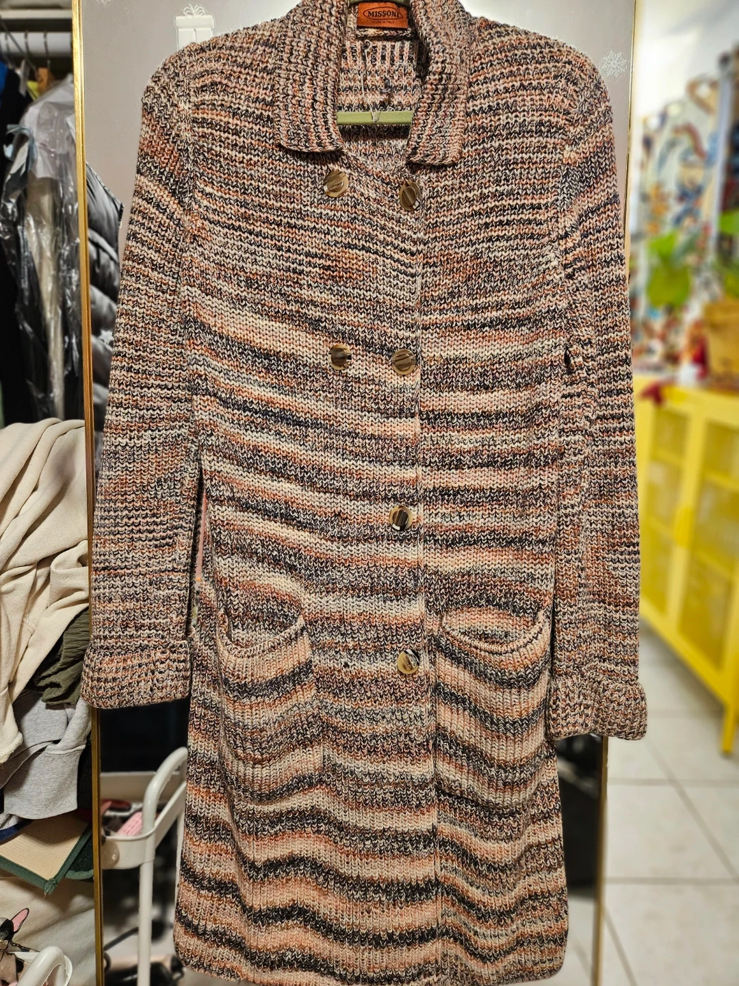 Here's a Missoni knit coat that's sure to keep you warm and stylish! The unique knit pattern features a blend of colors, including brown, black, and peach, making it a versatile piece for your wardrobe. It features a button-down front and two front pockets