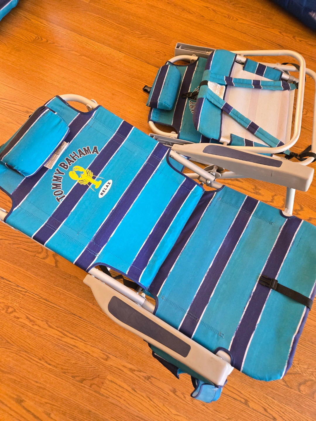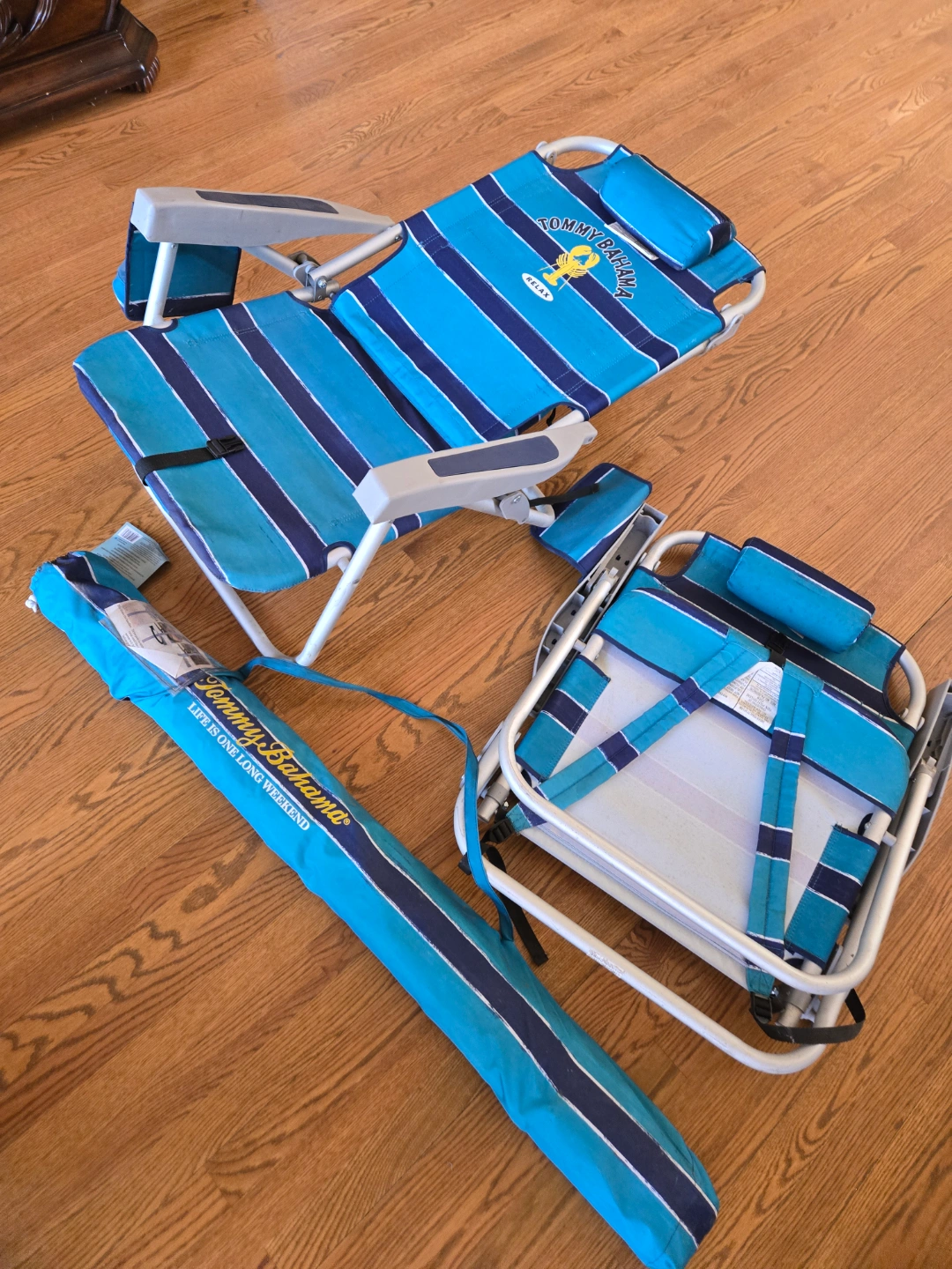Pair of Tommy Bahama beach chairs and umbrella.