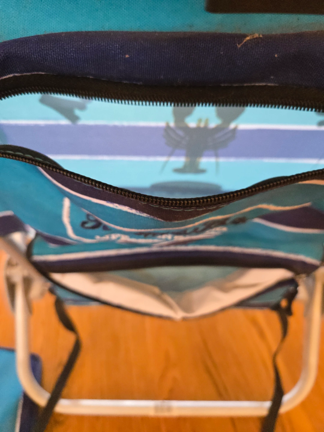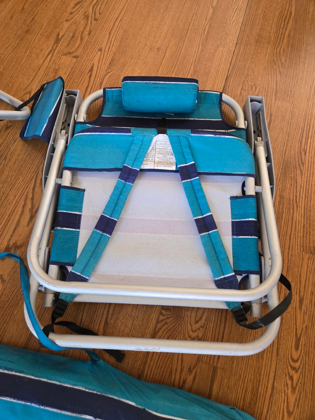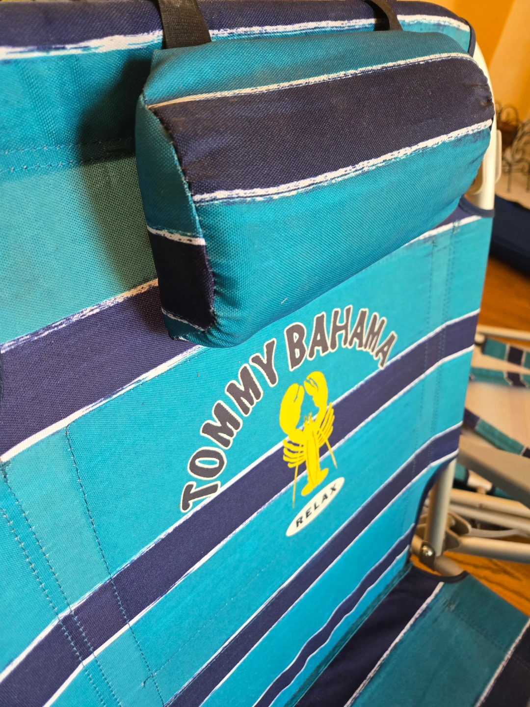 Aluminum frame. Teal and navy striped fabric.