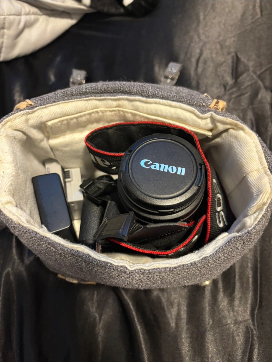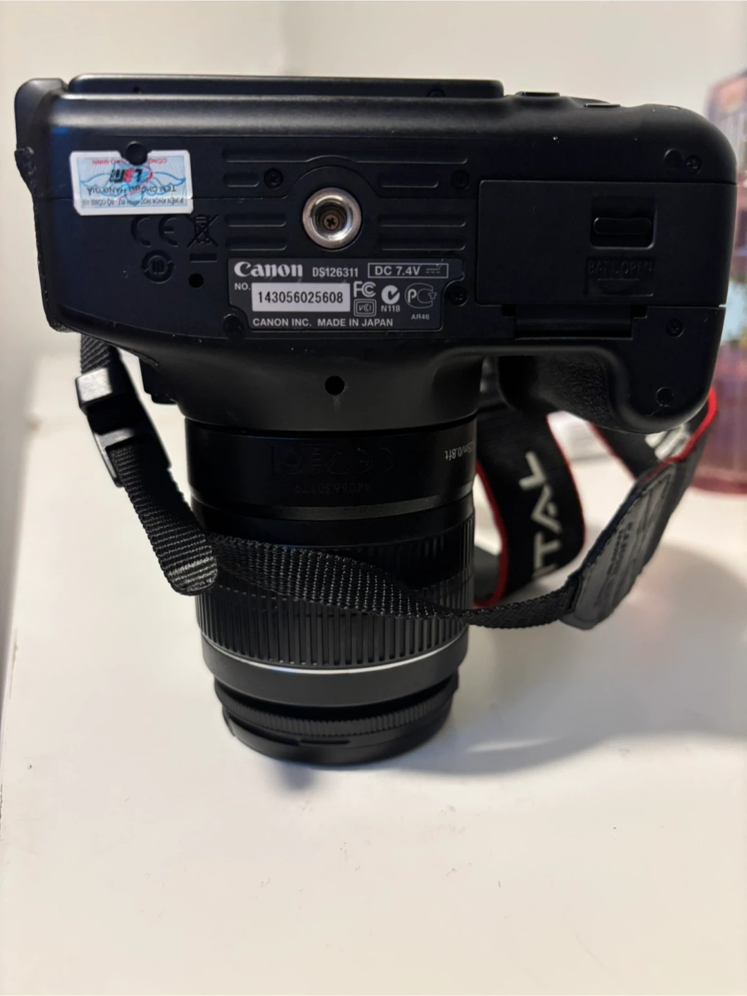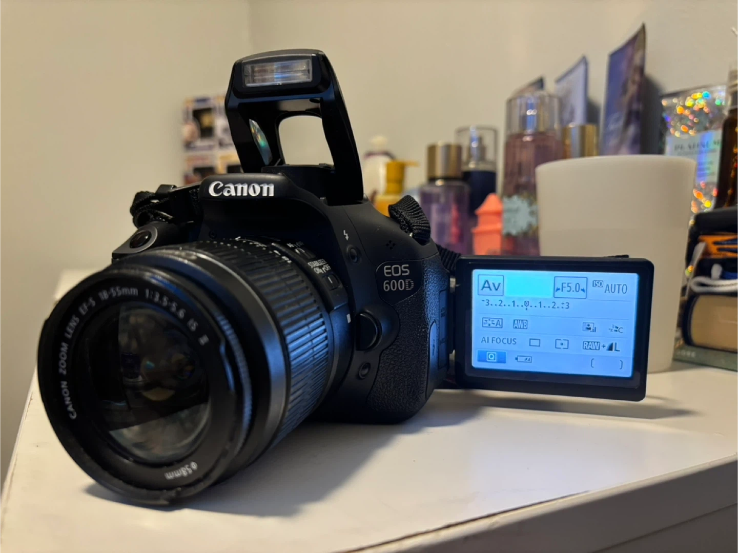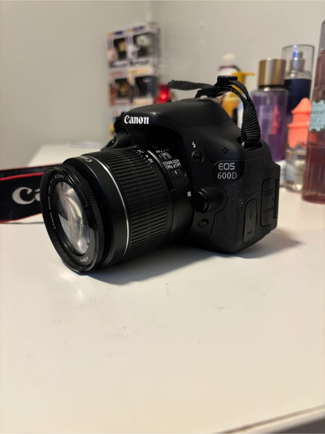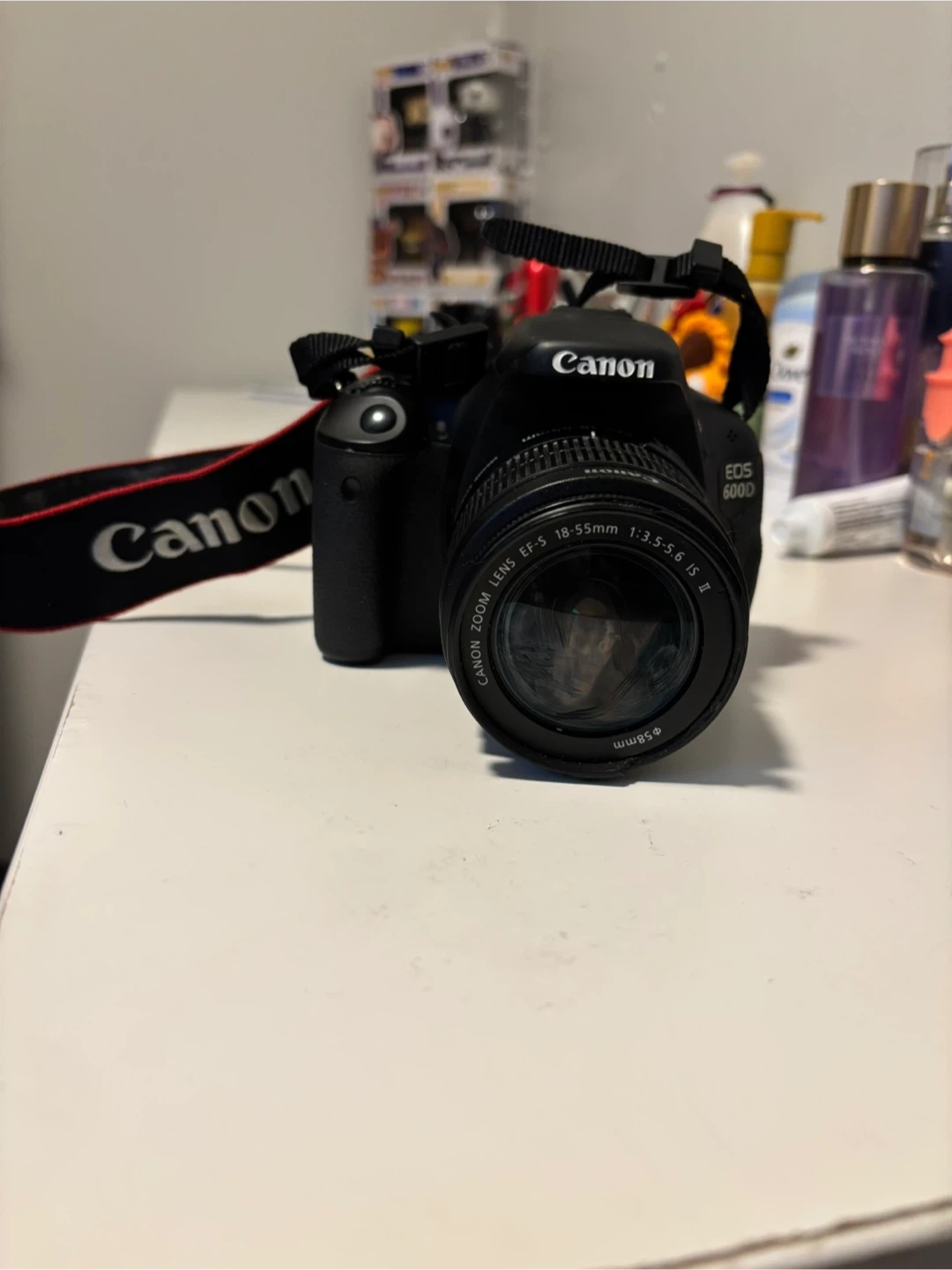 Selling a Canon EOS 600D Digital Rebel camera. It comes with a lens and a vintage gray camera bag. Perfect for photography enthusiasts! Also, two extra batteries for the camera.