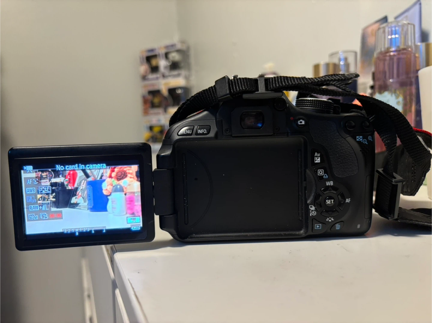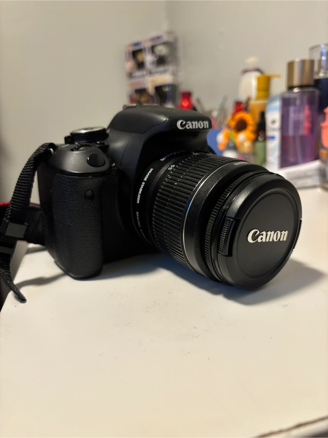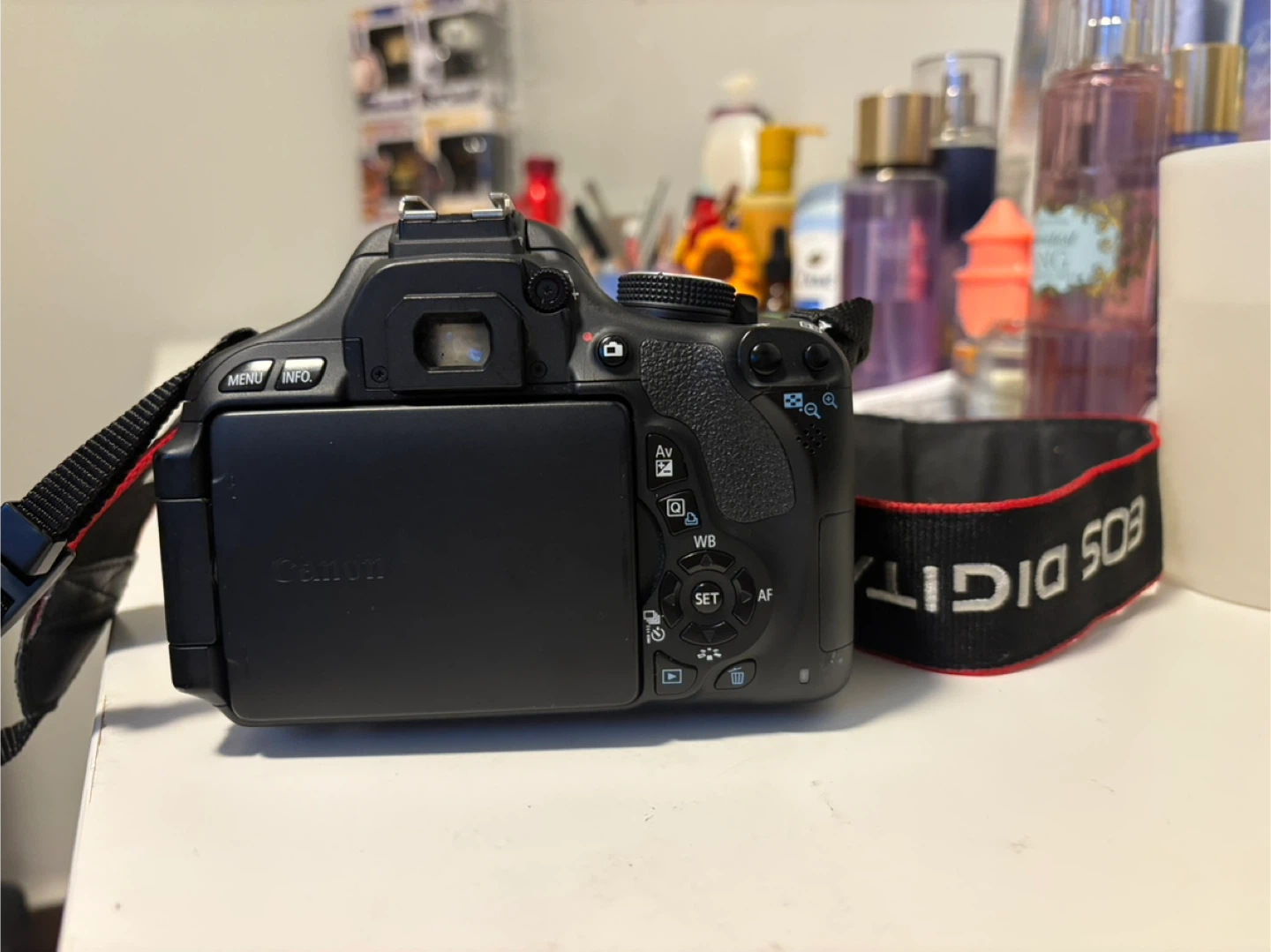 Selling a Canon EOS 600D Digital Rebel camera. It comes with a lens and a vintage gray camera bag. Perfect for photography enthusiasts! Also, two extra batteries for the camera.