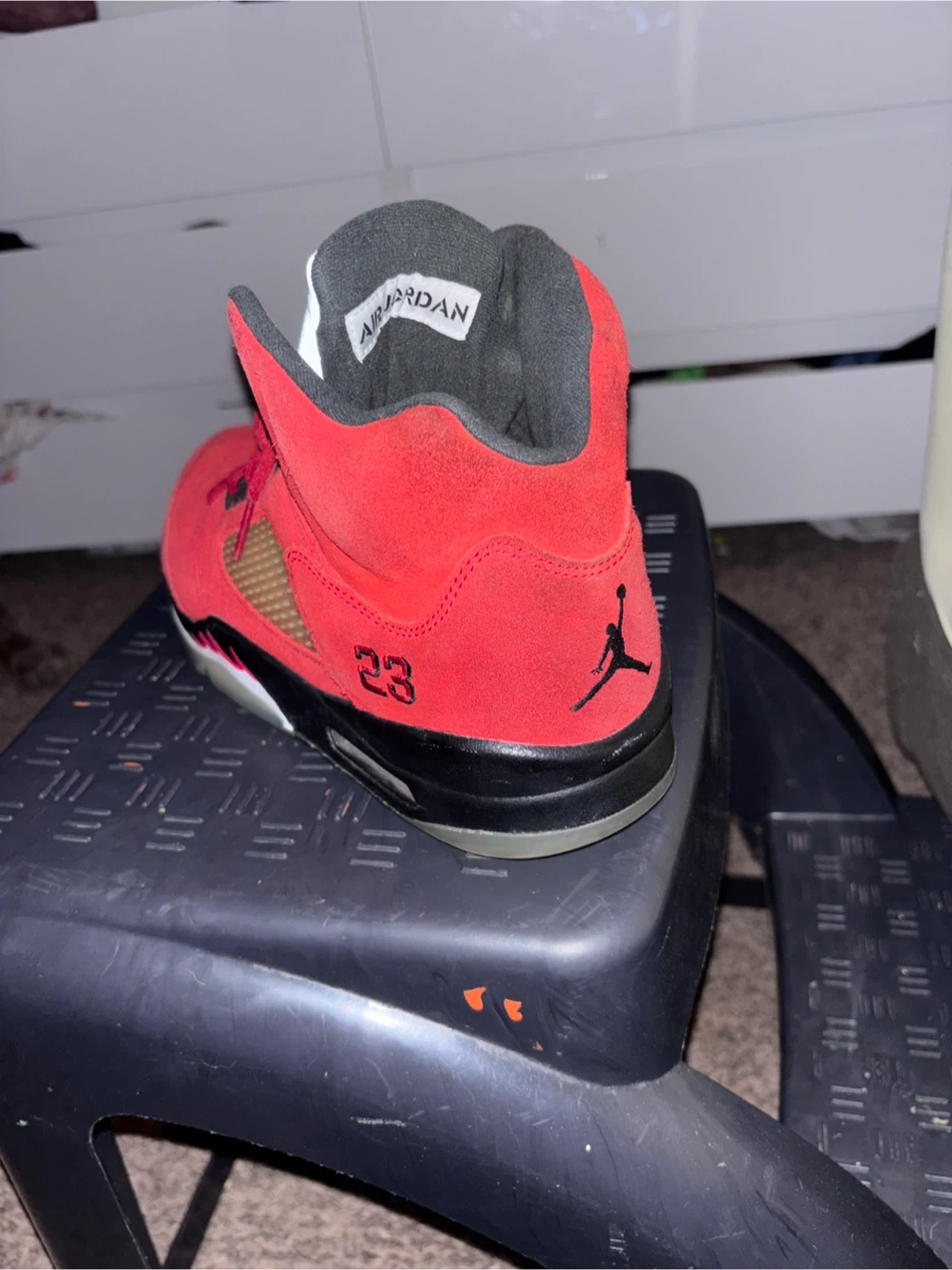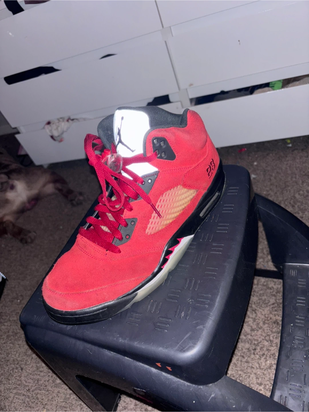 These are the Air Jordan 5 Retro sneakers in a red suede colorway. They feature the classic Jordan silhouette with red laces and black accents. The '23' is visible on the side, along with the Jumpman logo on the heel. These shoes offer a bold look and iconic style.