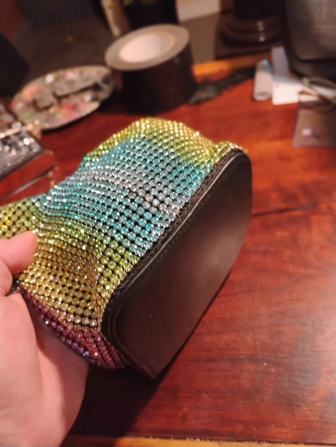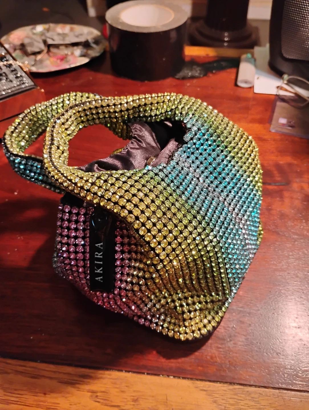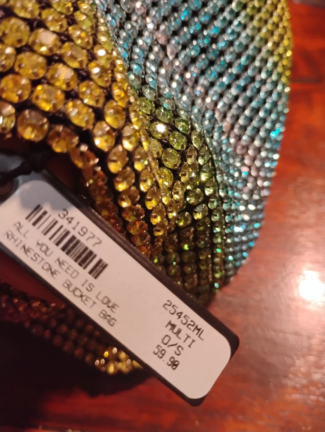 Selling an Akira rhinestone bucket bag! It's a super cute and sparkly accessory. The bag features a multi-colored rhinestone design, adding a fun pop of color to any outfit. The tag shows it was originally $59.98. It's in great condition and ready for a new owner!