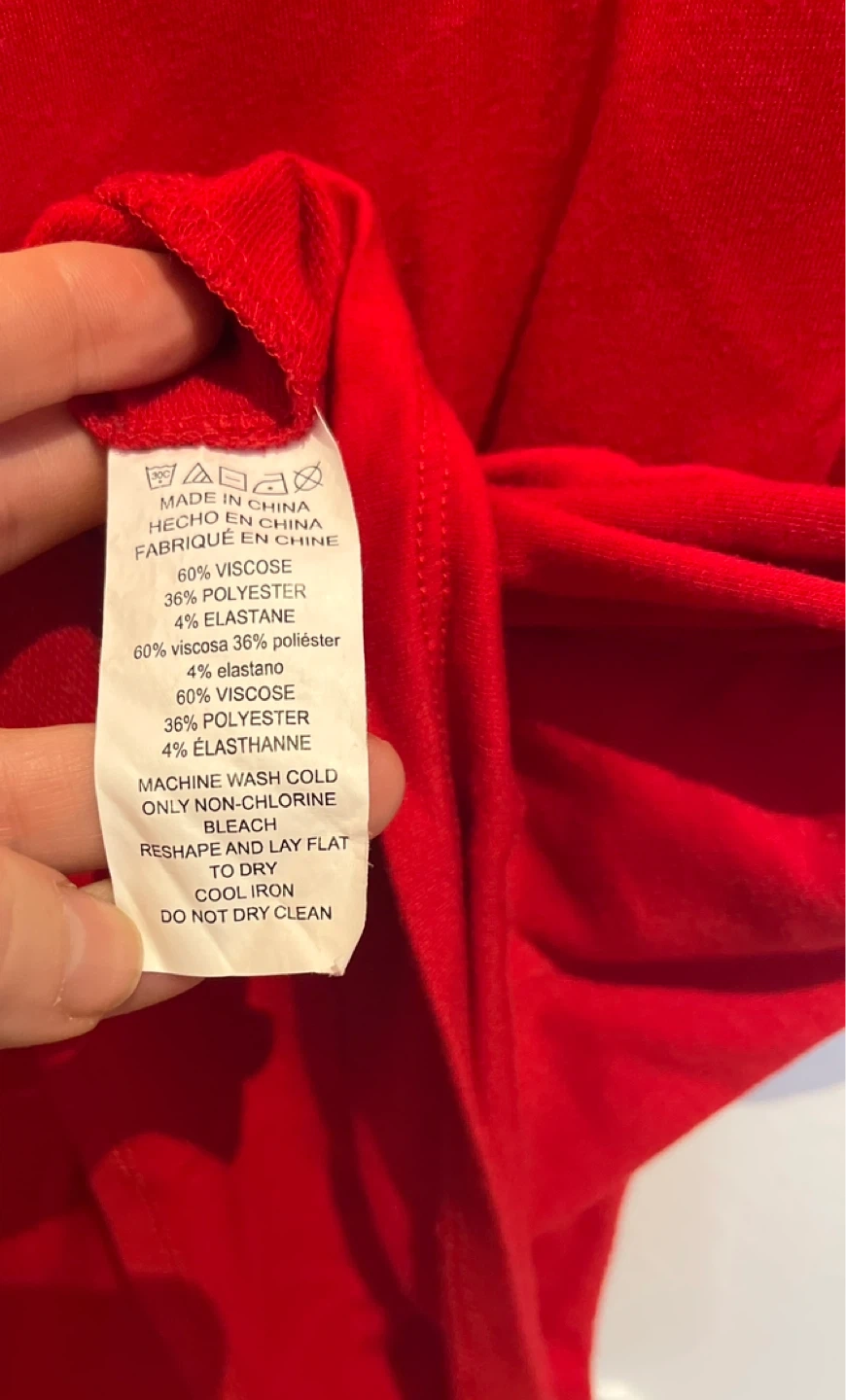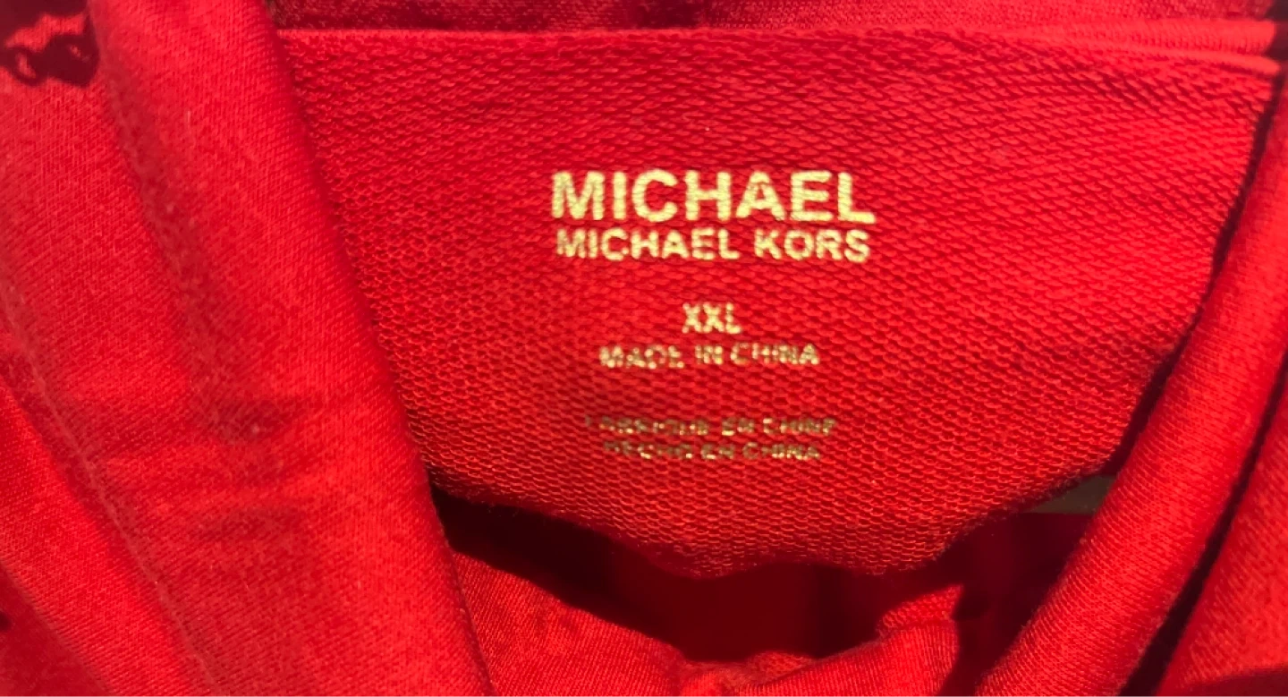 This is a red cowl neck sweatshirt by Michael Kors. It's made of 60% viscose, 36% polyester, and 4% elastane. Machine wash cold, non-chlorine bleach, reshape and lay flat to dry, cool iron, do not dry clean.