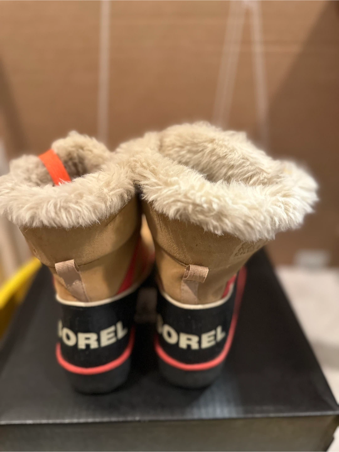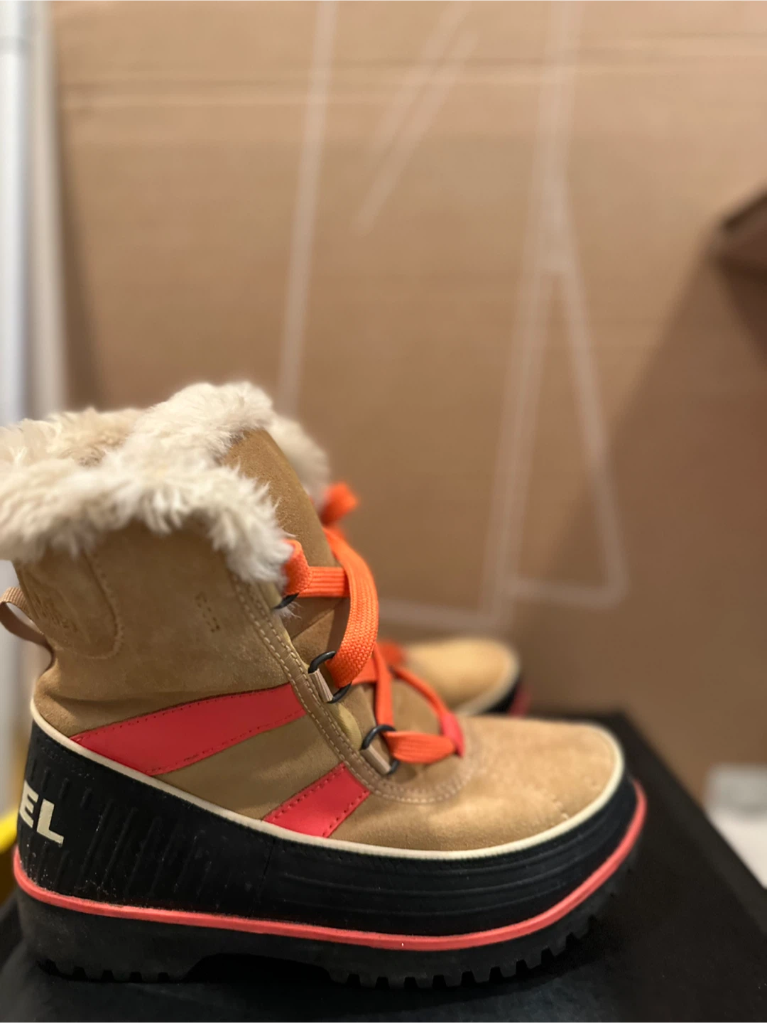 These Sorel winter boots are a size 3. They're tan suede with pink accents and a faux fur lining. The rubber sole provides good traction.