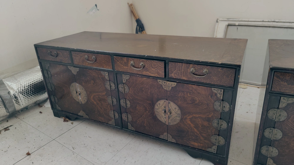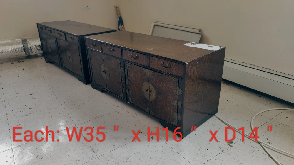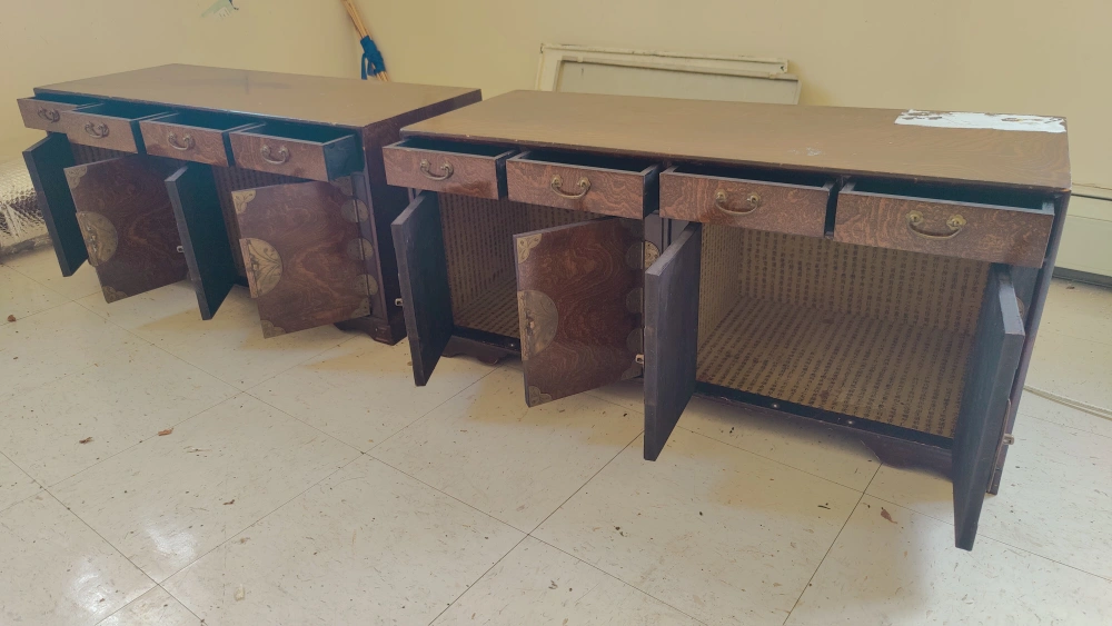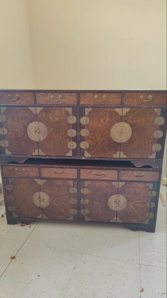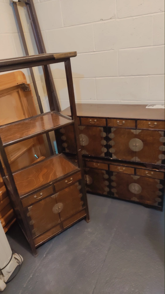 Set of three Asian-style wooden cabinets with doors, drawers, and shelves. The two larger cabinets have ornate metal accents.