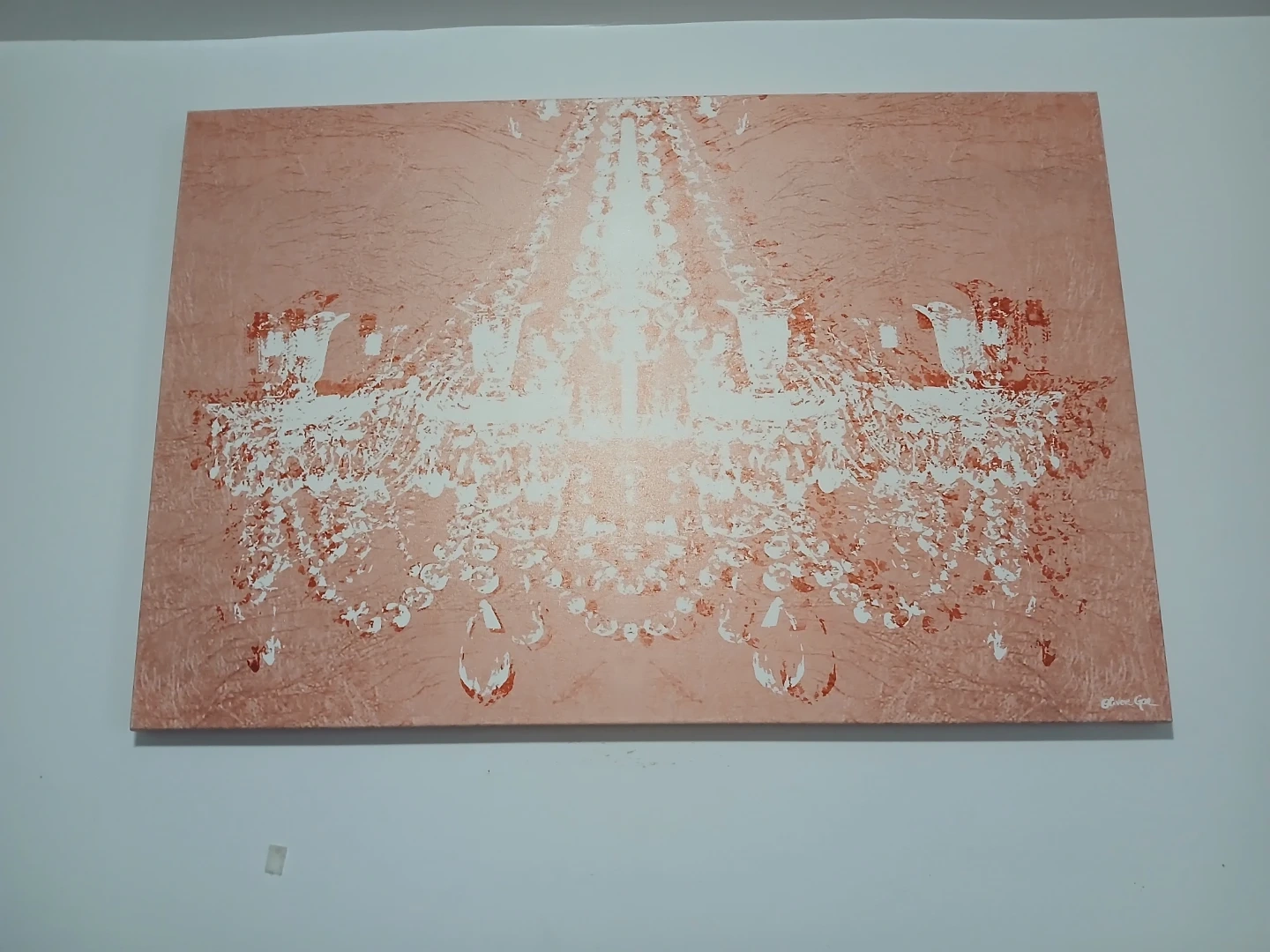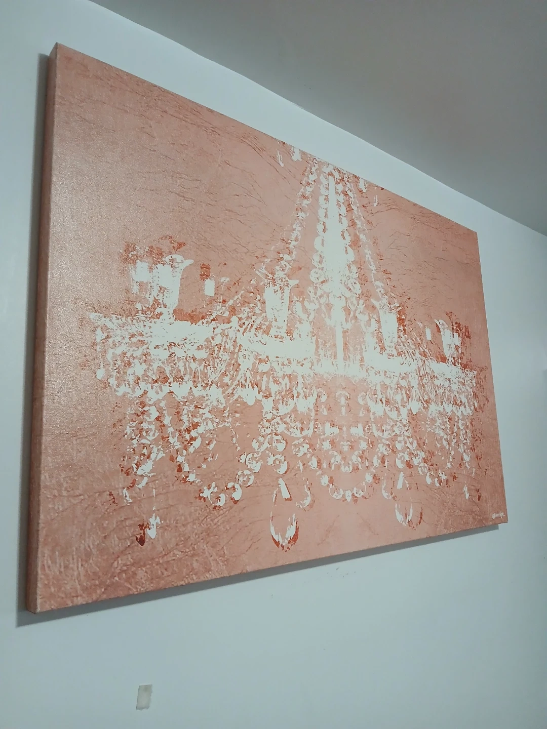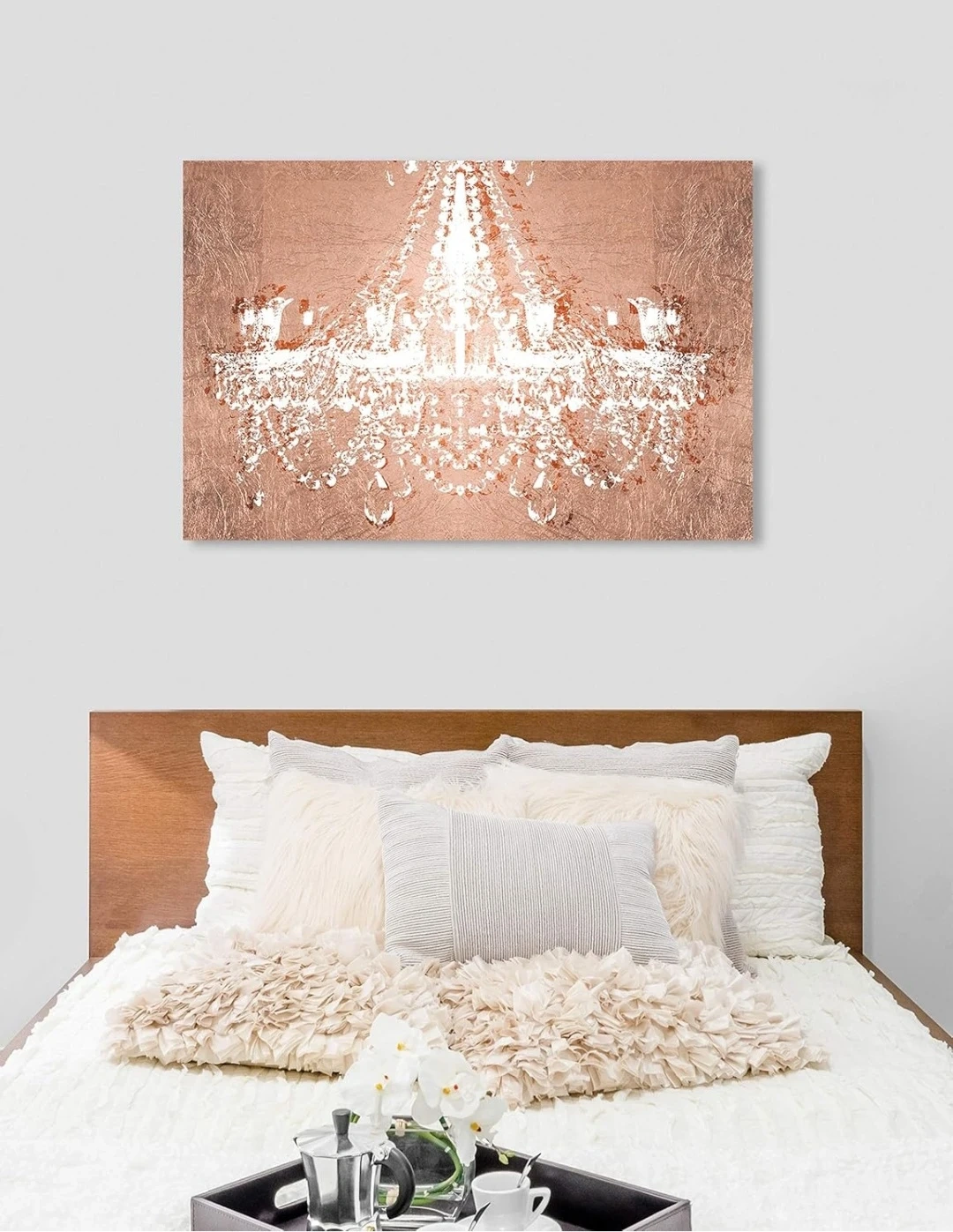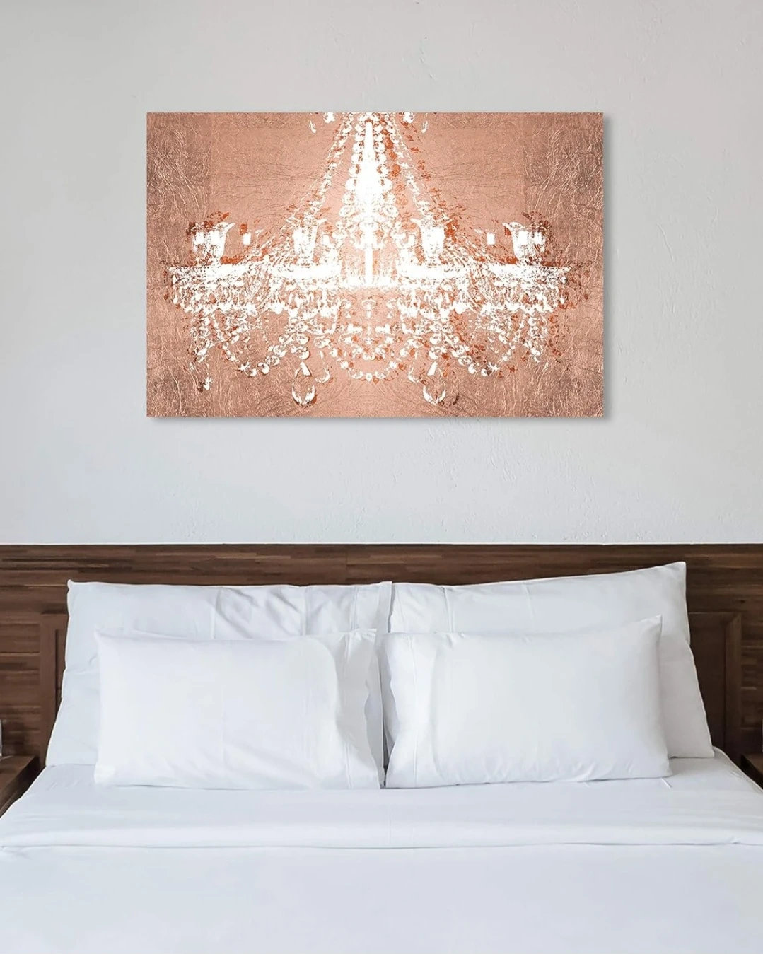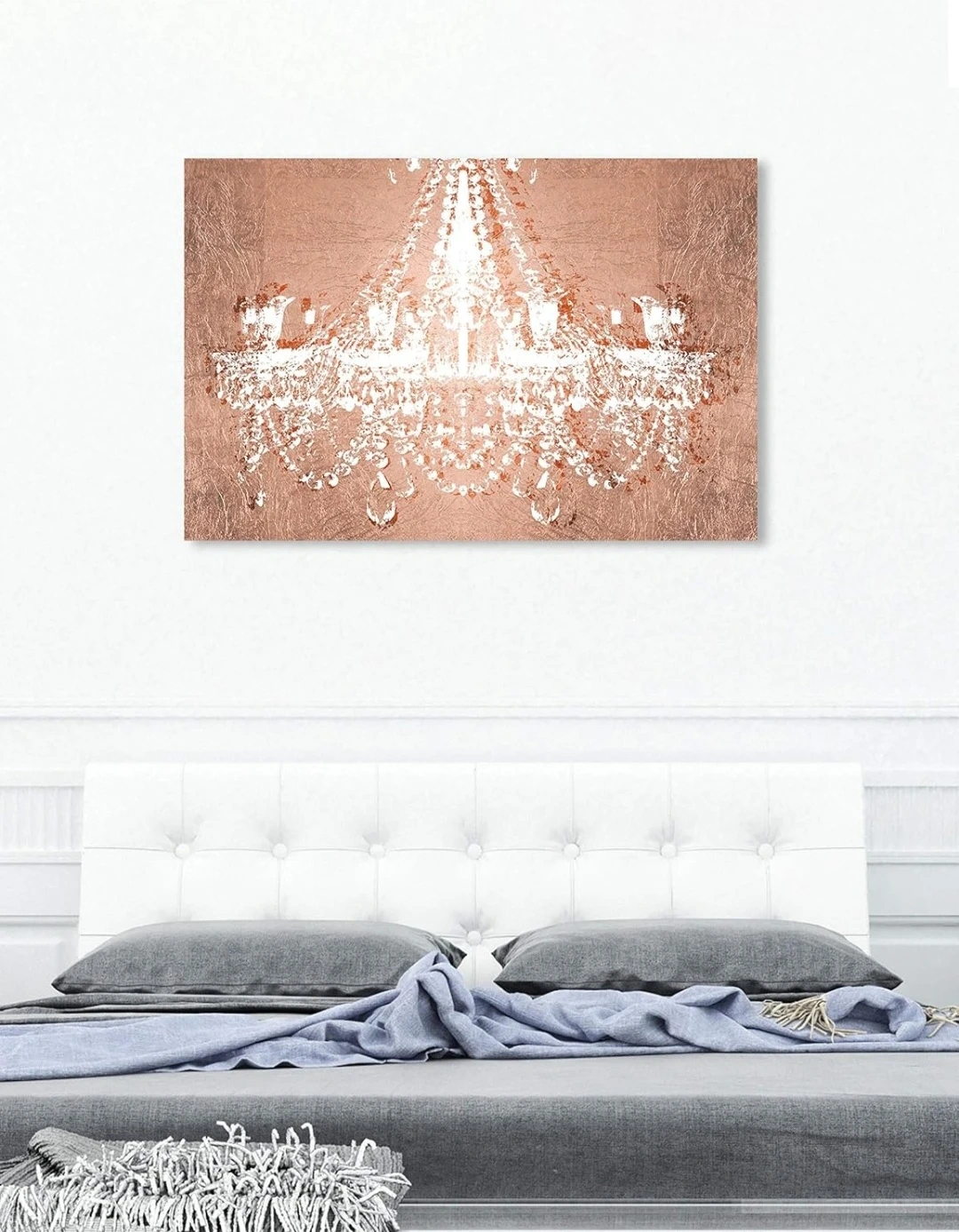 Oliver Gal Artist Co. 'Dramatic Entrance Rose' canvas wall art print. It's a glam chandelier design on a rose gold textured background. 45" L x 30" W canvas.