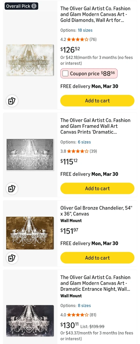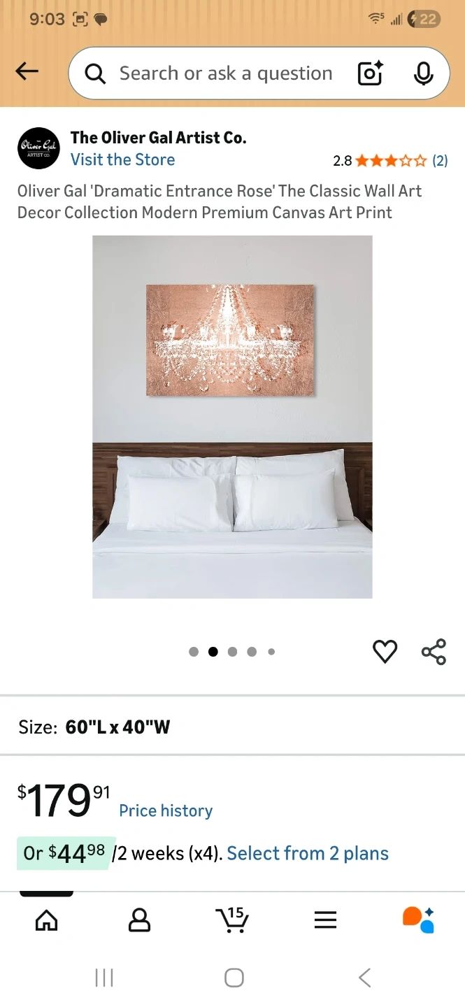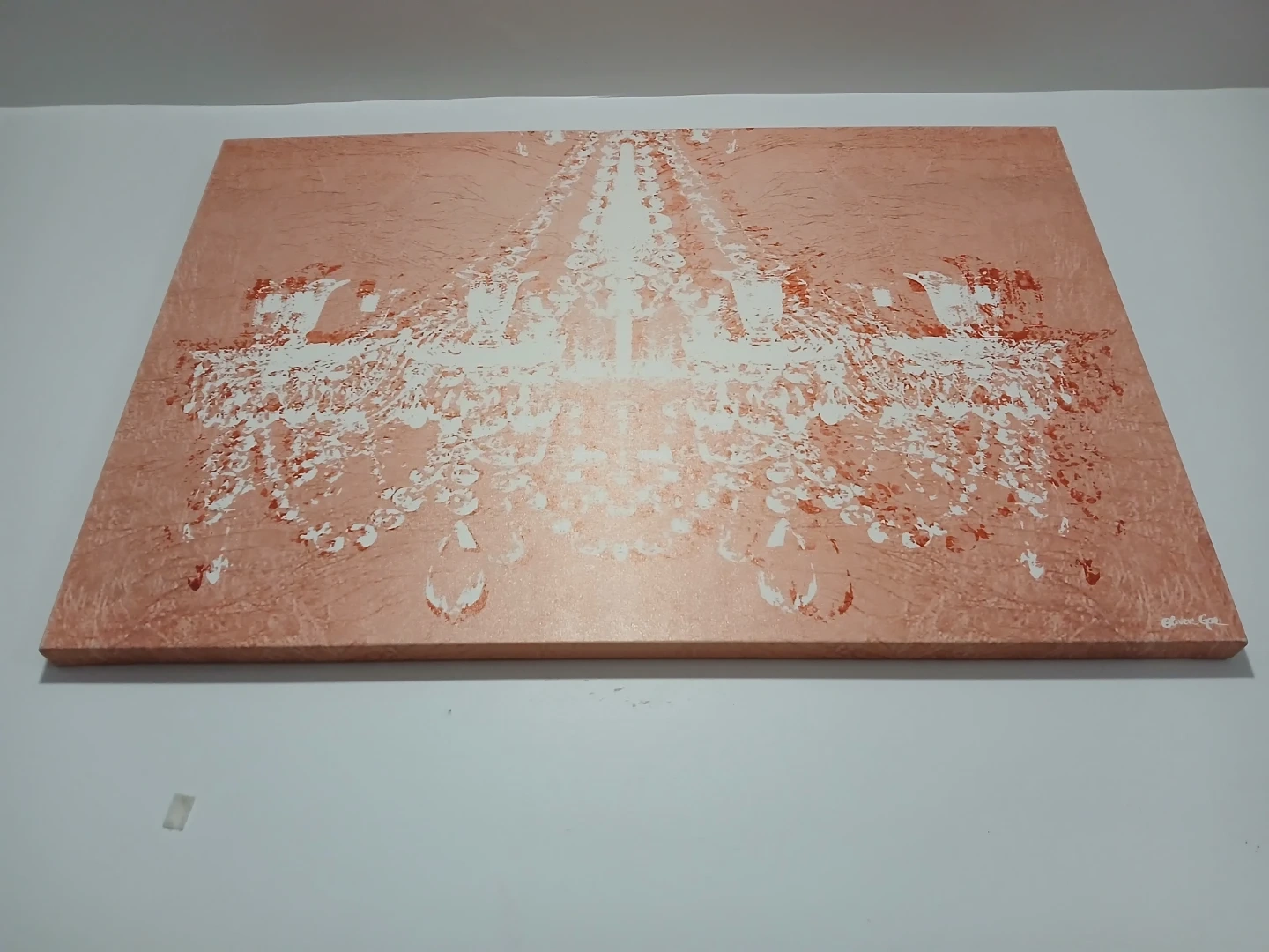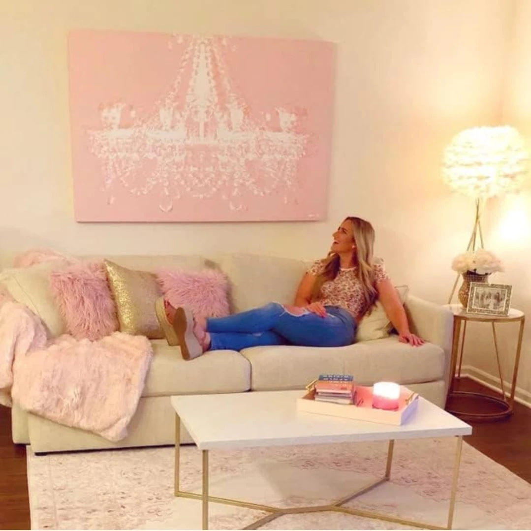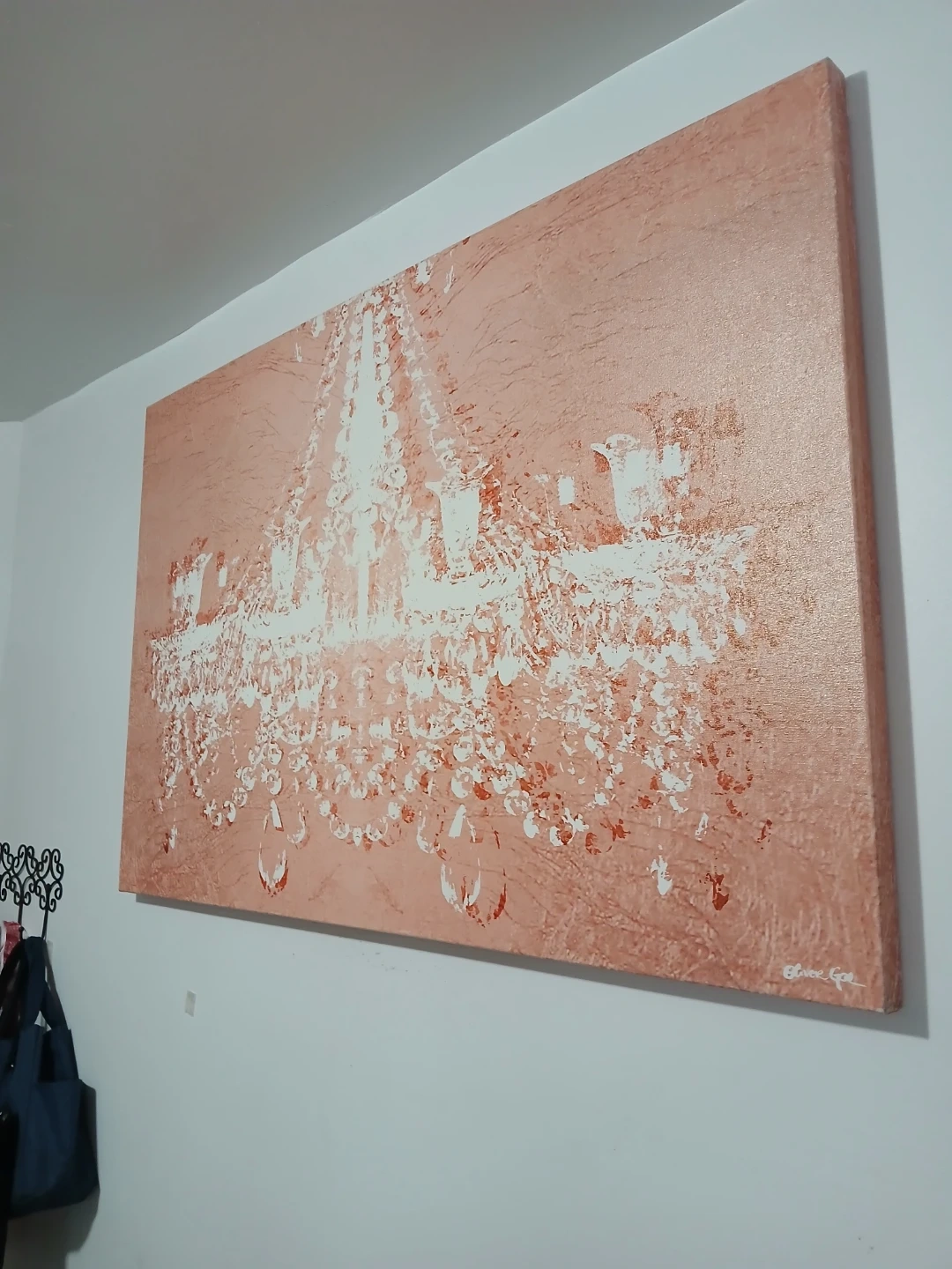 Oliver Gal Artist Co. 'Dramatic Entrance Rose' canvas wall art print. It's a glam chandelier design on a rose gold textured background. 45" L x 30" W canvas.