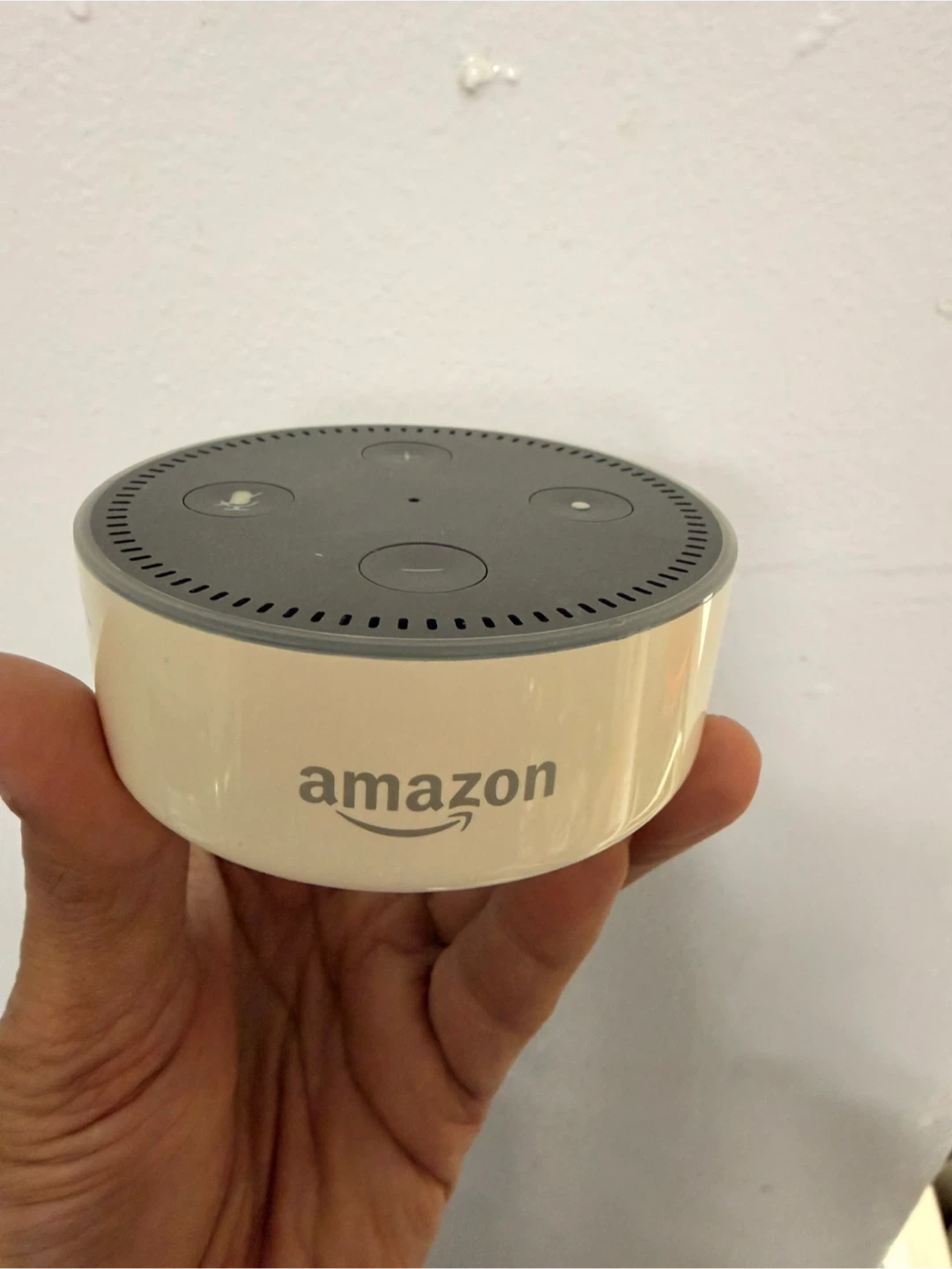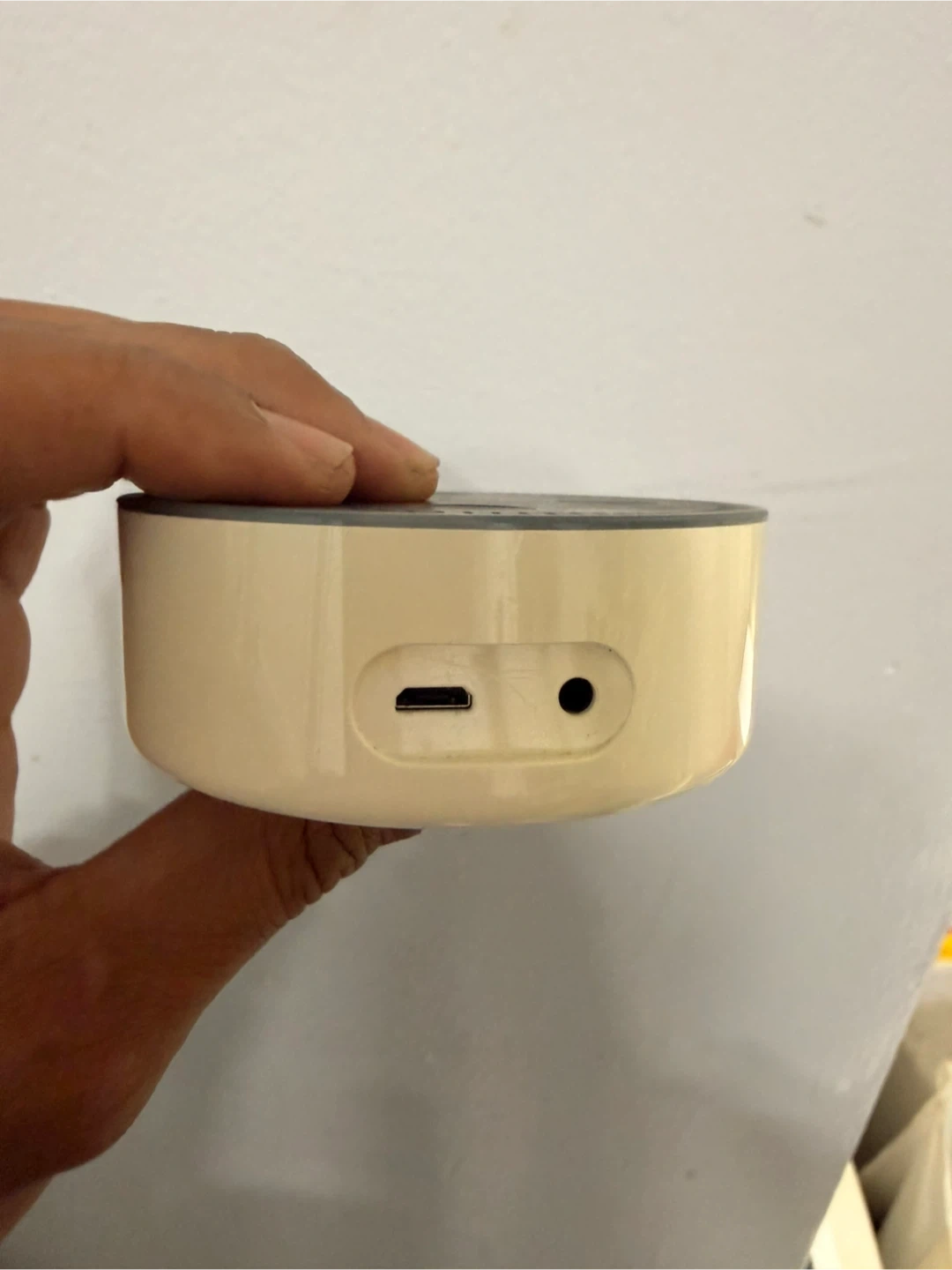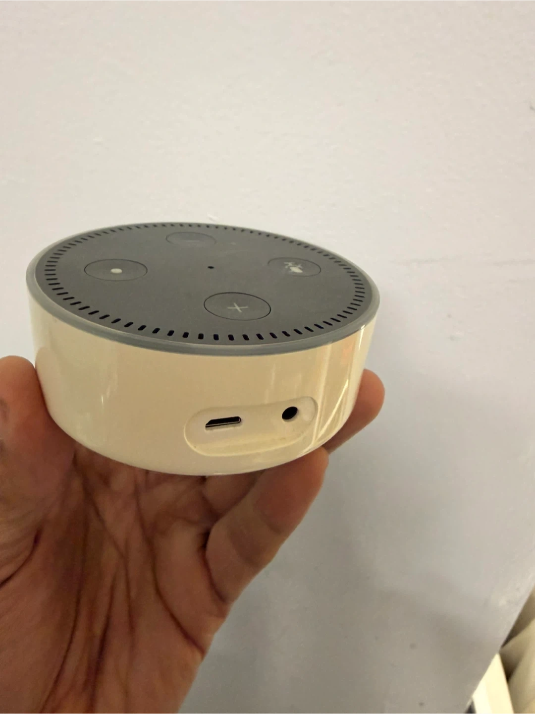This is a white Amazon Echo Dot, 2nd generation smart speaker. It has a micro-USB port and an audio jack on the back. It's a great device for hands-free control of music and smart home devices!