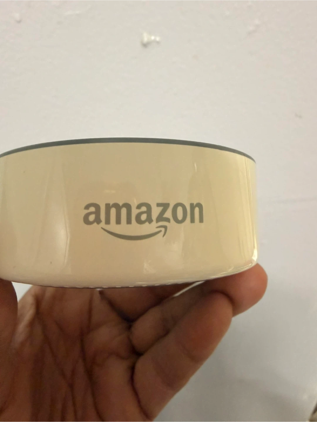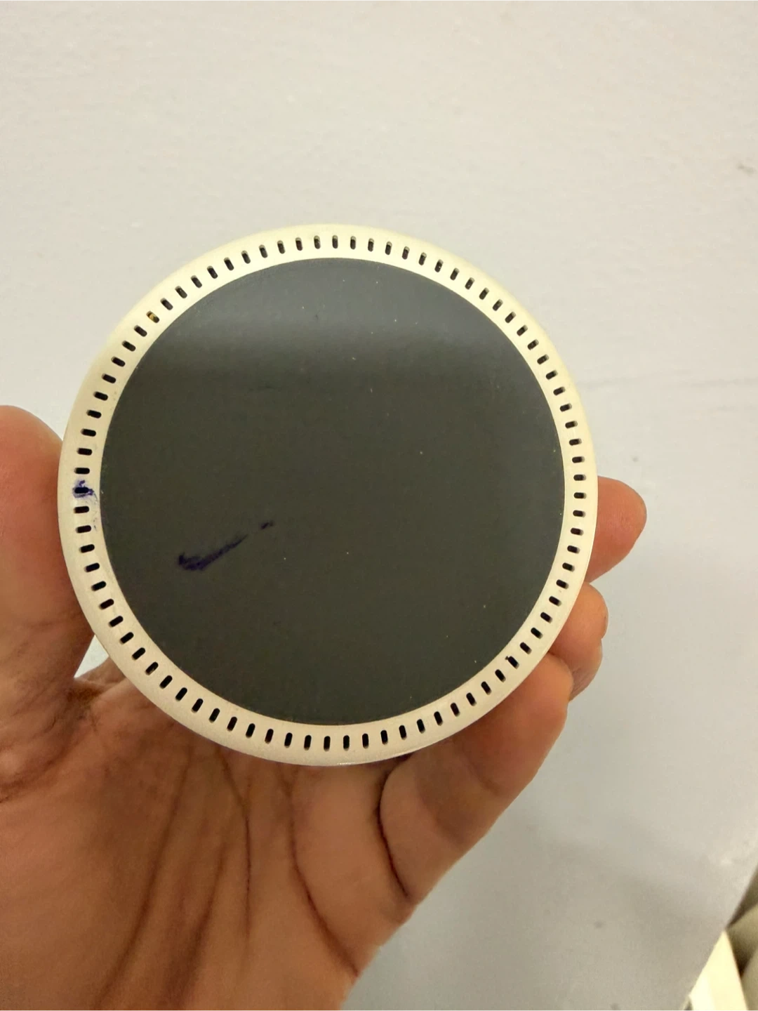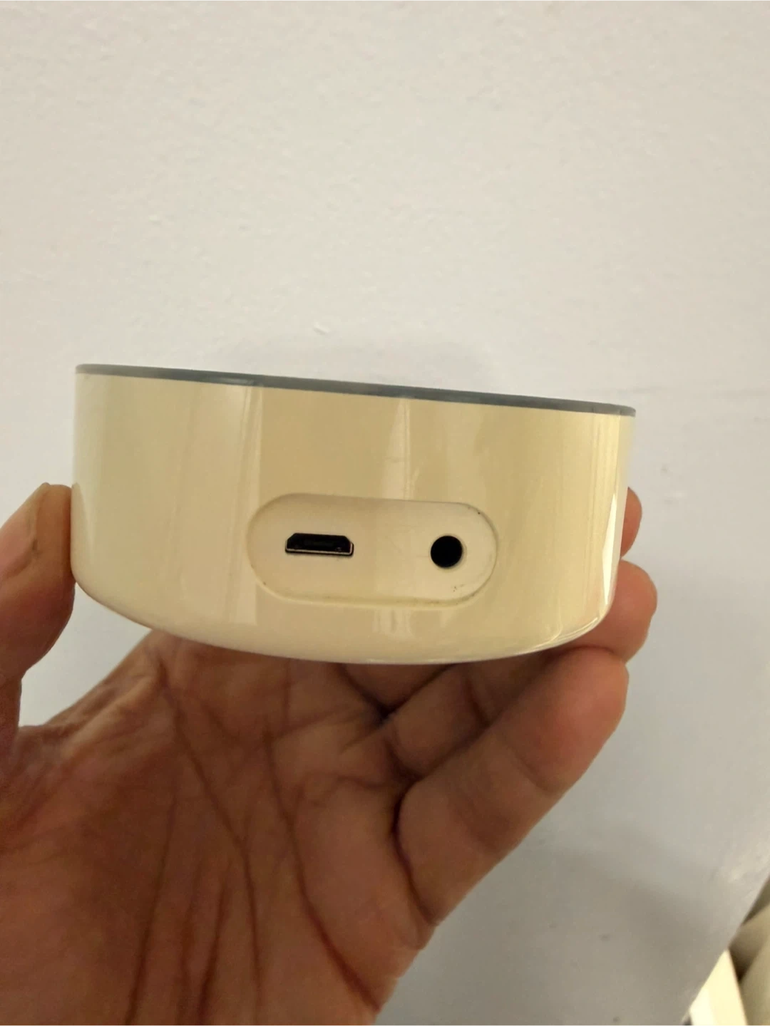 This is a white Amazon Echo Dot, 2nd generation smart speaker. It has a micro-USB port and an audio jack on the back. It's a great device for hands-free control of music and smart home devices!