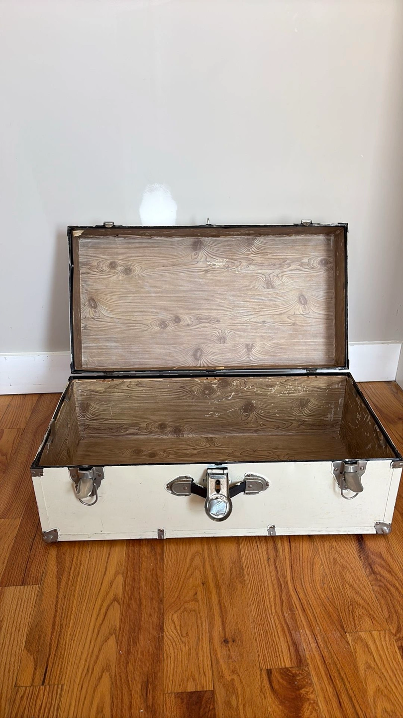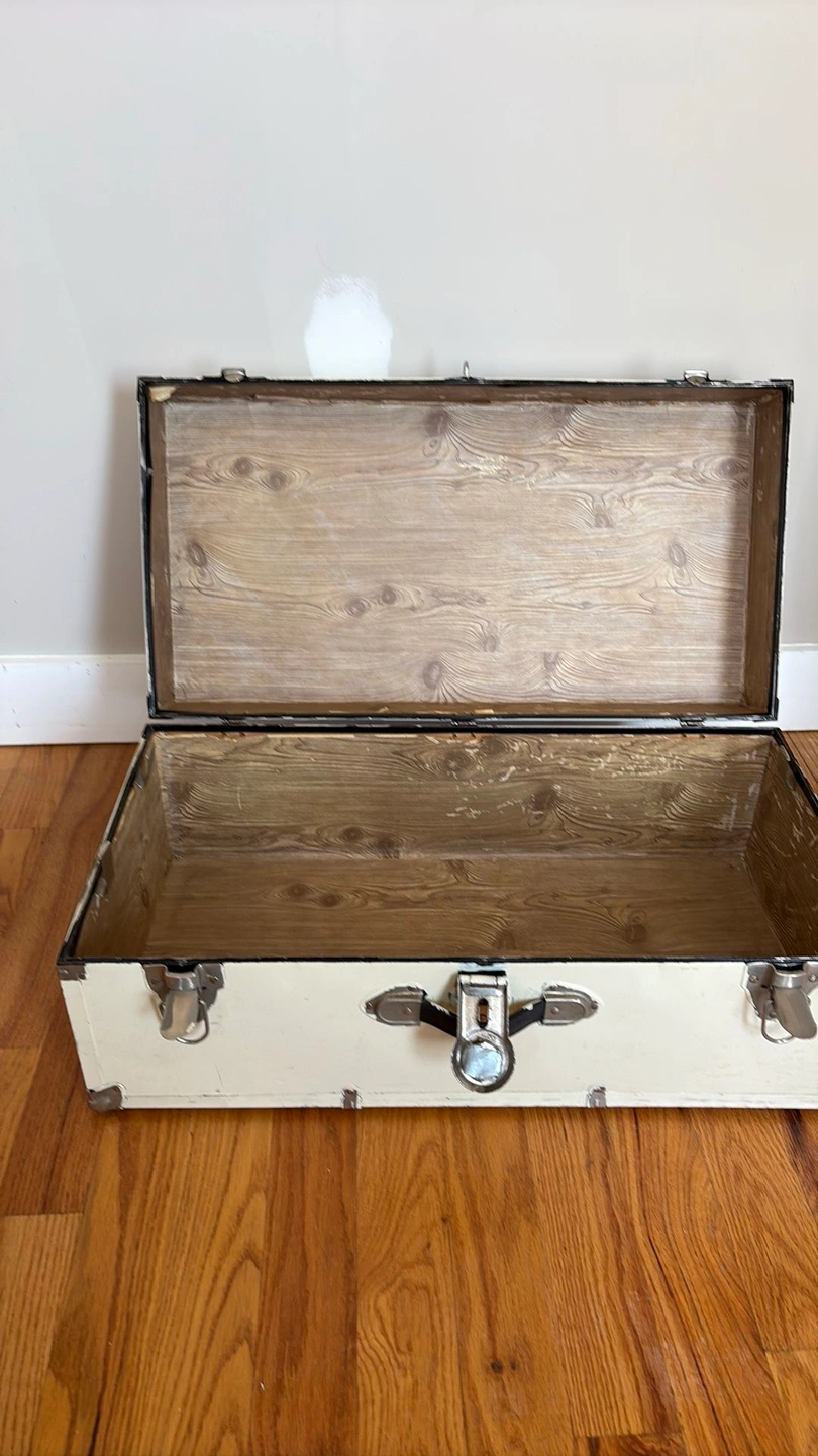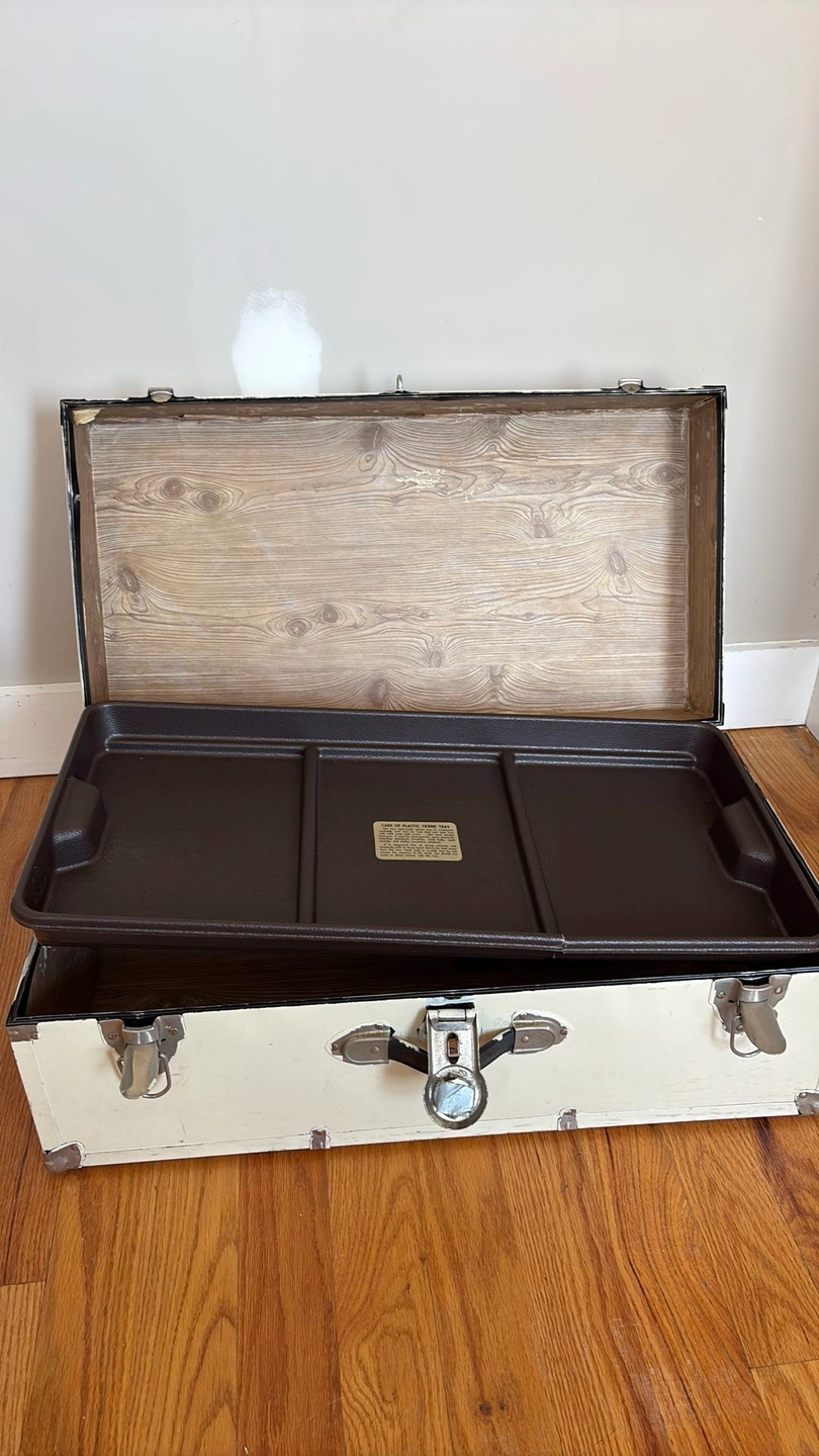 It was originally black and has been painted white; it might be possible to strip it back to the original color. The side handle is broken, and the inner tray is damaged but still functional. It's well-used and has been loved, but unfortunately, I no longer have space for it.