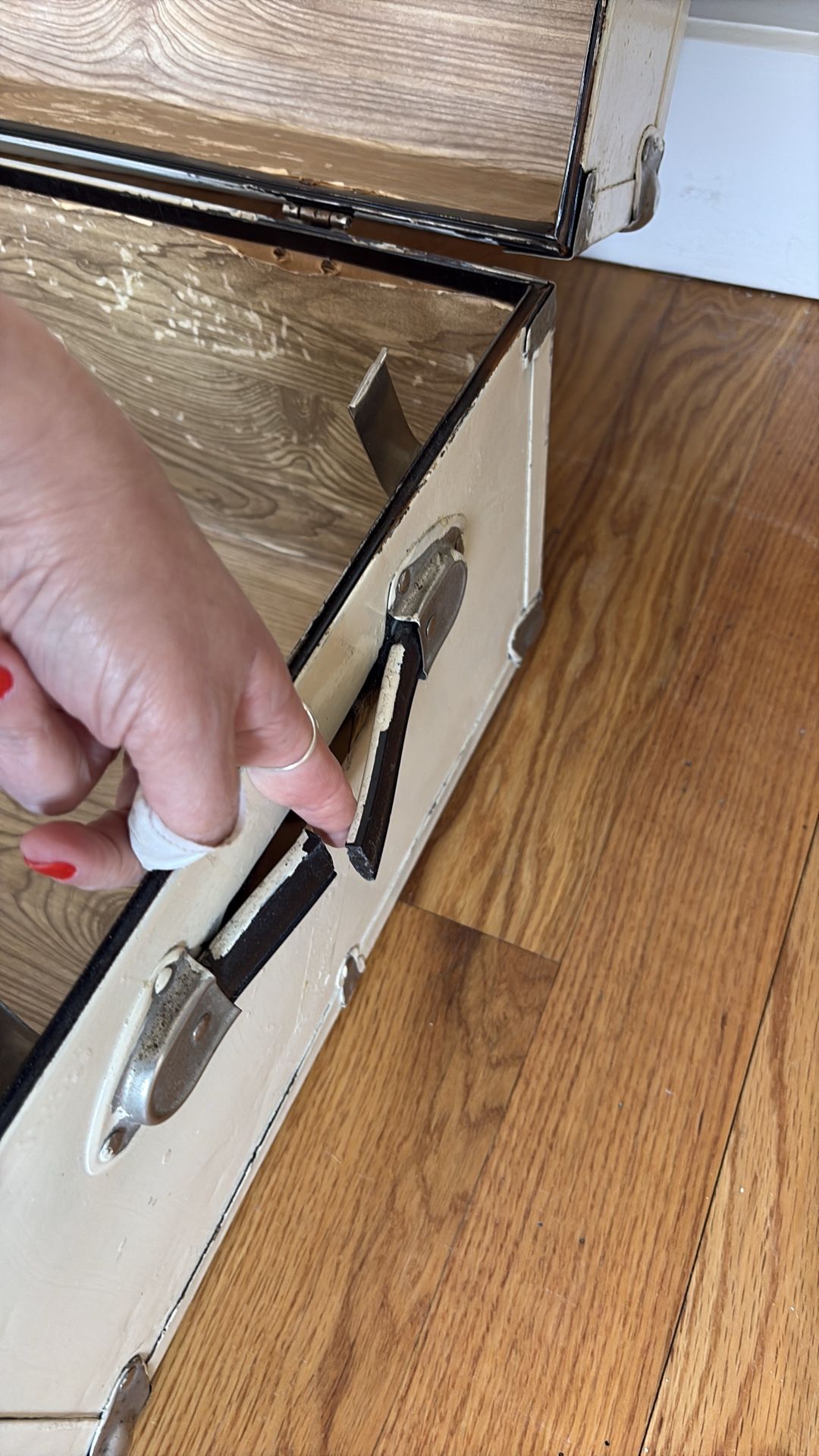 It was originally black and has been painted white; it might be possible to strip it back to the original color. The side handle is broken, and the inner tray is damaged but still functional. It's well-used and has been loved, but unfortunately, I no longer have space for it.