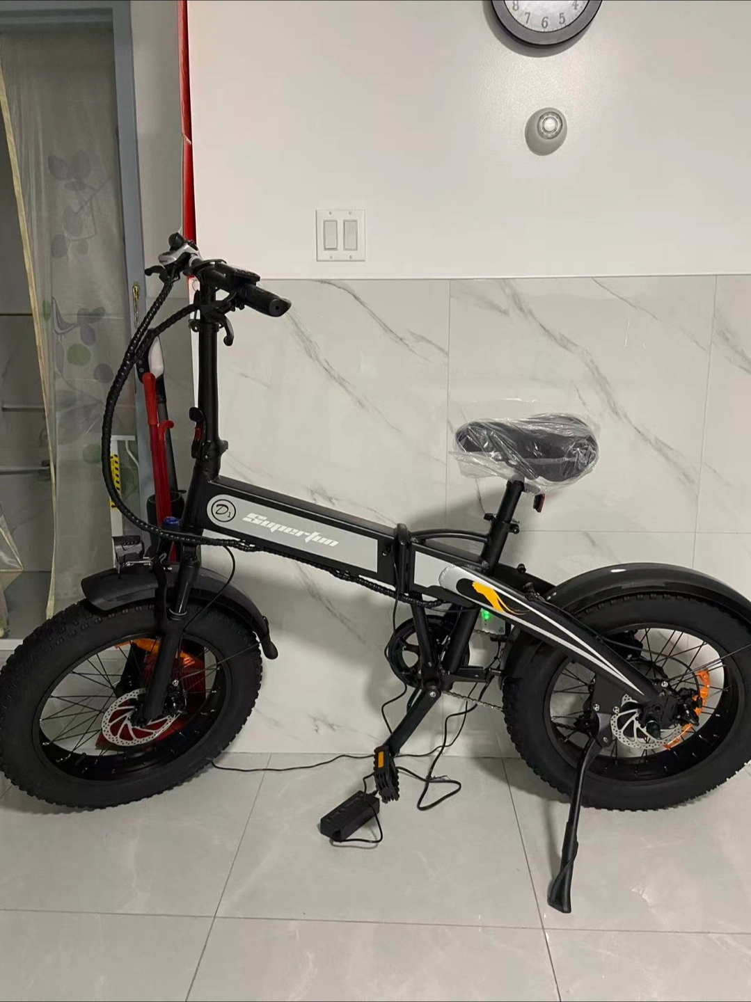 This is a Superfun brand folding electric bike with fat tires. It's black and includes a charger. This bike is great for commuting or recreational riding!