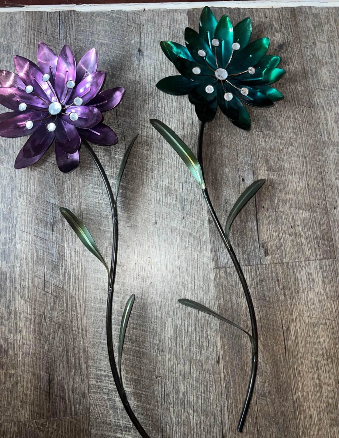 Two metal flowers wall decor. Purple and teal flowers with rhinestones. Black metal stems and leaves. Could be inside and outside