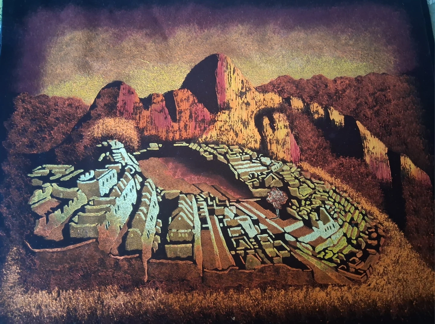 This is a framed artwork depicting Machu Picchu. The colors are vibrant with warm tones of orange, yellow, and purple. It's a striking visual representation of the ancient citadel. Beautiful if framed.