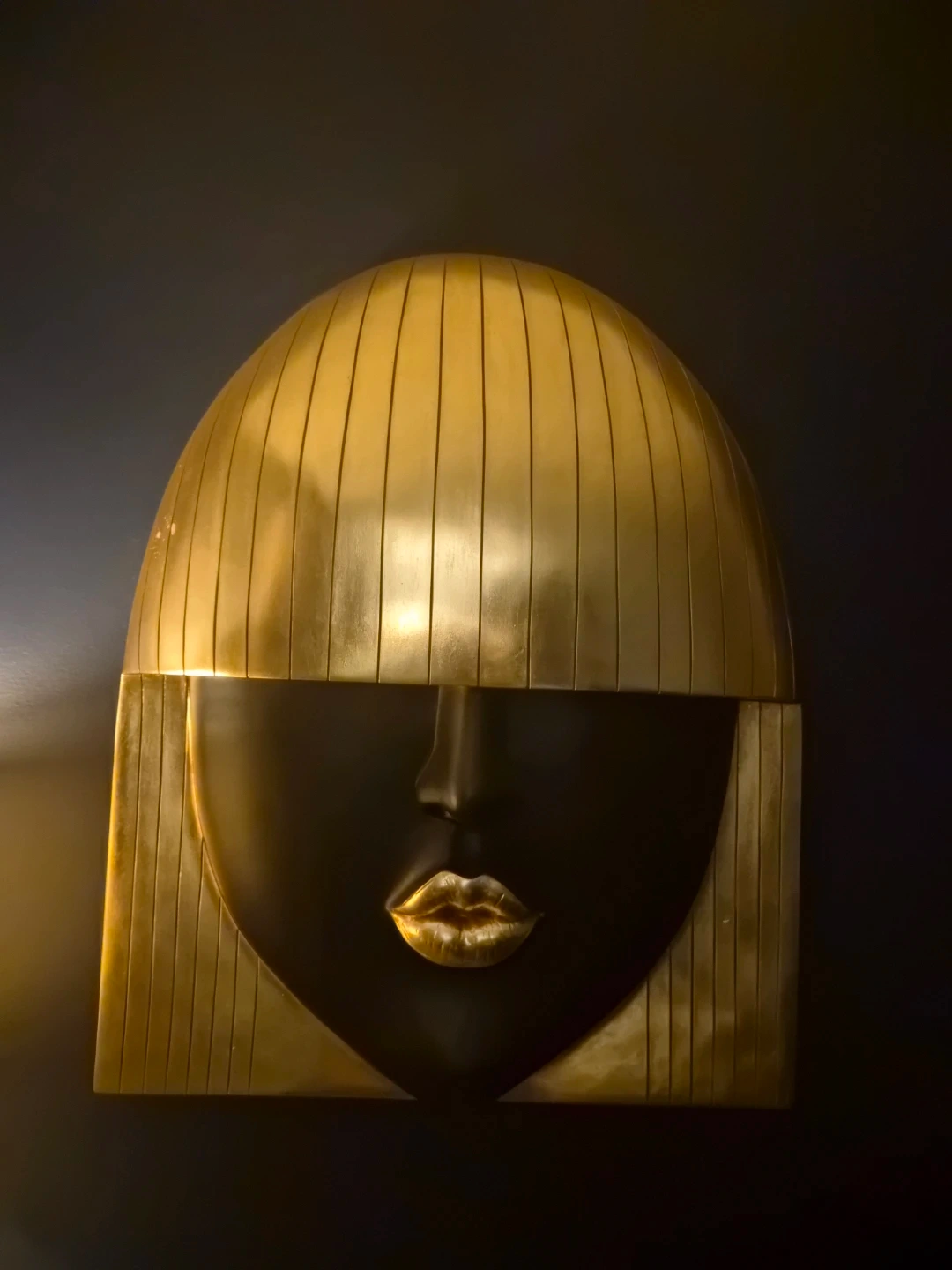 This striking wall art features a stylized face with a gold helmet-like hairstyle and gold lips against a dark background. It's a bold statement piece. Likely metal construction.