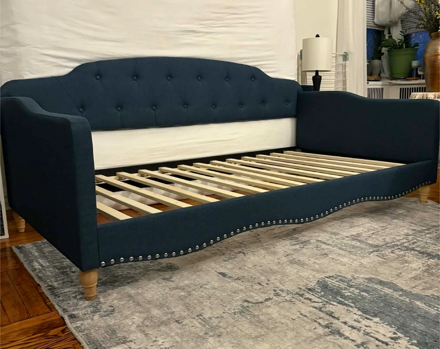Selling a blue upholstered daybed frame. It has a tufted back and nailhead trim. Perfect for a guest room or living room!New