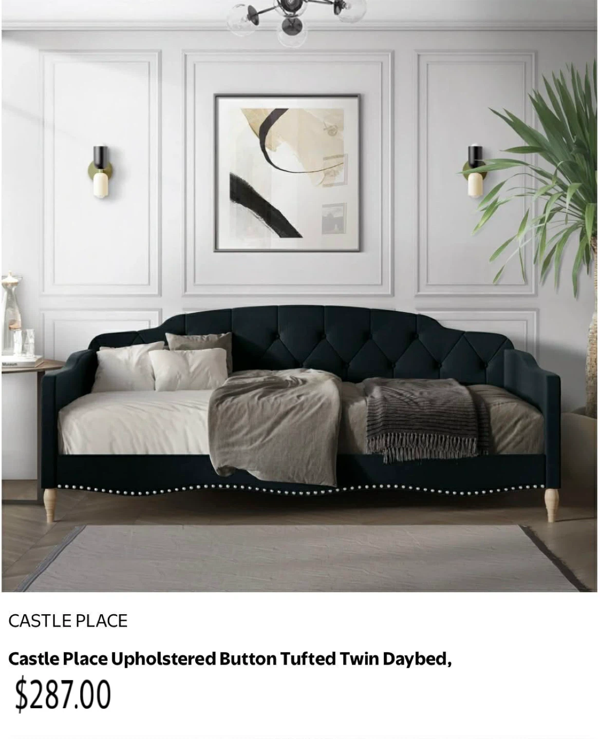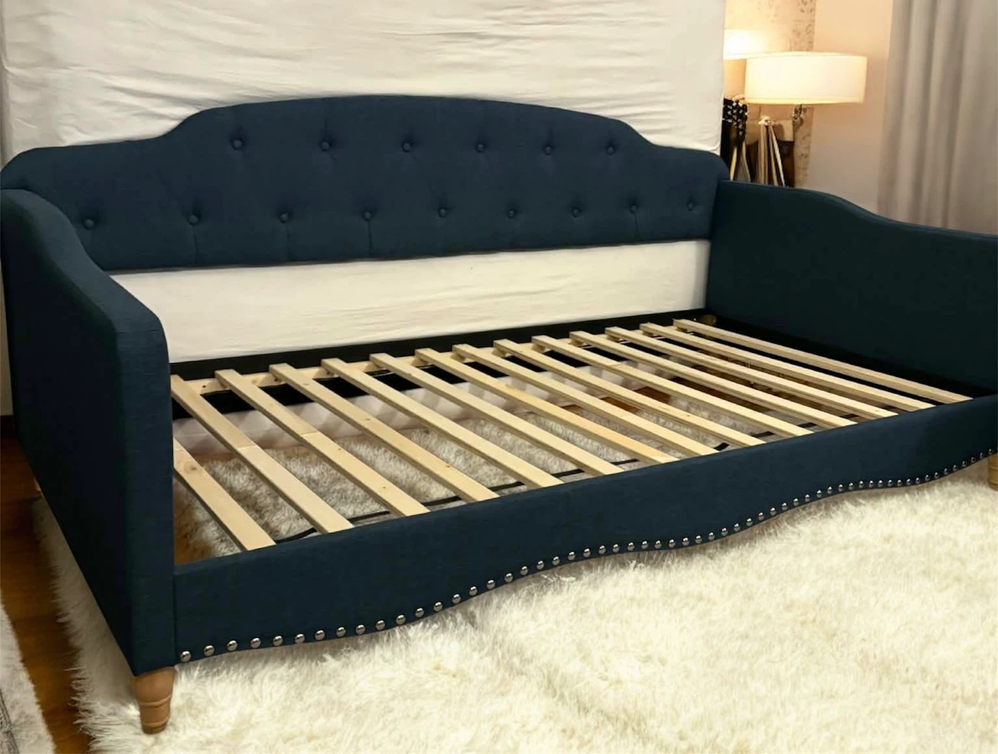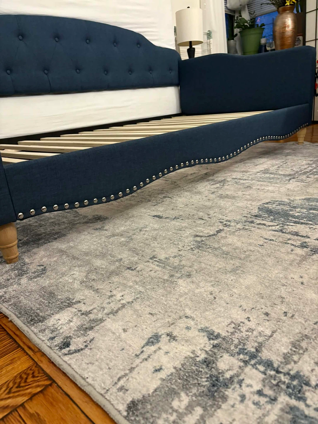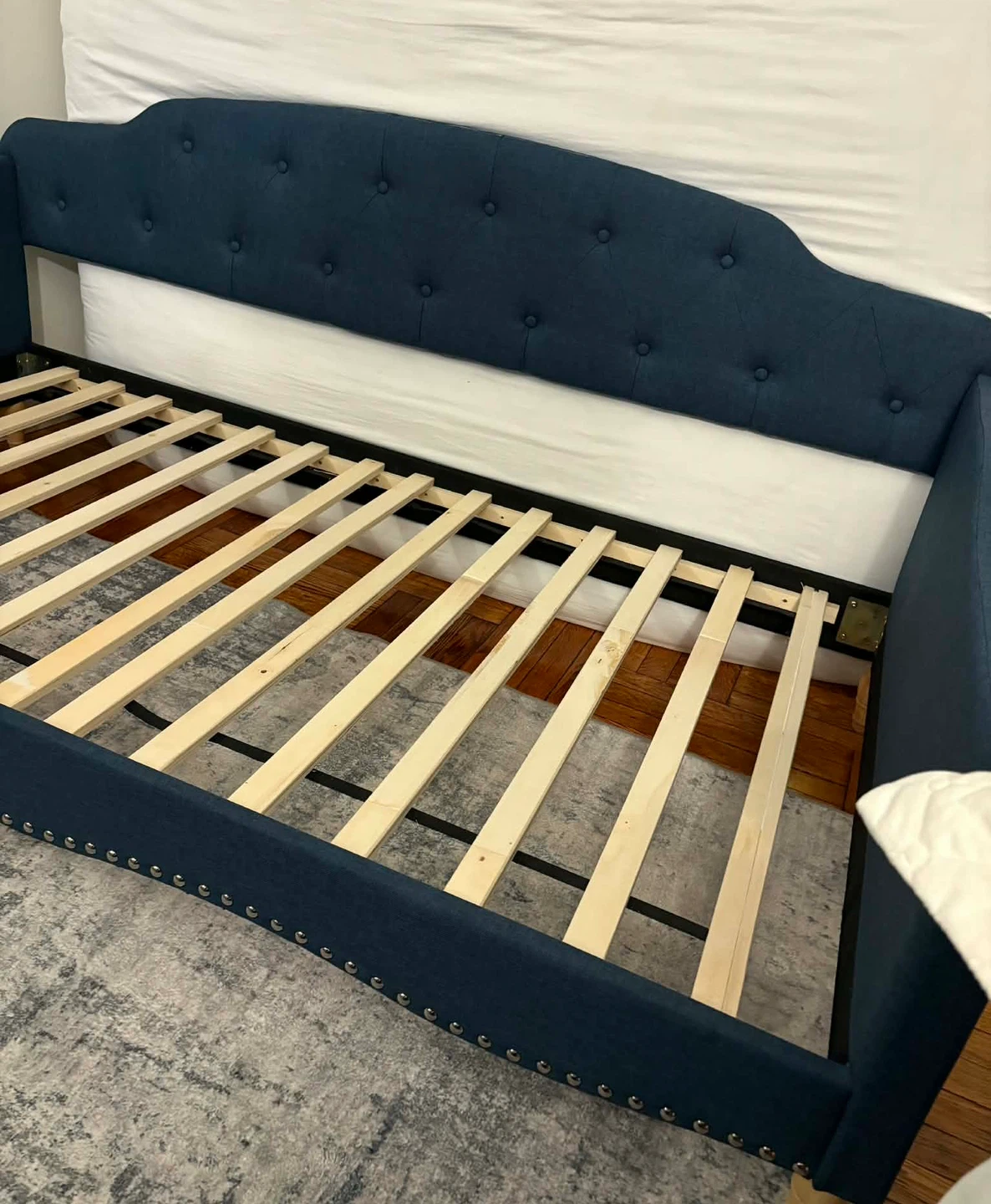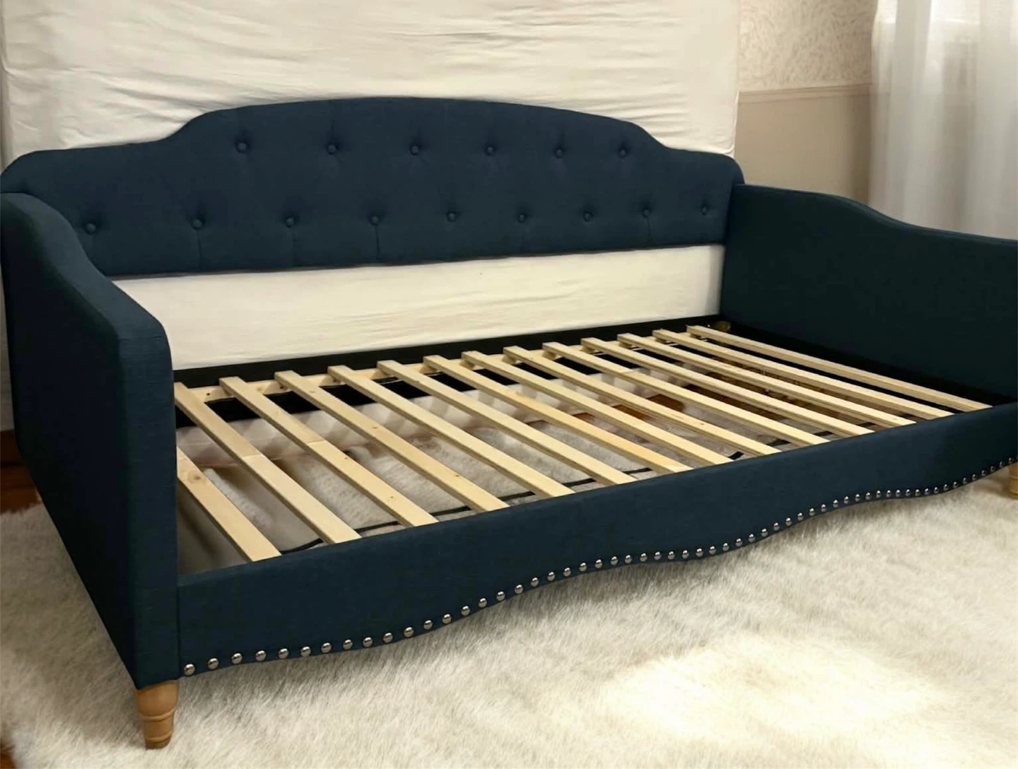 Selling a blue upholstered daybed frame. It has a tufted back and nailhead trim. Perfect for a guest room or living room!New