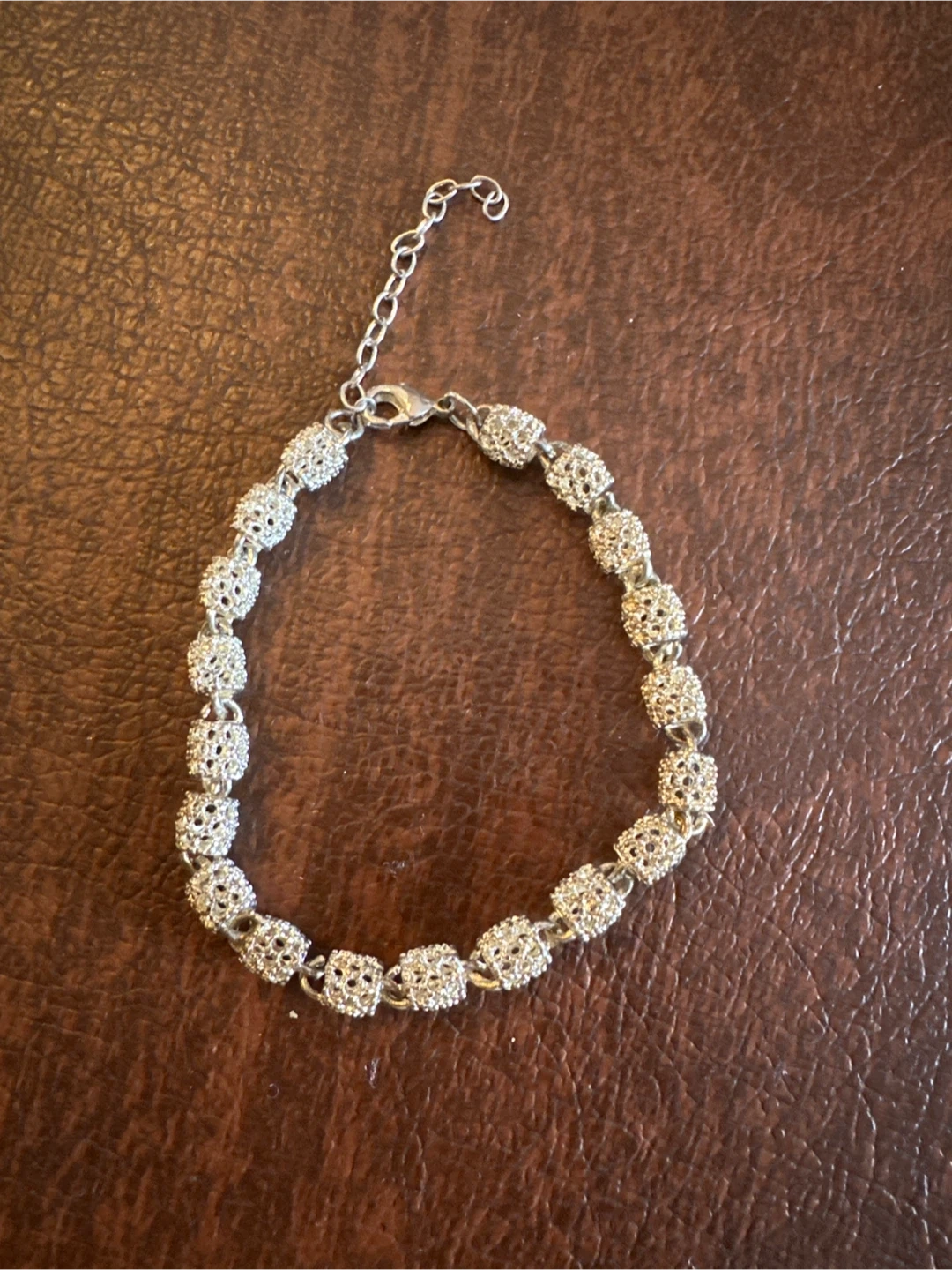 This bracelet features a delicate silver-tone chain with small, decorative charms. It has an adjustable clasp for a comfortable fit. It's suitable for everyday wear or special occasions.