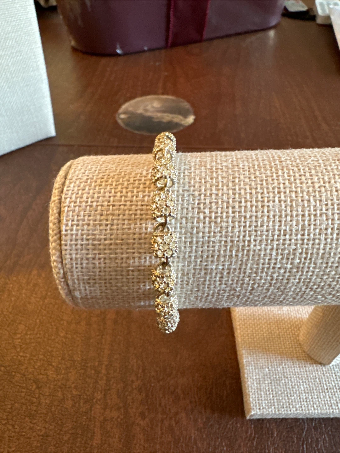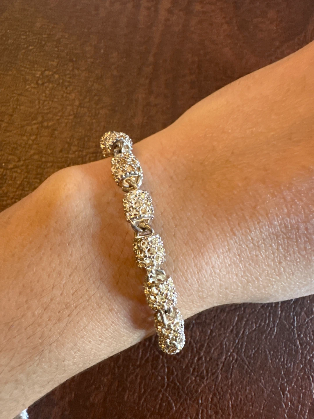 This bracelet features a delicate silver-tone chain with small, decorative charms. It has an adjustable clasp for a comfortable fit. It's suitable for everyday wear or special occasions.