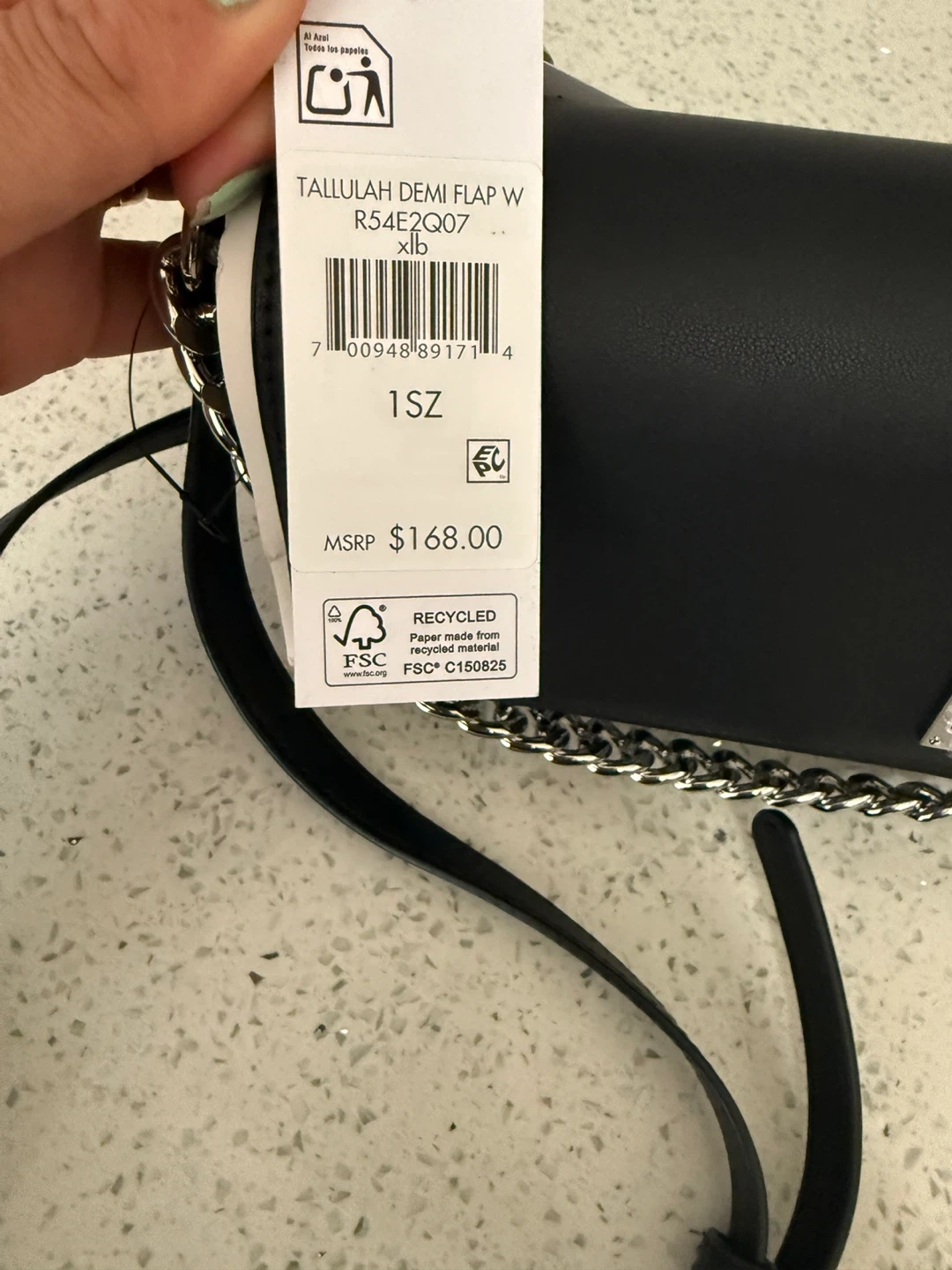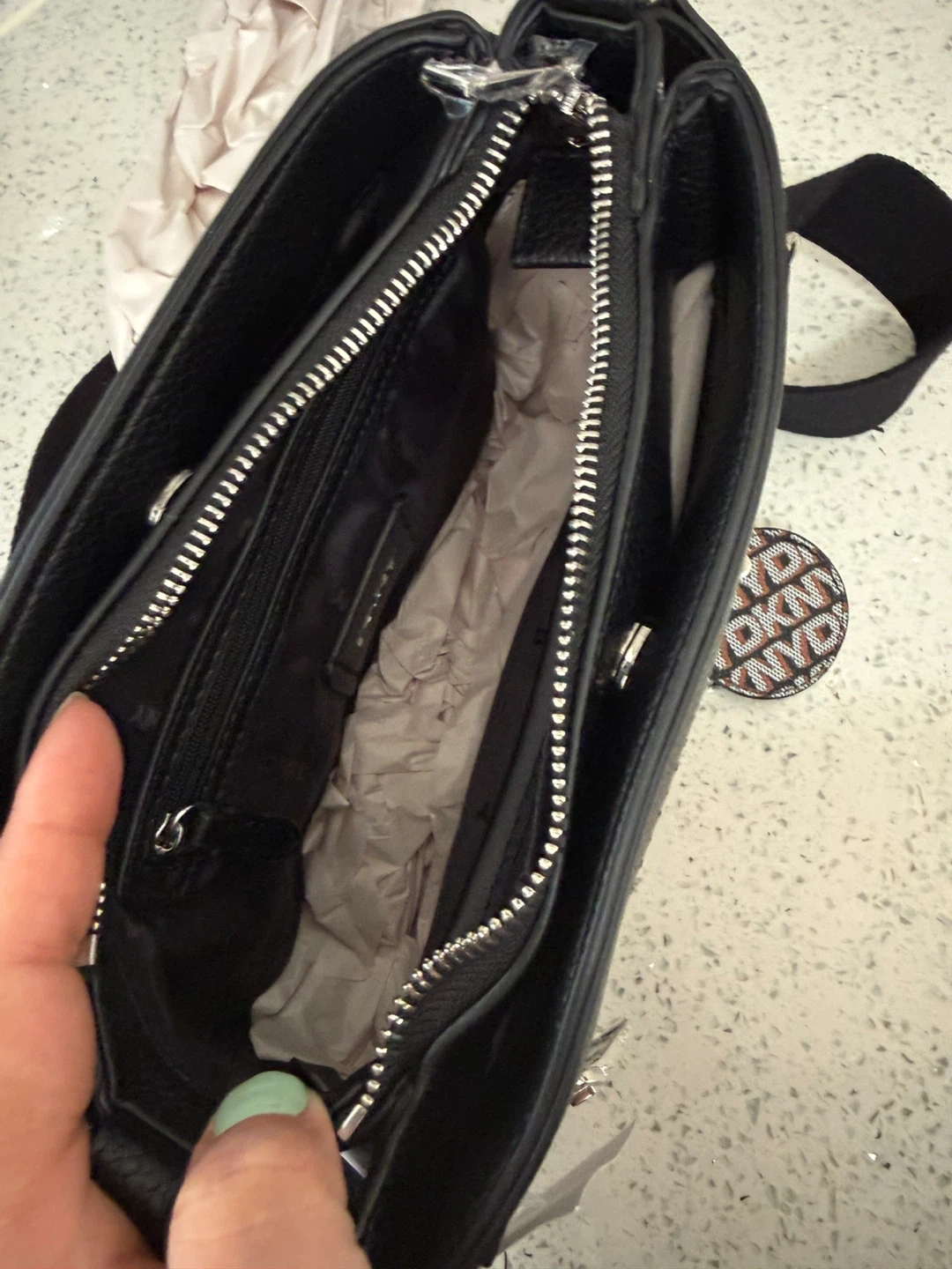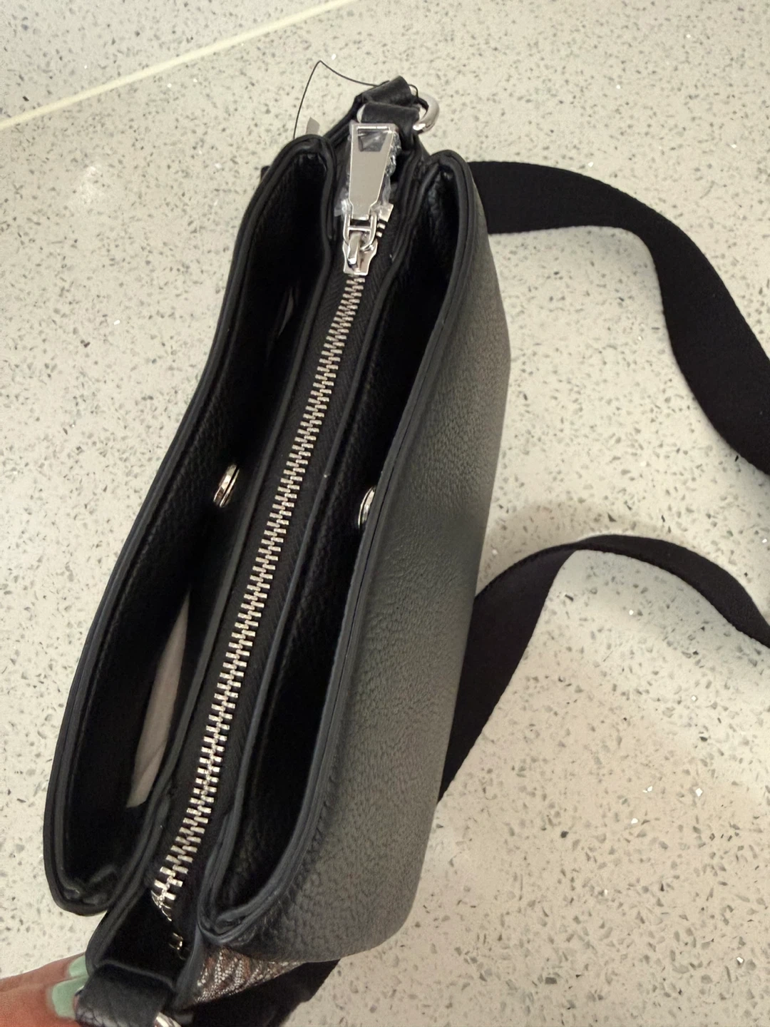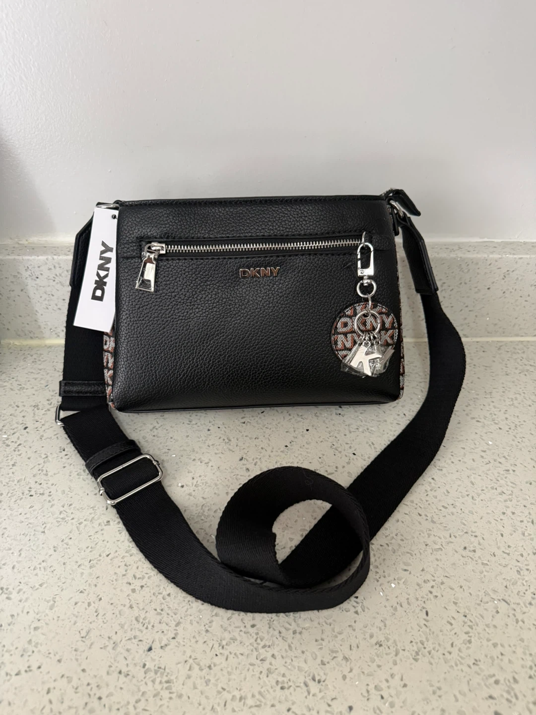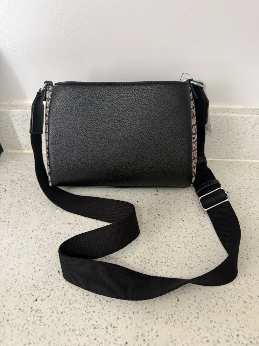Black pebbled leather crossbody bag with adjustable strap. It has a zip-around closure and an interior zip pocket. Includes a decorative charm.