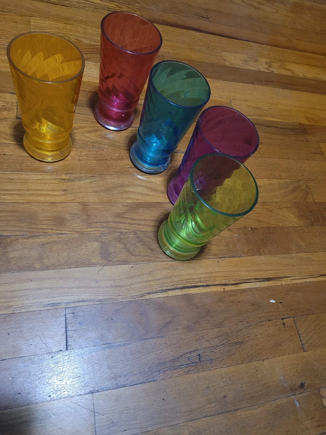 Selling a set of colorful drinking glasses with a fun swirl design! These glasses come in various colors, adding a vibrant touch to your table setting. They're perfect for everyday use or for entertaining guests