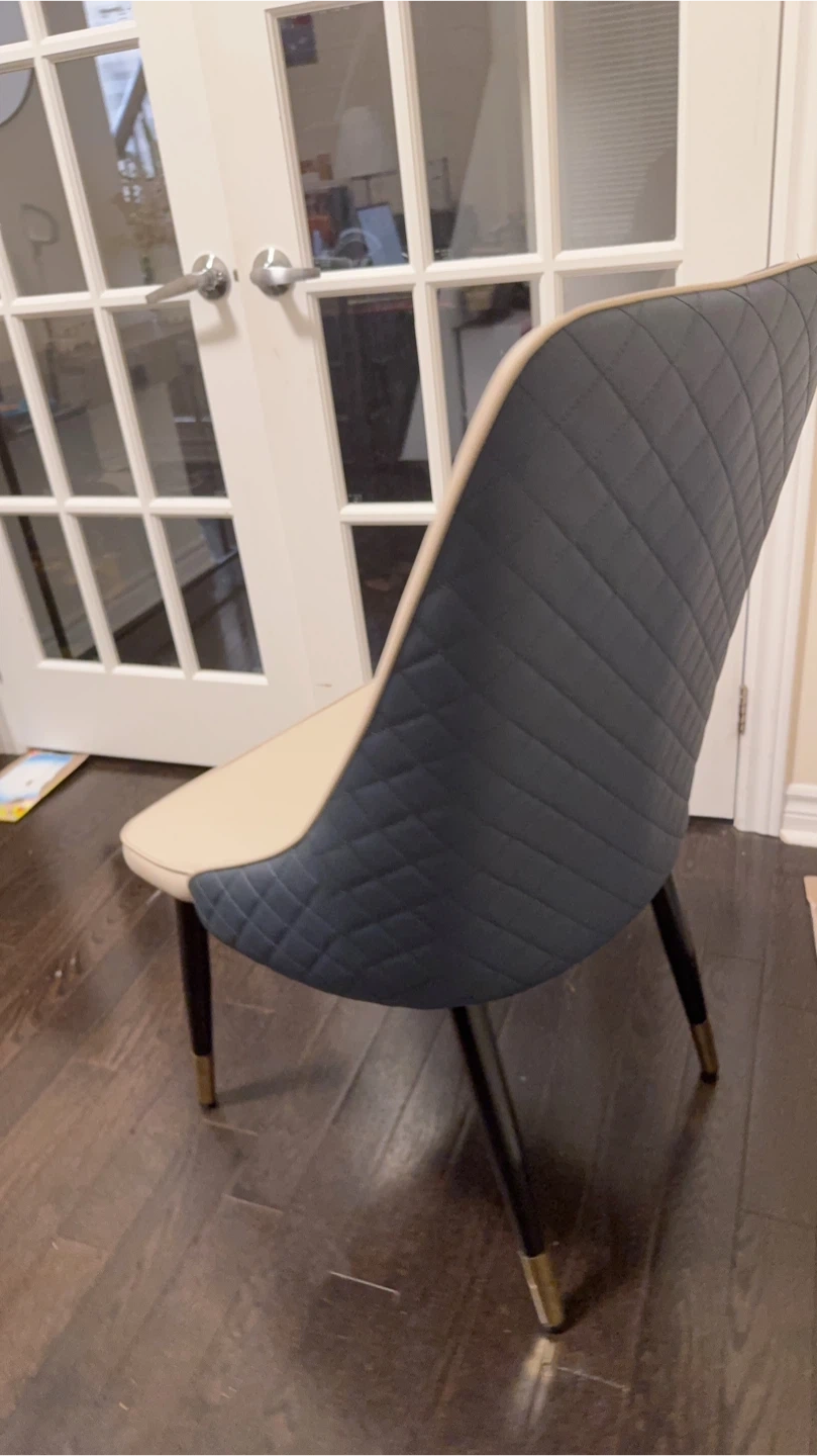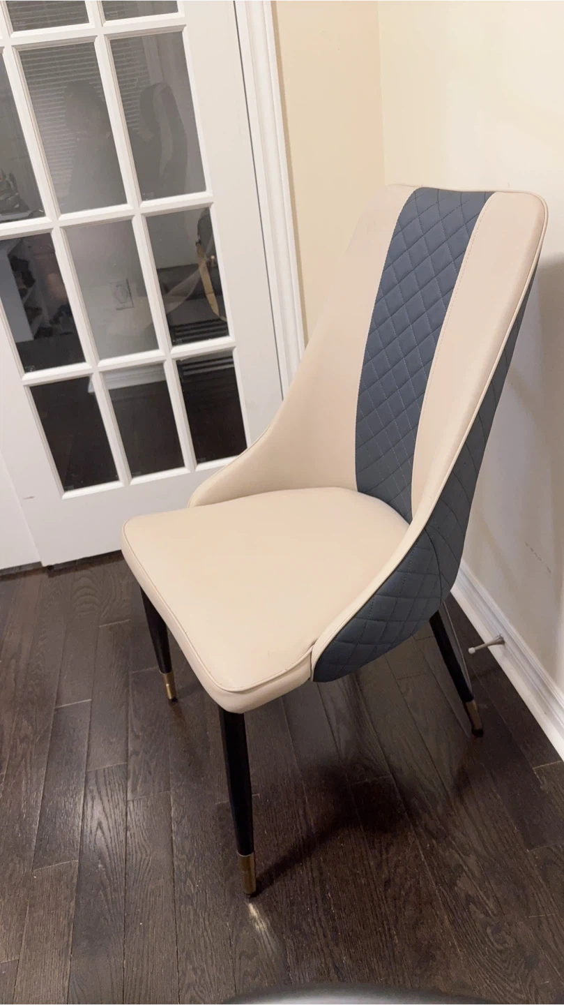 Selling a set of 6 dining chairs. They feature a stylish design with a quilted back and sleek black legs. Perfect for adding a touch of elegance to your dining space!