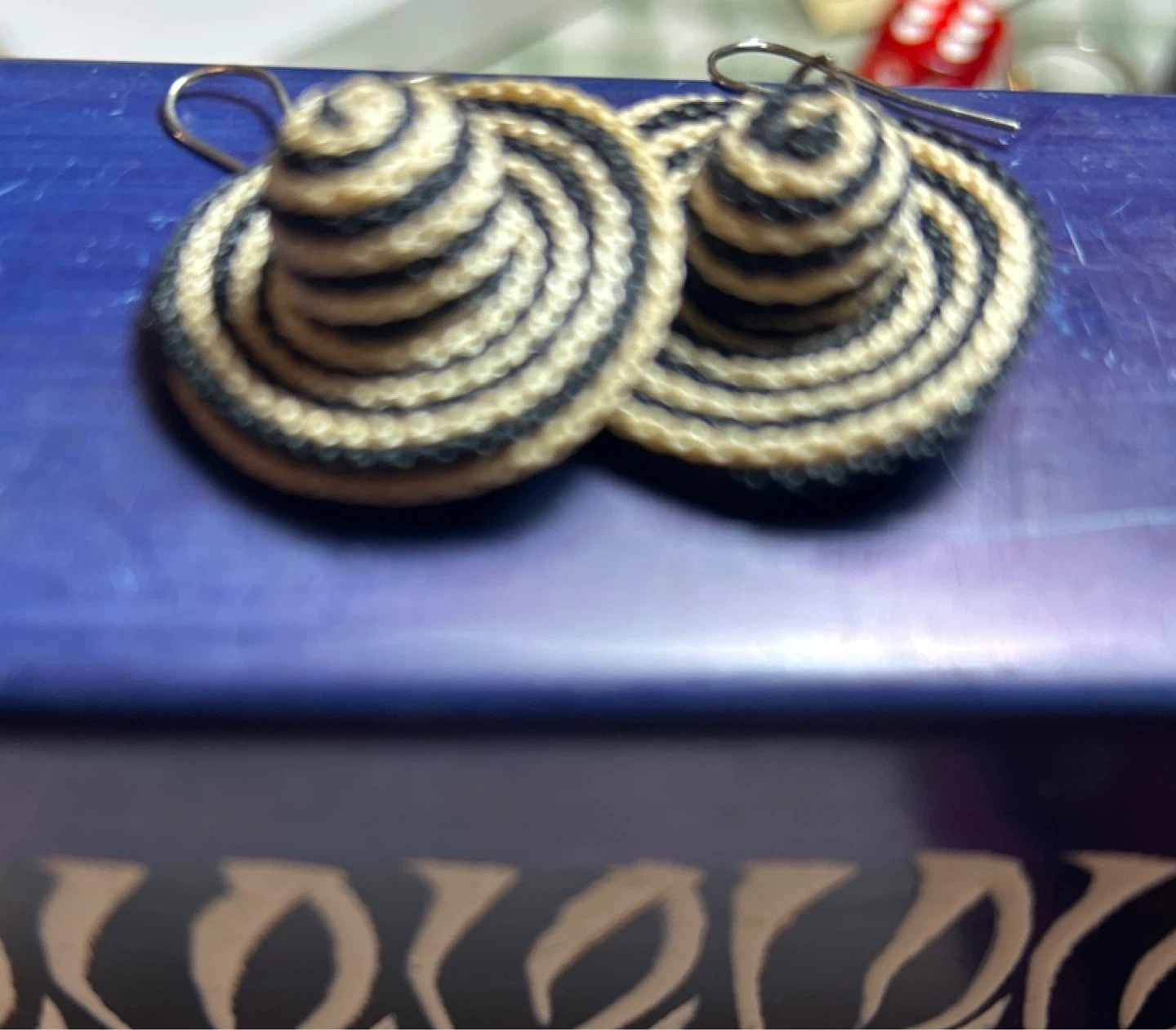 These unique earrings feature a woven spiral design. They have a natural straw-like material in black and beige stripes. The hook closures are silver-tone.