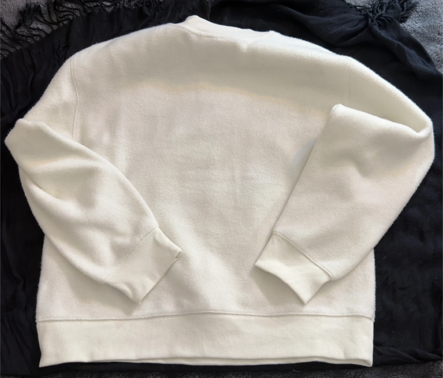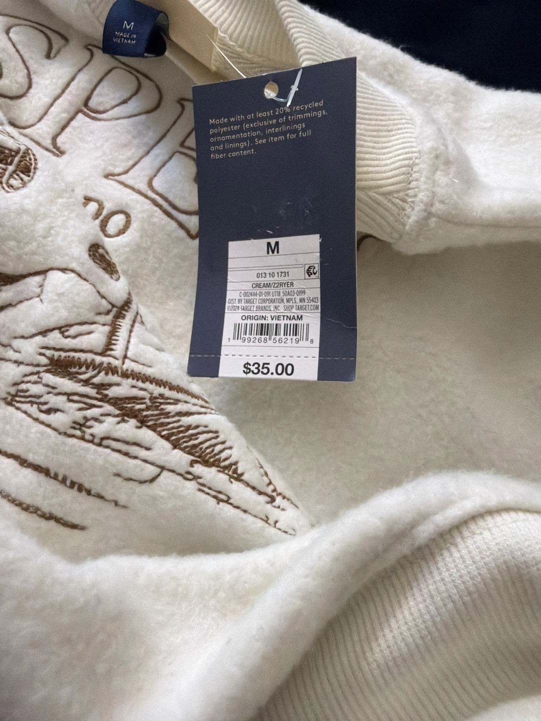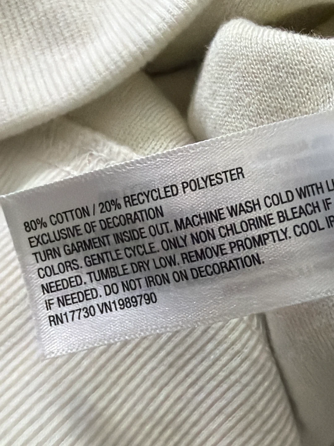 This cream-colored crewneck sweatshirt features a vintage-inspired graphic of Aspen, Colorado with a skier. It's made with 80% cotton and 20% recycled polyester. Machine wash cold inside out.