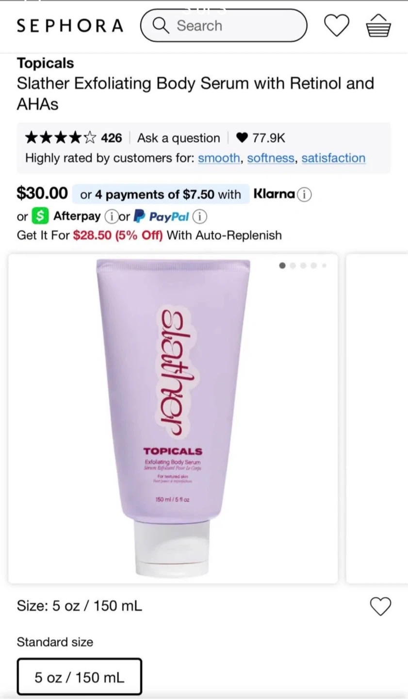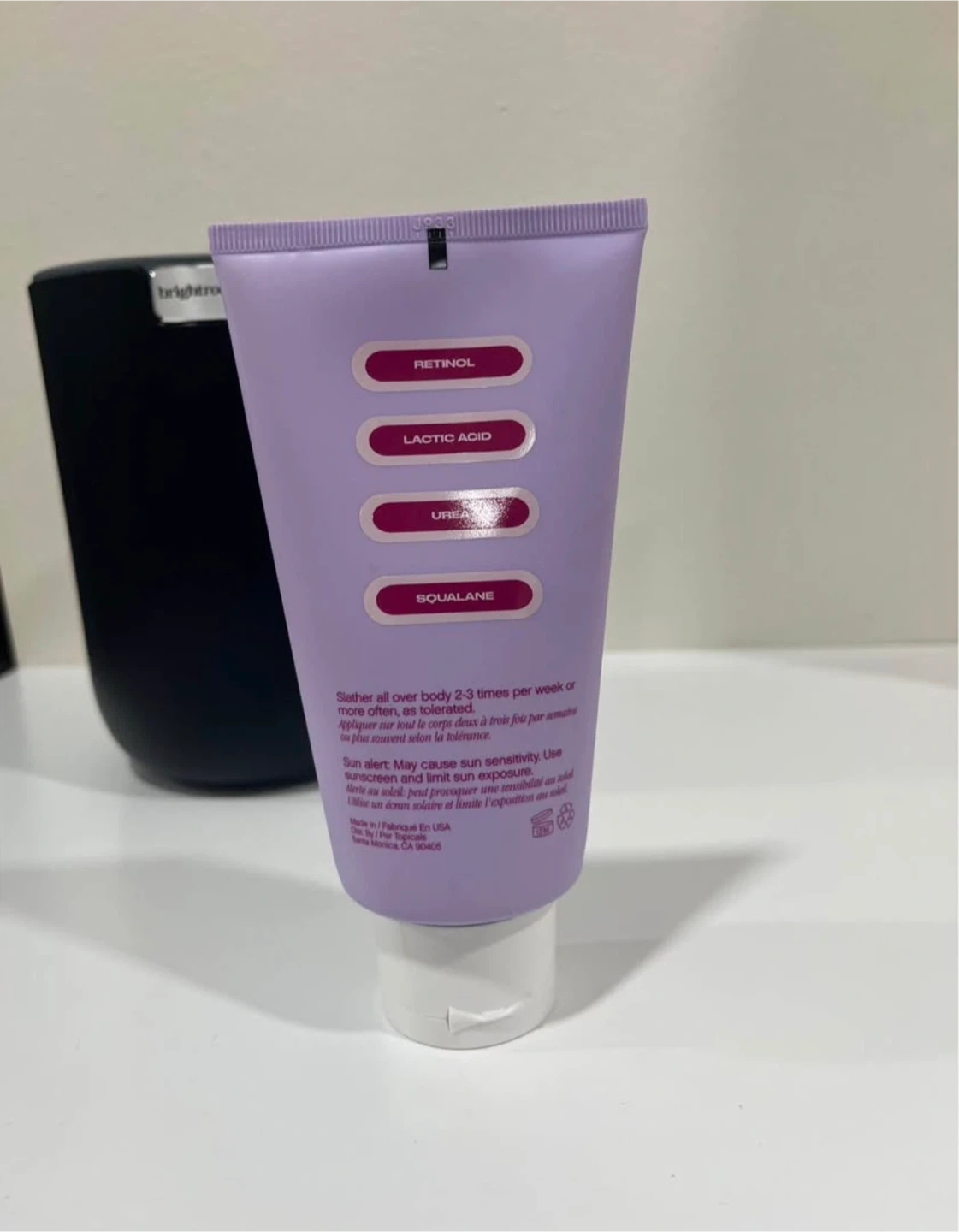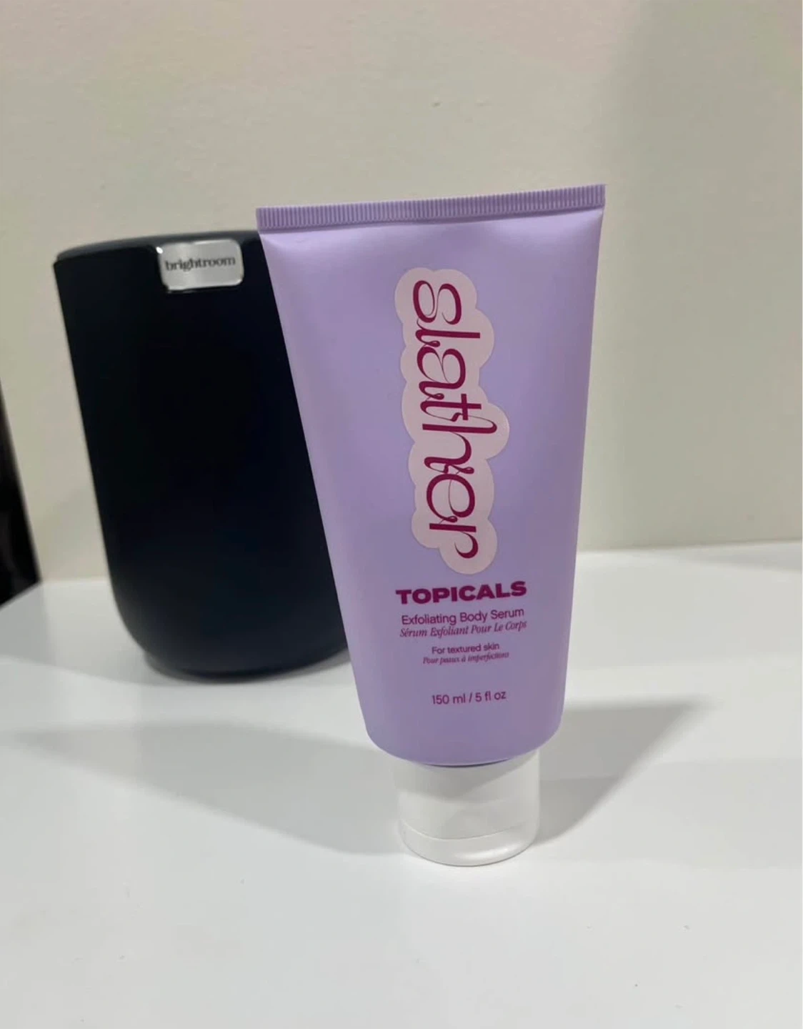 This is Topicals Slather Exfoliating Body Serum with Retinol and AHAs. It's a 5 oz / 150 mL standard size bottle. Contains Retinol, Lactic Acid, Urea, and Squalane.