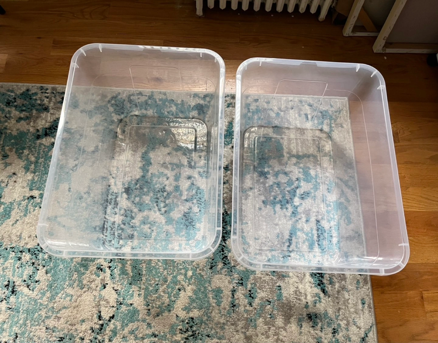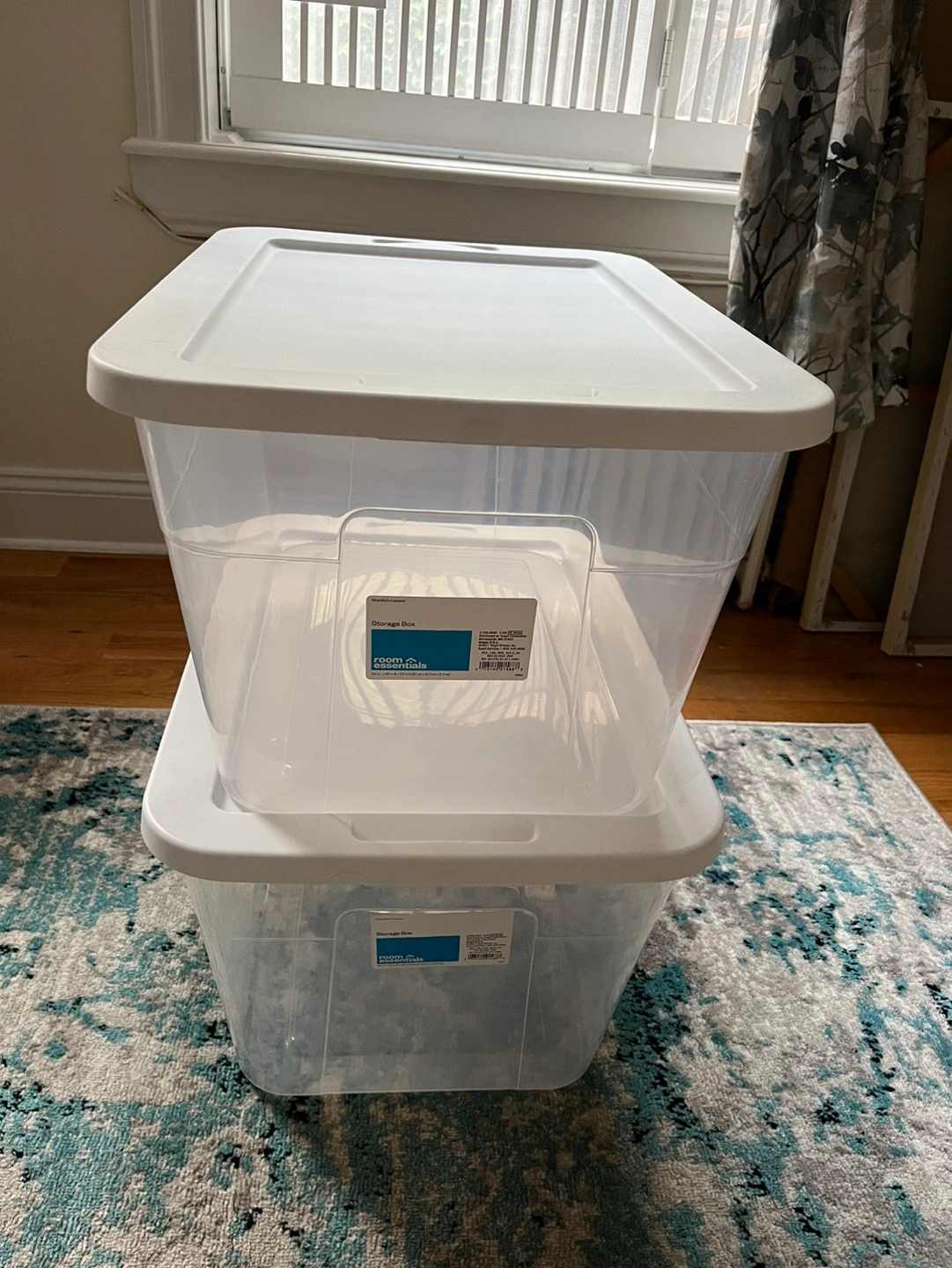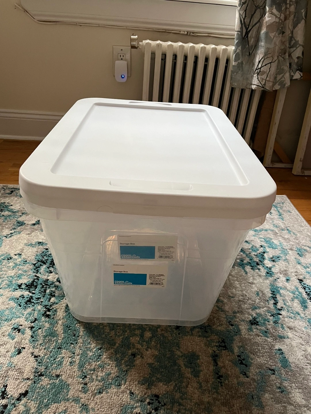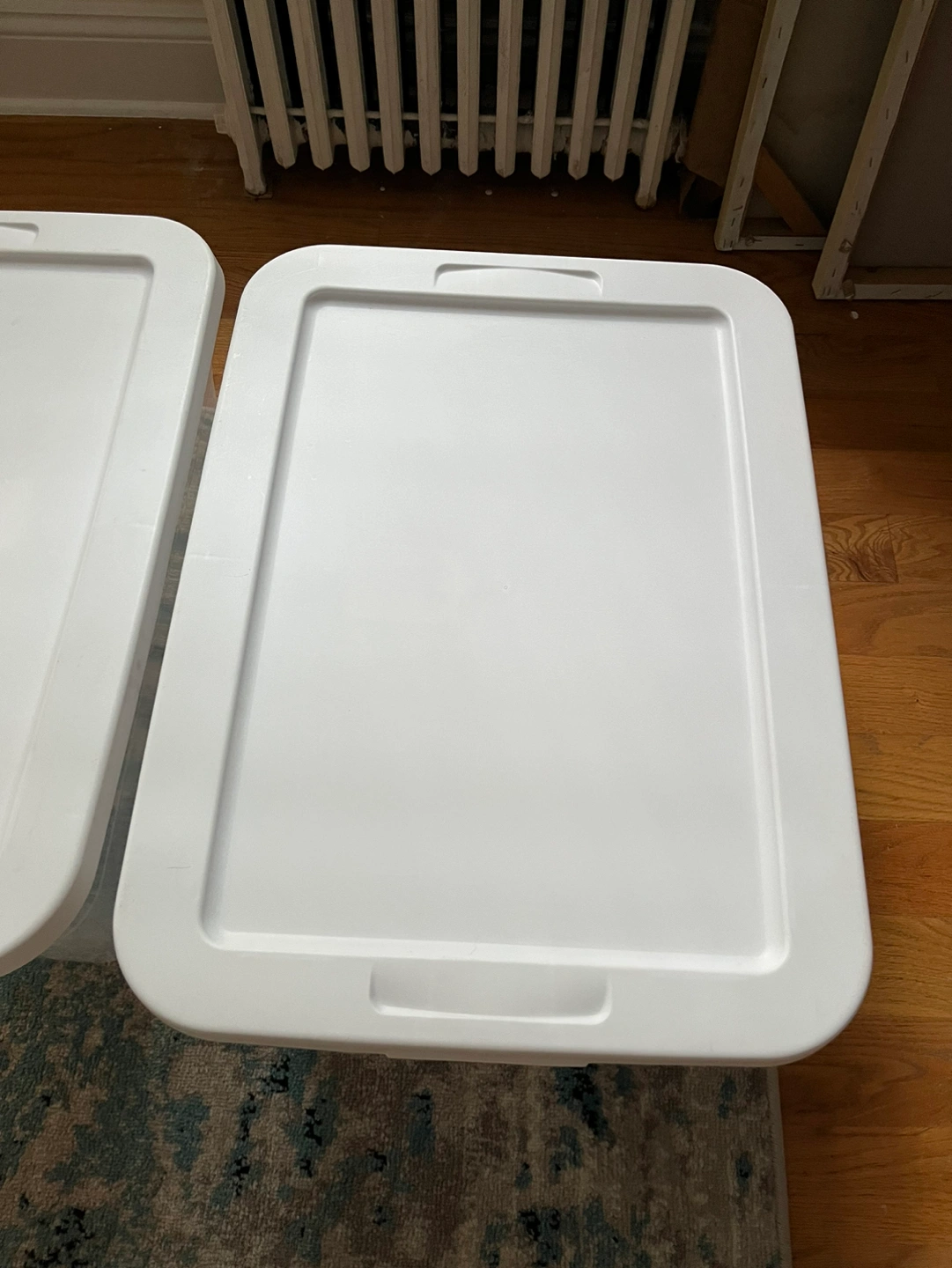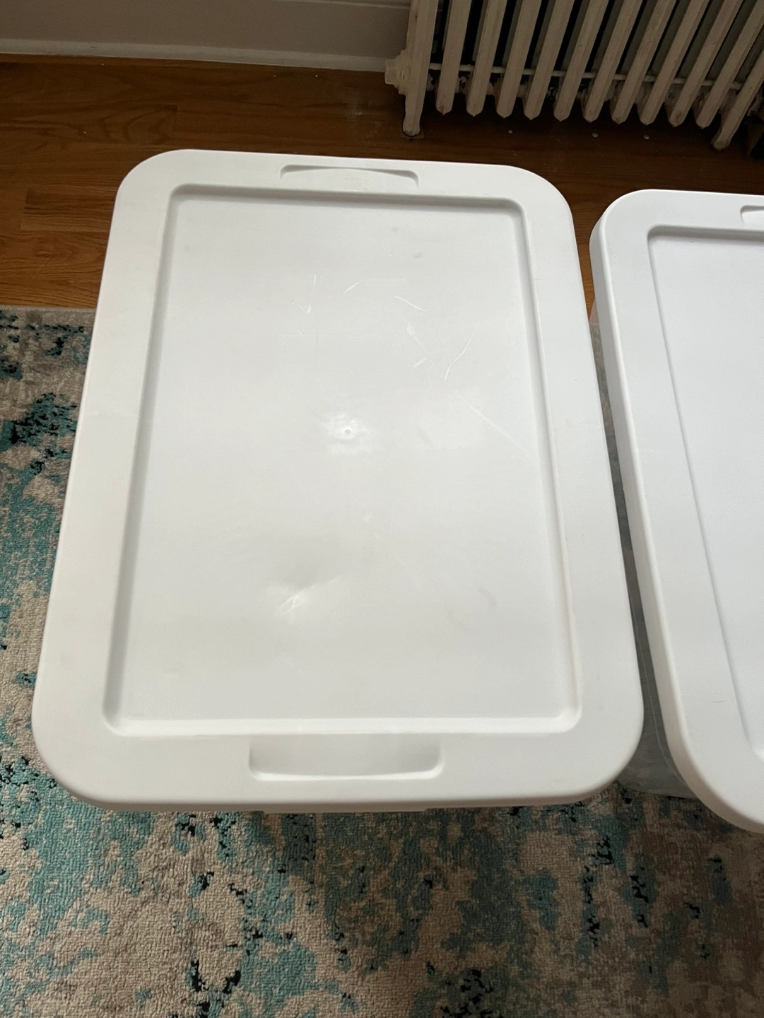 56 qt plastic storage bin with lid. $5 each, 2 available. Lid snaps firmly onto the base and provides a grip for easy lifting. Outside dimensions at the top: 22 1/2" x 16 1/2" x 12 1/2". Interior dimensions at bottom: 18 1/2" x 12 1/2" x 12 1/4".