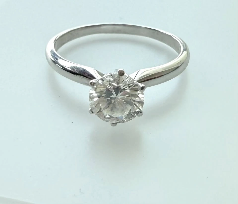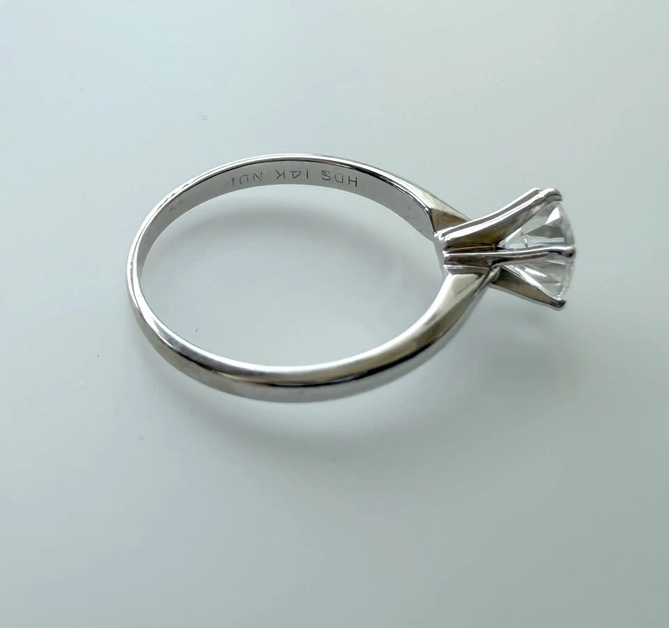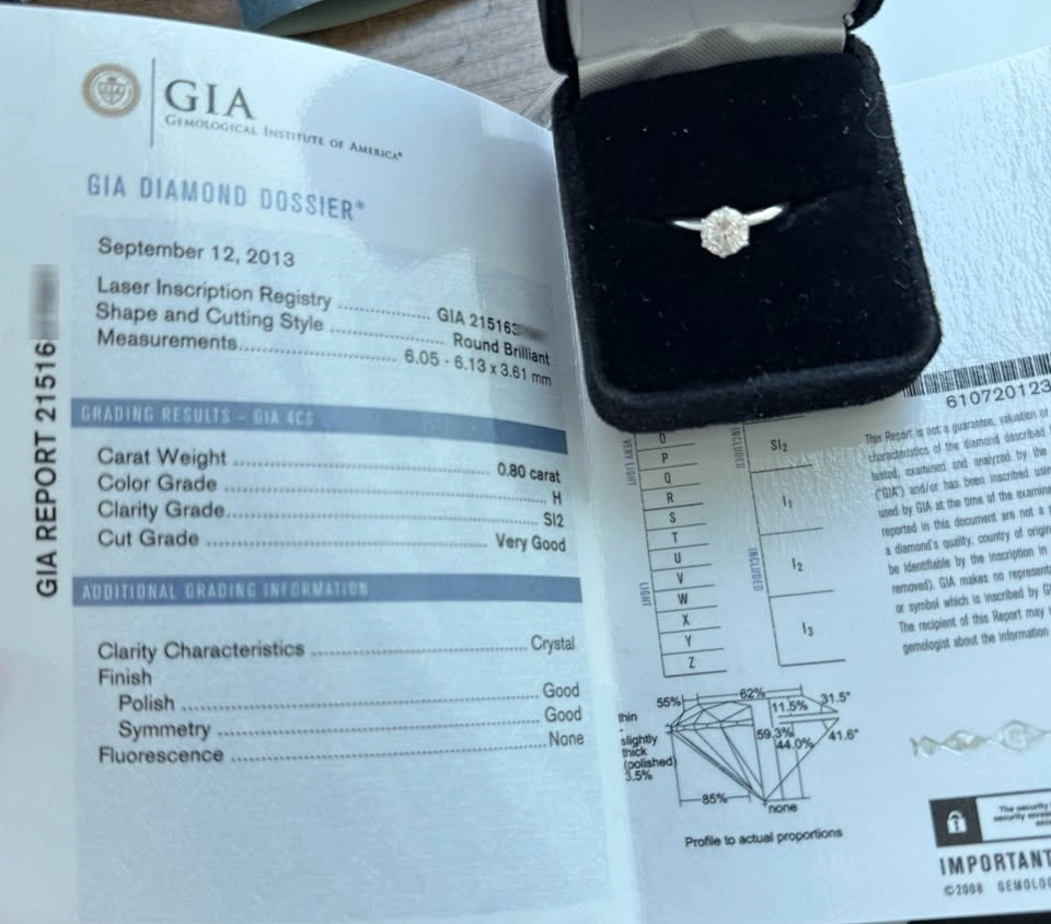This solitaire engagement ring features a 0.80 carat GIA-certified round brilliant cut diamond (cert #21052376*). The diamond measures 6.0 x 6.1 x 3.9 mm and has a laser inscription for verification. It has SI2 clarity, G color, Very Good cut, Good polish and symmetry, and no fluorescence. The ring was appraised at $4,000 by Gwen's Fine Jewelry and is set in durable 14K white gold. It is a size 6.5.