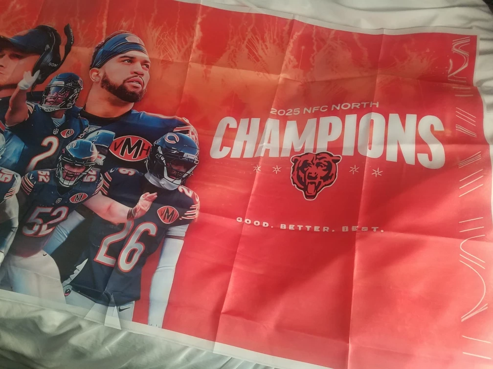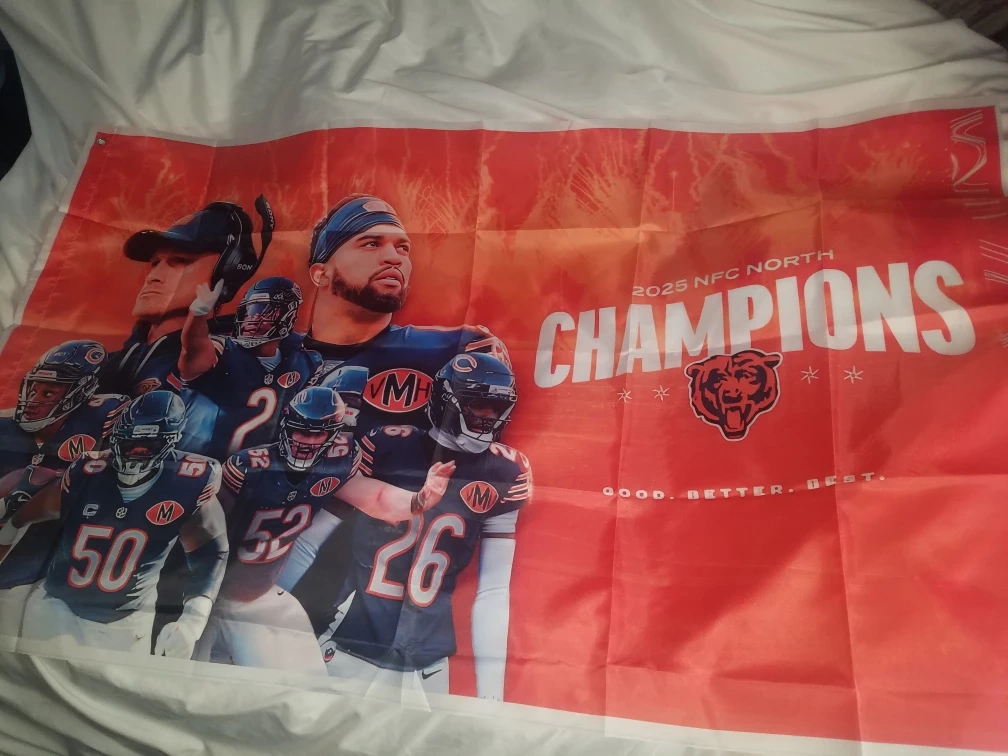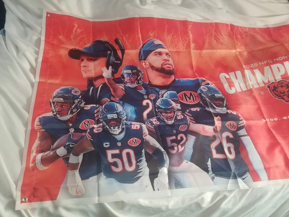This flag celebrates the Chicago Bears' 2025 NFC North Championship win. It features a vibrant design with players and the championship text. Perfect for any dedicated Bears fan! brand new 10 available $30 each