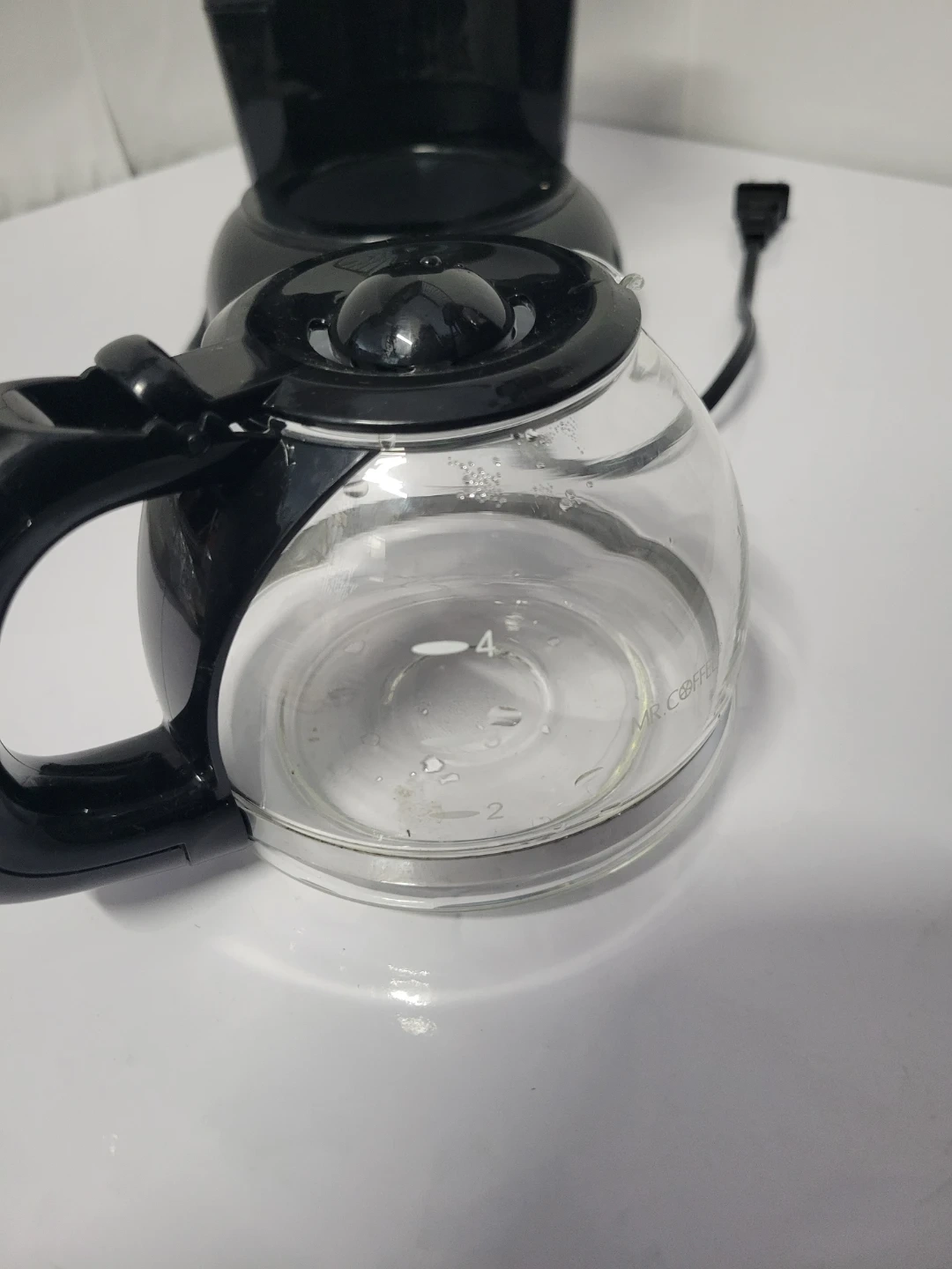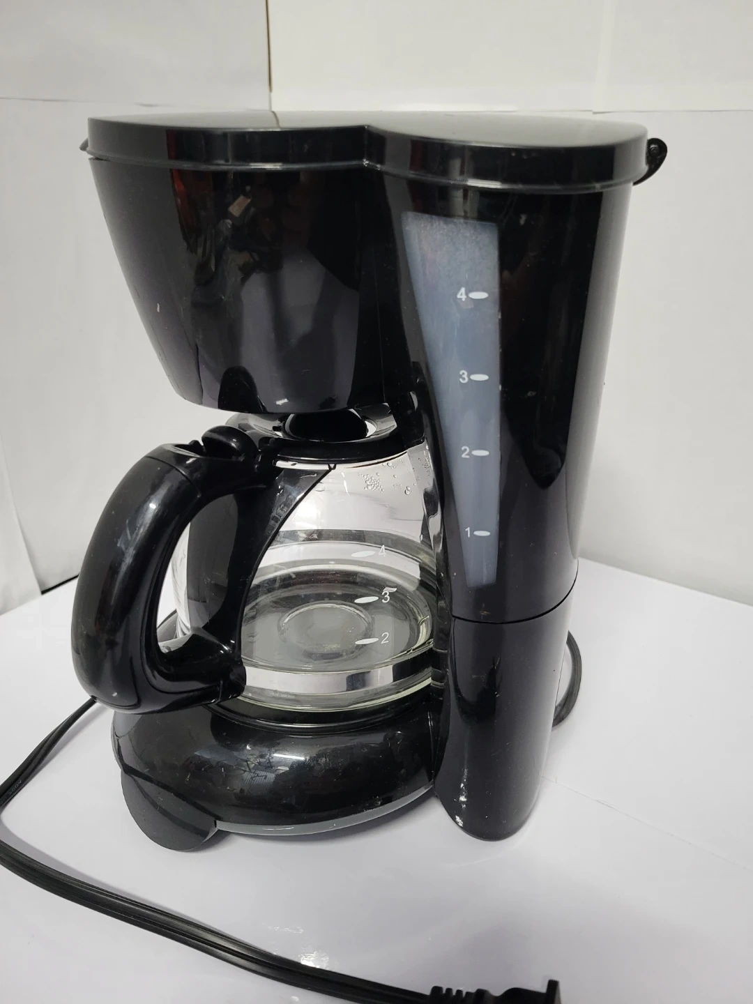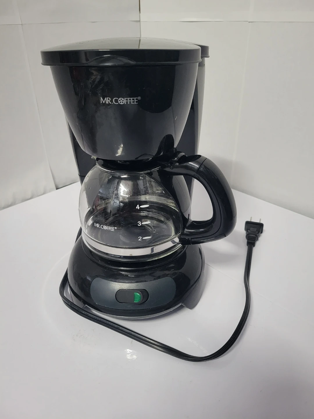 This is a Mr. Coffee 4-cup coffee maker. It features a glass carafe with water level markings. The coffee maker is black and has a simple on/off switch. 600 watts, 120 volt operation.
