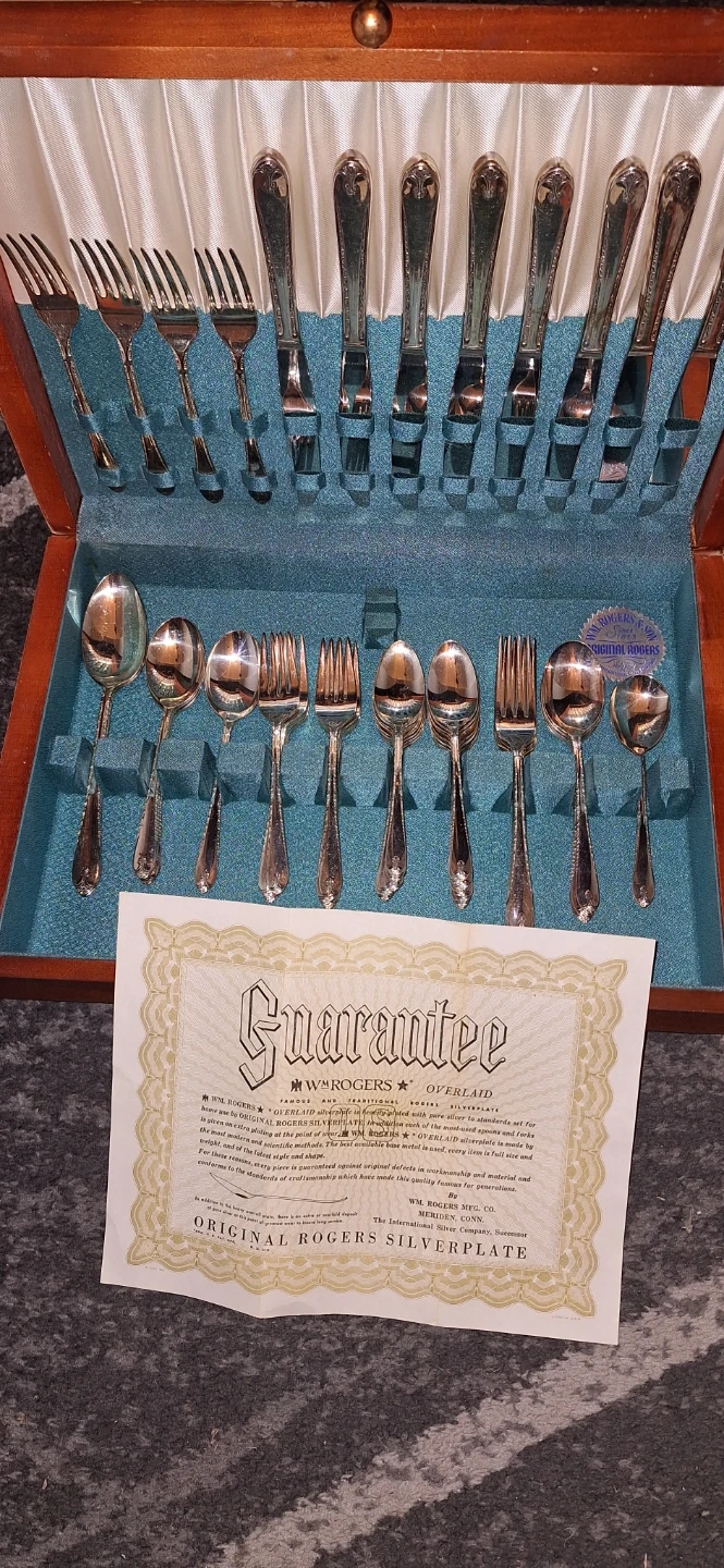 This set features WM Rogers Overland Original Rogers Silverplate flatware. It includes multiple forks, knives, and spoons housed in a wooden case. The silverplate construction ensures a durable and elegant finish for your dining needs.